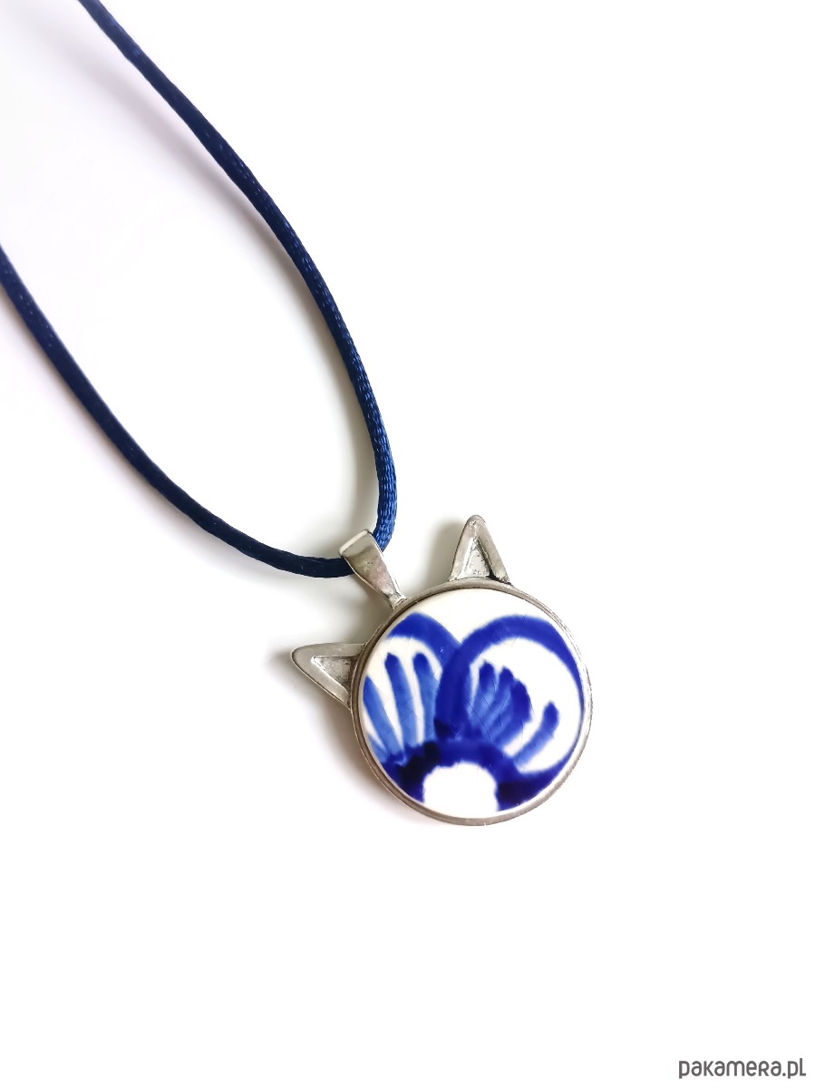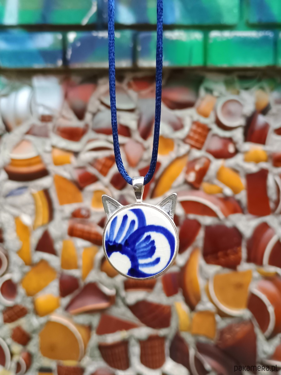 Historia fajansu włocławskiego sięga 1873 roku. Zakładów było kilka, zmieniali się właściciele i lokalizacje. Produkcja najbardziej rozwinęła się po II WŚ, kiedy w miejscowych zakładach powstawał nie tylko fajans, ale również porcelit i porcelana. Zróżnicowane było także wzornictwo - produkowano nie tylko naczynia, ale również elementy wyposażenia wnętrz (lampy, świeczniki, żyrandole). Mimo tej różnorodności, najbardziej rozpoznawalnym wyrobem z Włocławka jest talerz w ręcznie malowane kobaltowe kwiaty (z takich najchętniej korzystam :). I mimo, że najdłużej działająca fabryka zakończyła działalność w 1991 roku, dzięki lokalnym inicjatywom produkcja fajansu została wznowiona i trwa do dziś! Oto naszyjnik, który wykonałam z fragmentu fajansu włocławskiego w kobaltowe wzory. Fragment oszlifowałam w okrągły kształt i osadziłam w metalowej bazie z kocimi uszami w kolorze srebrnym. Ceramikę zeszlifowałam również z grubości - jest cieńsza niż pierwotnie, dzięki czemu wisior nie jest masywny. Brzegi pokryłam lakierem, co sprawia, że nie brudzą się i nie chłoną wilgoci. Do zawieszki dobrałam satynowy sznureczek w kolorze granatowym. Średnica elementu ceramicznego: 26 mm. Długość sznureczka w całości: ok. 80 cm (naszyjnik zakłada się przez głowę). Upcykling - nie reprodukuję wykorzystywanych wzorów, niczego nie domalowuję - wykorzystuję wyłącznie oryginalne naczynia i motywy, które się na nich znajdują. Tym samym, stłuczce z odzysku nadaję nowe życie.