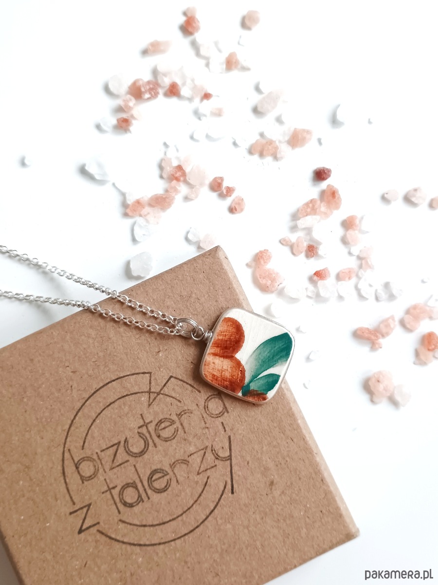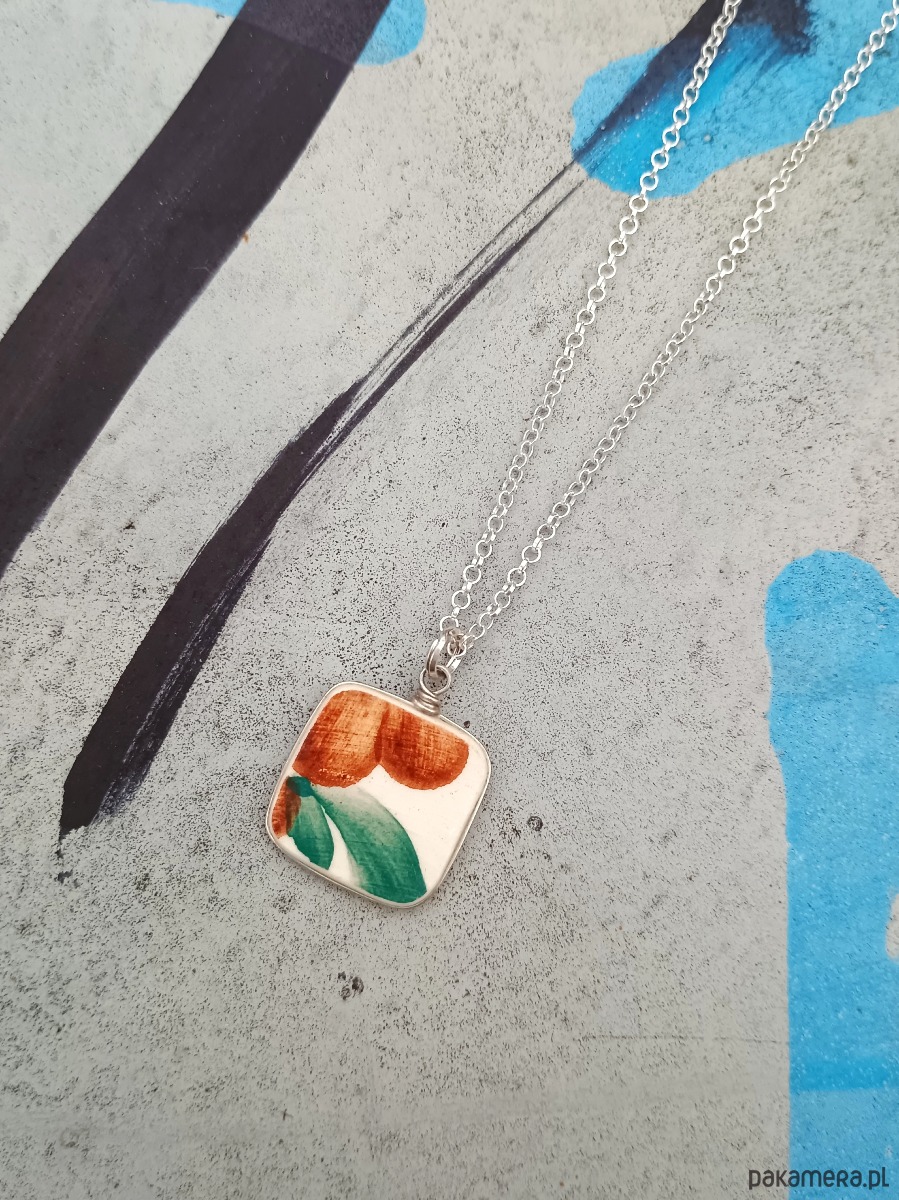 Historia fajansu włocławskiego sięga 1873 roku. Zakładów było kilka, zmieniali się właściciele i lokalizacje. Produkcja najbardziej rozwinęła się po II WŚ, kiedy w miejscowych zakładach powstawał nie tylko fajans, ale również porcelit i porcelana. Zróżnicowane było także wzornictwo - produkowano nie tylko naczynia, ale również elementy wyposażenia wnętrz (lampy, świeczniki, żyrandole). Mimo tej różnorodności, najbardziej rozpoznawalnym wyrobem z Włocławka jest talerz w ręcznie malowane kobaltowe kwiaty (z takich najchętniej korzystam :). I mimo, że najdłużej działająca fabryka zakończyła działalność w 1991 roku, dzięki lokalnym inicjatywom produkcja fajansu została wznowiona i trwa do dziś! Oto naszyjnik, który wykonałam z fragmentu fajansu włocławskiego, ręcznie malowanego w kolorowe kwiaty. Kawałek stłuczonej filiżanki oszlifowałam w kwadratowy kształt, oprawiłam w drucik i zamocowałam na srebrnym łańcuszku (srebro 925). Ceramikę zeszlifowałam również z grubości - jest cieńsza niż pierwotnie, dzięki czemu zawieszka nie jest masywna. Brzegi i tył pokryłam lakierem, co sprawia, że nie brudzą się i nie chłoną wilgoci. Wymiary zawieszki ceramicznej: 16 x 16 mm. Długość łańcuszka w całości: 45 cm. Unikat- każdy z moich wyrobów występuje w jednym egzemplarzu. Upcykling - nie reprodukuję wykorzystywanych wzorów, niczego nie domalowuję - wykorzystuję wyłącznie oryginalne naczynia i motywy, które się na nich znajdują. Tym samym, stłuczce z odzysku nadaję nowe życie.