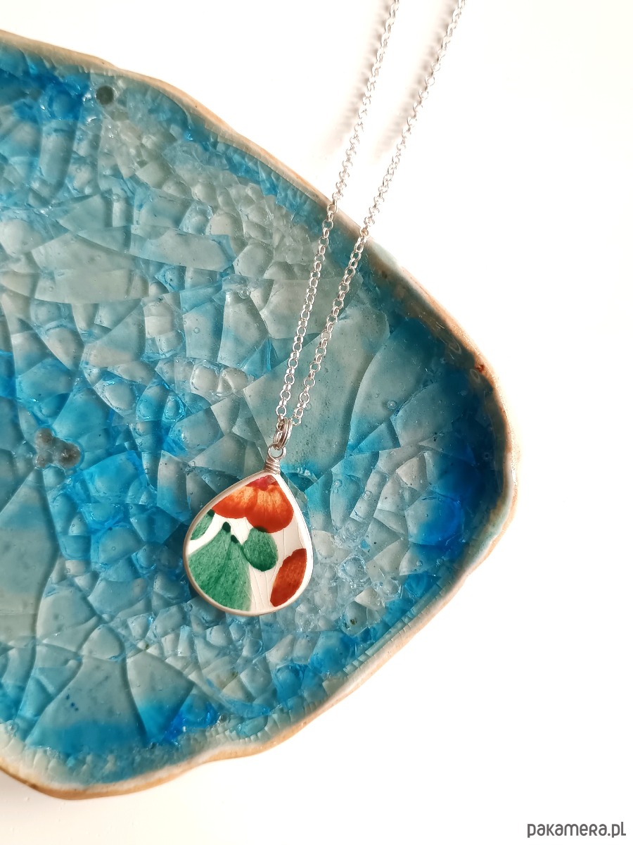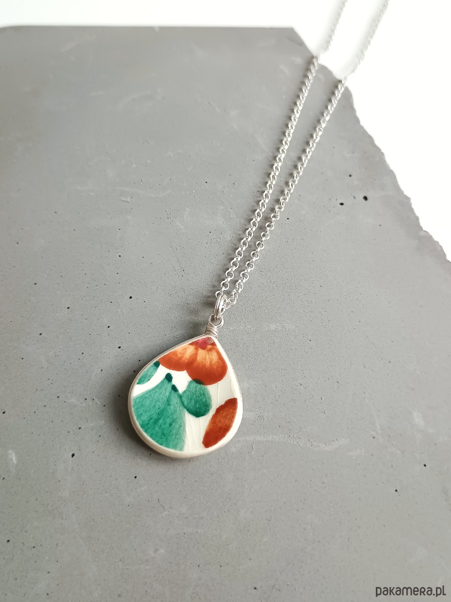 Historia fajansu włocławskiego sięga 1873 roku. Zakładów było kilka, zmieniali się właściciele i lokalizacje. Produkcja najbardziej rozwinęła się po II WŚ, kiedy w miejscowych zakładach powstawał nie tylko fajans, ale również porcelit i porcelana. Zróżnicowane było także wzornictwo - produkowano nie tylko naczynia, ale również elementy wyposażenia wnętrz (lampy, świeczniki, żyrandole). Mimo tej różnorodności, najbardziej rozpoznawalnym wyrobem z Włocławka jest talerz w ręcznie malowane kobaltowe kwiaty (z takich najchętniej korzystam :). I mimo, że najdłużej działająca fabryka zakończyła działalność w 1991 roku, dzięki lokalnym inicjatywom produkcja fajansu została wznowiona i trwa do dziś! Oto naszyjnik, który wykonałam z fragmentu fajansu włocławskiego, ręcznie malowanego w kolorowe kwiaty. Kawałek stłuczonej filiżanki oszlifowałam w kształt łezki, oprawiłam w drucik i zamocowałam na srebrnym łańcuszku (srebro 925). Ceramikę zeszlifowałam również z grubości - jest cieńsza niż pierwotnie, dzięki czemu zawieszka nie jest masywna. Brzegi i tył pokryłam lakierem, co sprawia, że nie brudzą się i nie chłoną wilgoci. Wymiary zawieszki ceramicznej: 19 x 21 mm. Długość łańcuszka w całości: 45 cm. Unikat- każdy z moich wyrobów występuje w jednym egzemplarzu. Upcykling - nie reprodukuję wykorzystywanych wzorów, niczego nie domalowuję - wykorzystuję wyłącznie oryginalne naczynia i motywy, które się na nich znajdują. Tym samym, stłuczce z odzysku nadaję nowe życie.