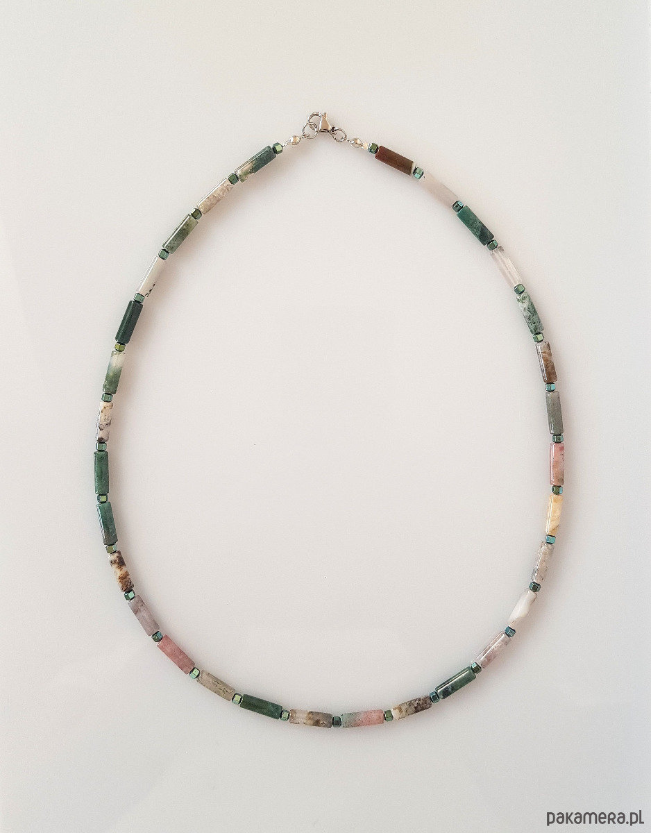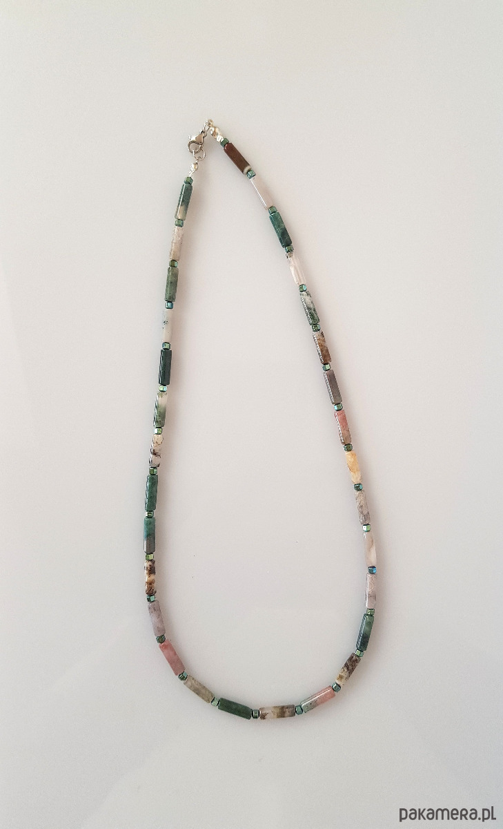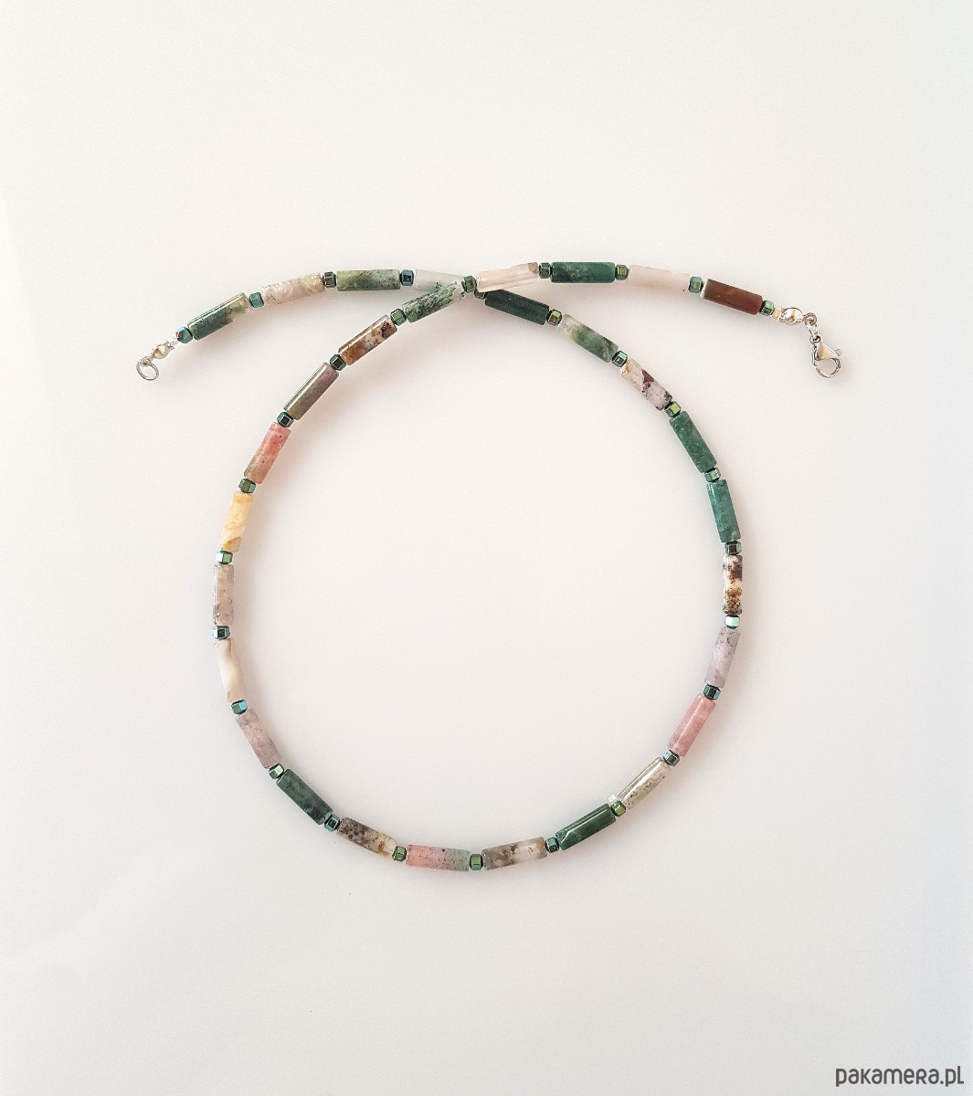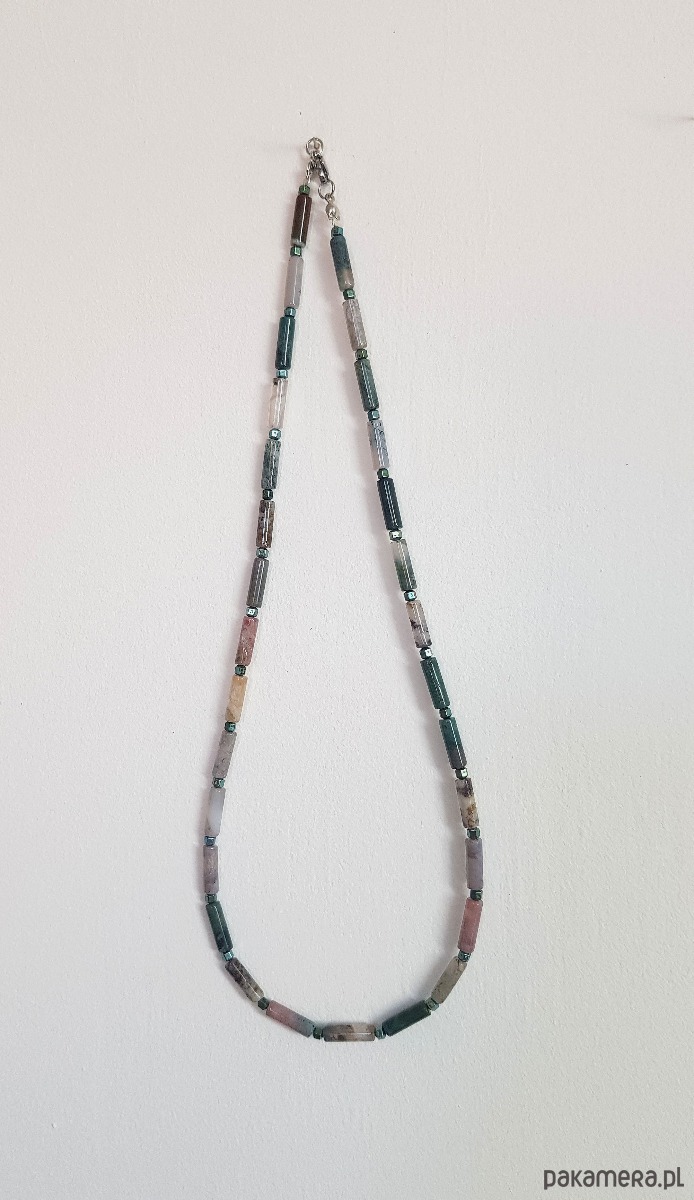 Agat indyjski w zachwycających kolorach ziemi i dodający industrialnego charakteru jasno zielony błyszczący hematyt.