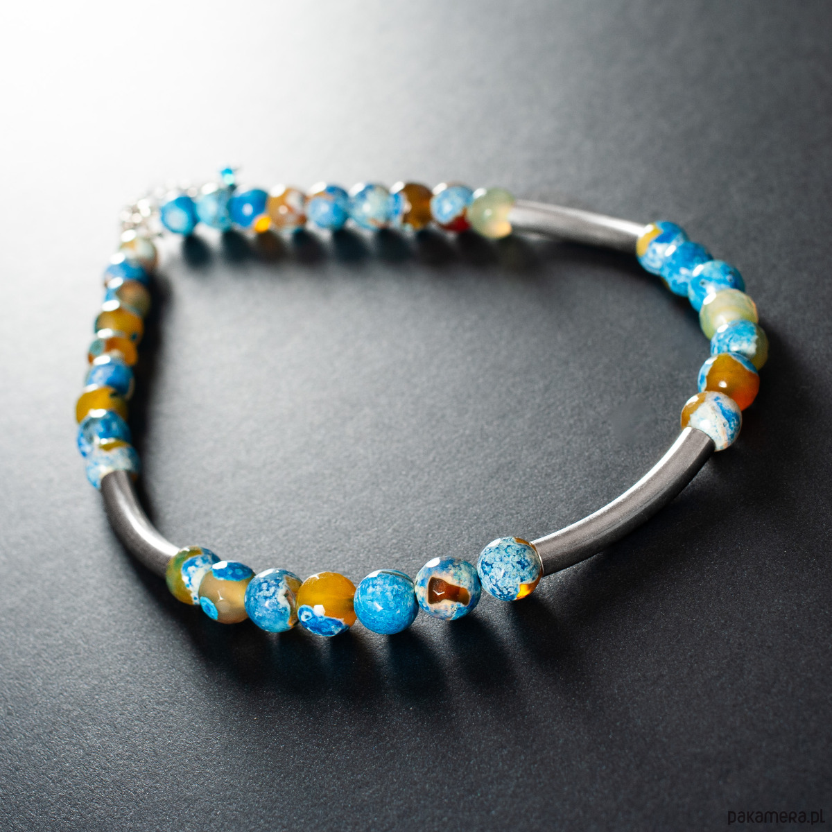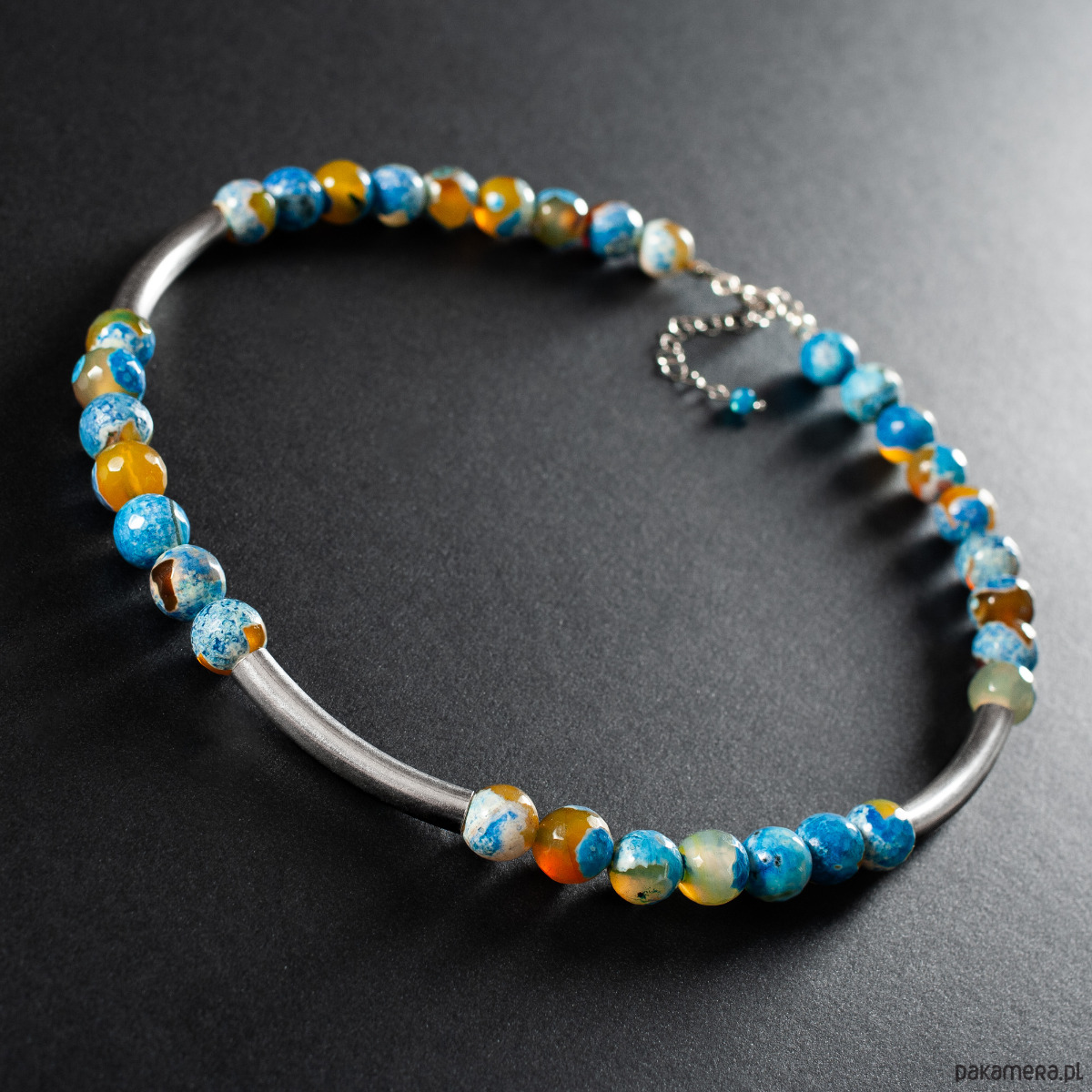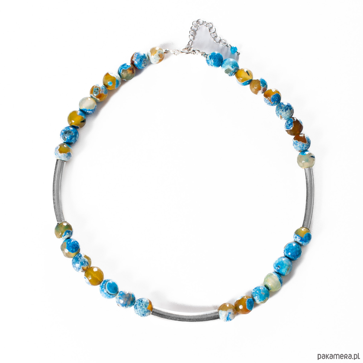 Naszyjnik z kolekcji ŁĄKA z przepięknymi, zachwycającymi kolorystyką agatami ognistymi. Błękitne, cytrynowe, białe kolory kamieni kontrastują z grubymi rurkami z galwanizowanego mosiądzu. Długość naszyjnika 45 cm + 5 cm . Skład: kamienie naturalne 72%, mosiądz podwójnie galwanizowany 23%, srebro 925 2%, stal szlachetna 3%. Naszyjnik wykonany ręcznie według własnego projektu w pracowni Anillo. Biżuterię przesyłamy w eleganckim kartoniku.