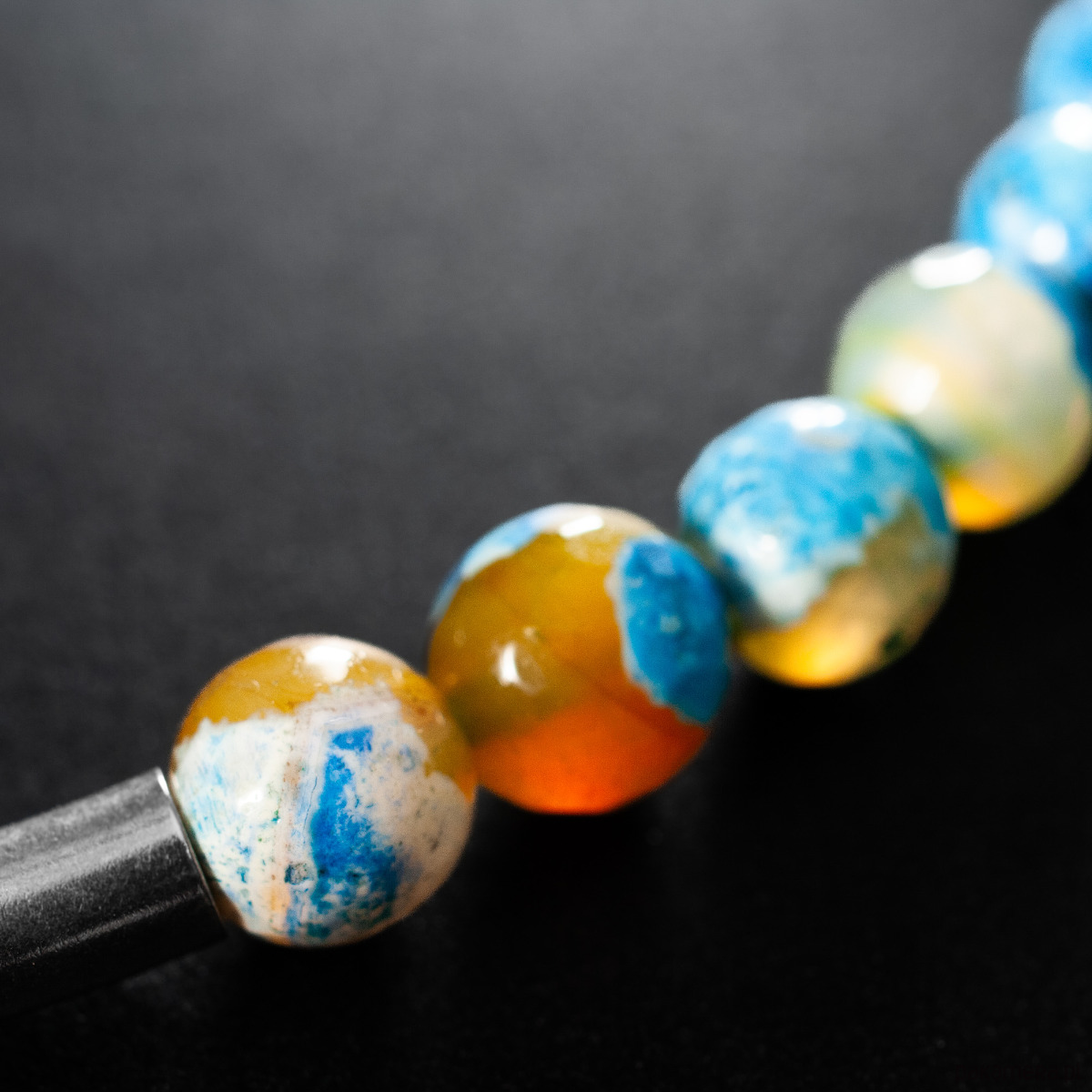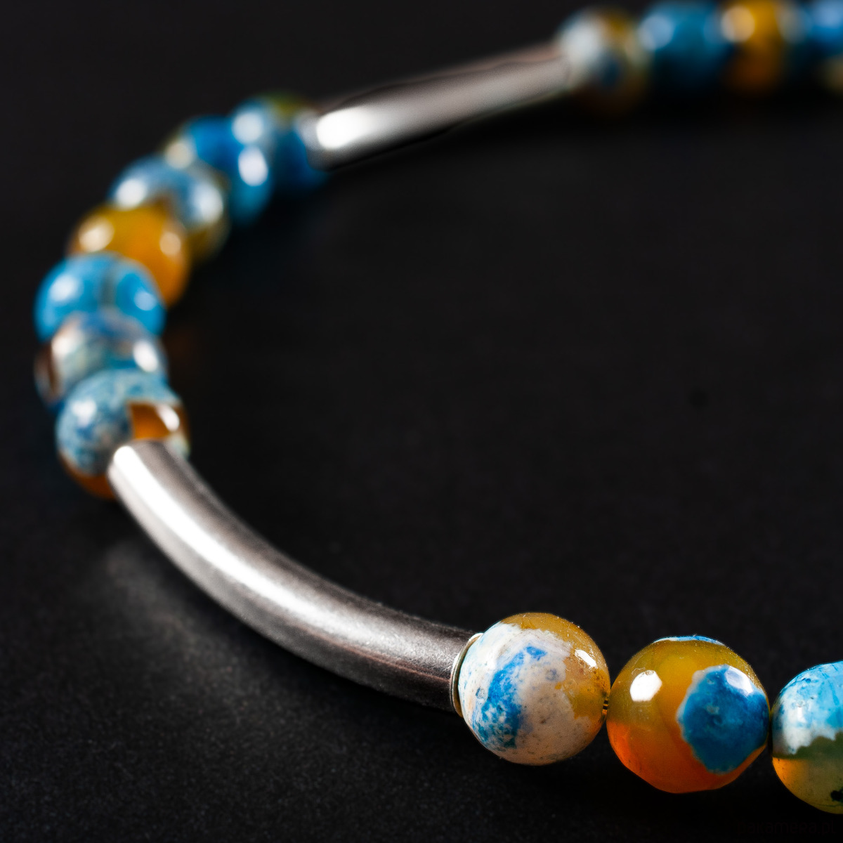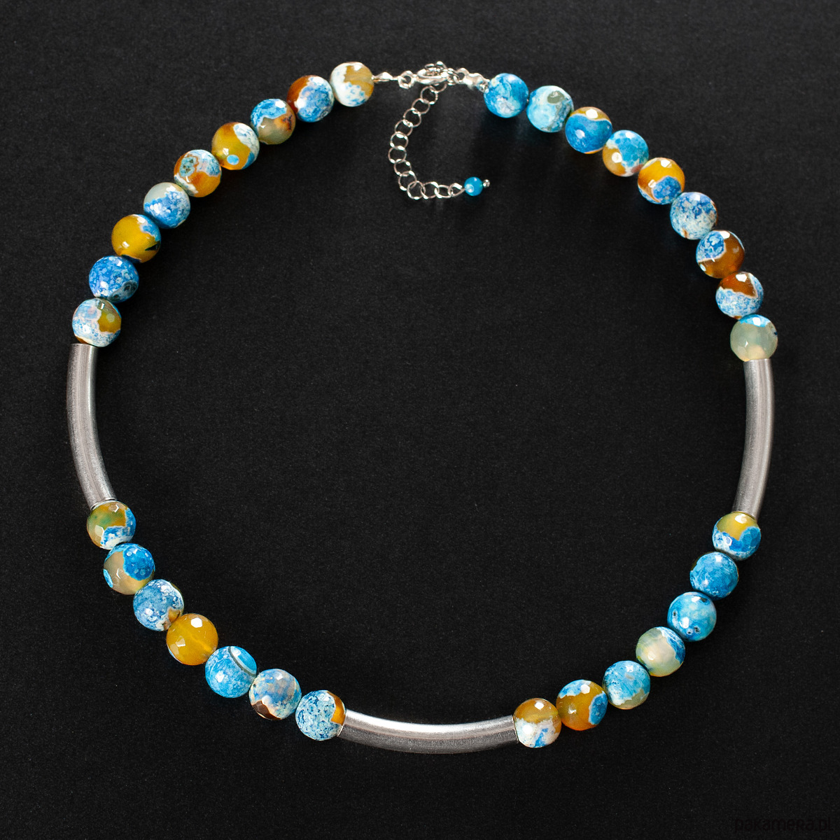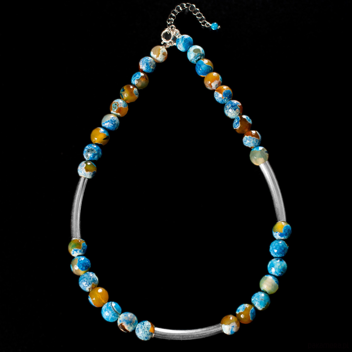 Naszyjnik z kolekcji ŁĄKA z przepięknymi, zachwycającymi kolorystyką agatami ognistymi. Błękitne, cytrynowe, białe kolory kamieni kontrastują z grubymi rurkami z galwanizowanego mosiądzu. Długość naszyjnika 45 cm + 5 cm . Skład: kamienie naturalne 72%, mosiądz podwójnie galwanizowany 23%, srebro 925 2%, stal szlachetna 3%. Naszyjnik wykonany ręcznie według własnego projektu w pracowni Anillo. Biżuterię przesyłamy w eleganckim kartoniku.