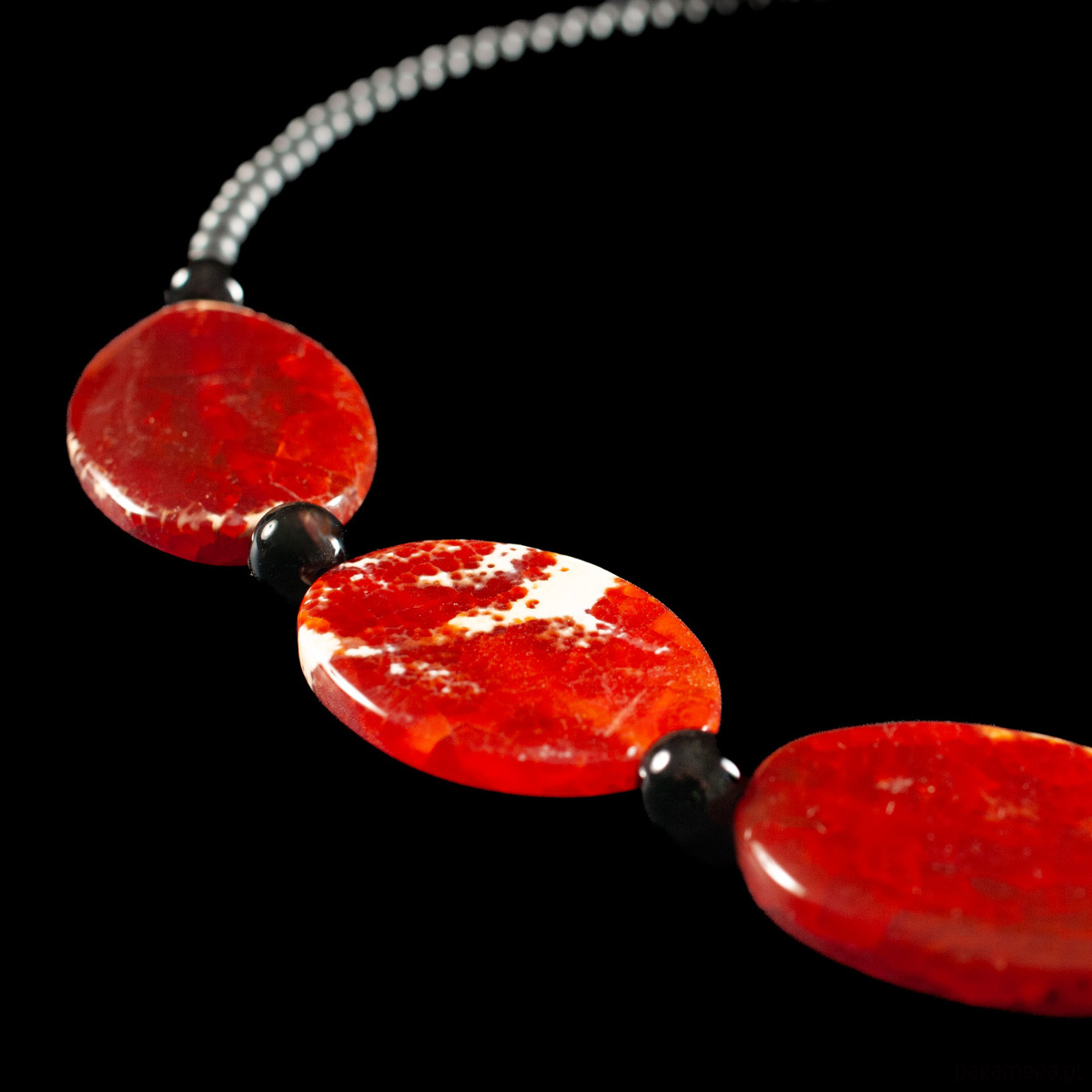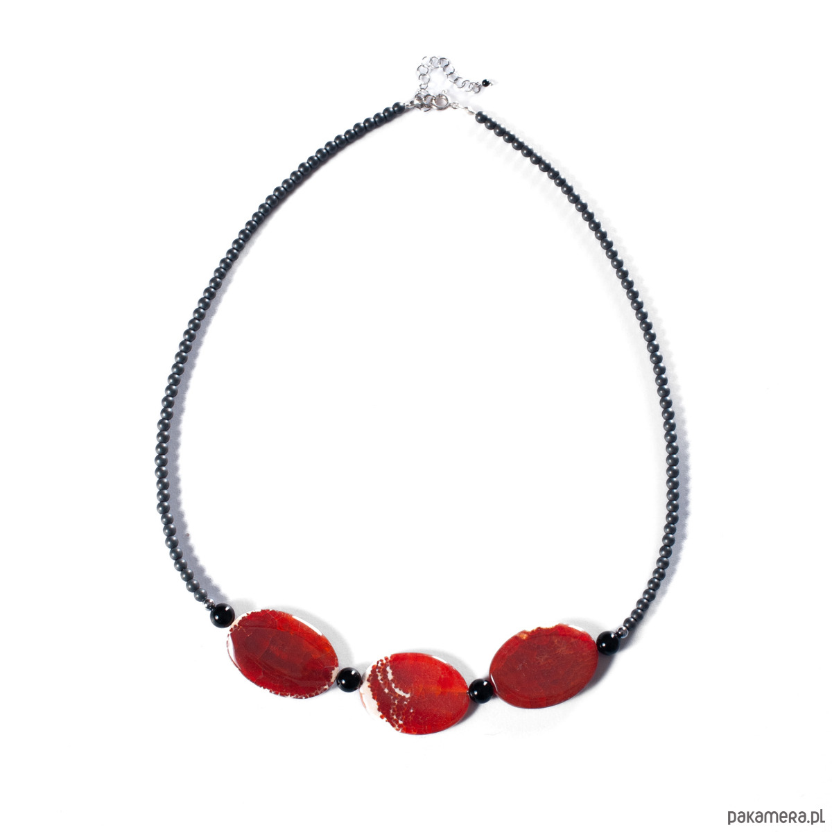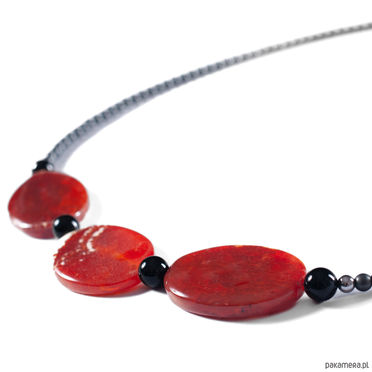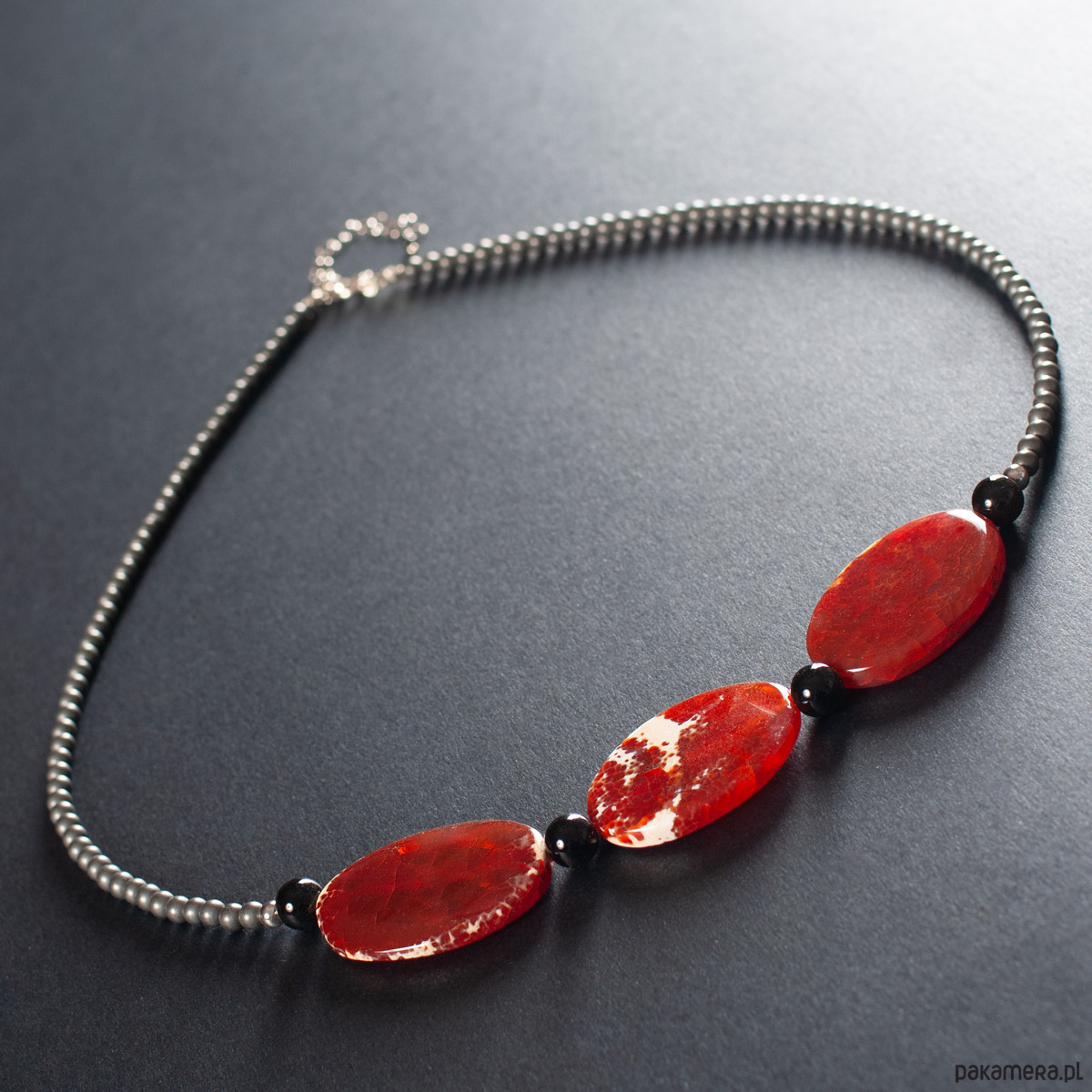 Naszyjnik z kolekcji SZAMANKA z agatem, onyksem i hematytem. W centralnej części trzy duże, owalne agaty ogniste, zachwycające kolorem i rysunkiem kamieni. Pomiędzy nimi, wzmacniając kolor kamieni czerń onyksu. Po obu stronach agatów okrągłe koraliki hematytu trawionego. Długość naszyjnika 58 cm + łańcuszek 5 cm. Skład: kamienie naturalne 95 %, srebro 925 2%, stal szlachetna 3%. Naszyjnik wykonany ręcznie według własnego projektu w pracowni Anillo. Biżuterię przesyłamy w eleganckim kartoniku.