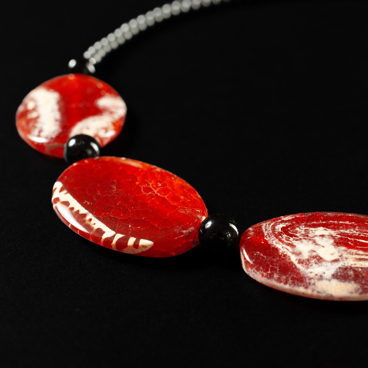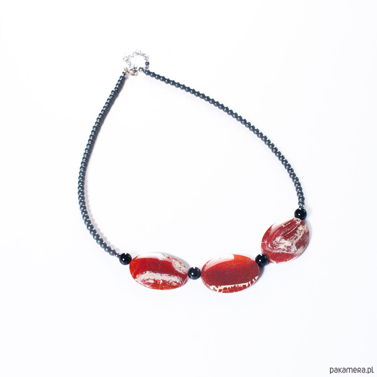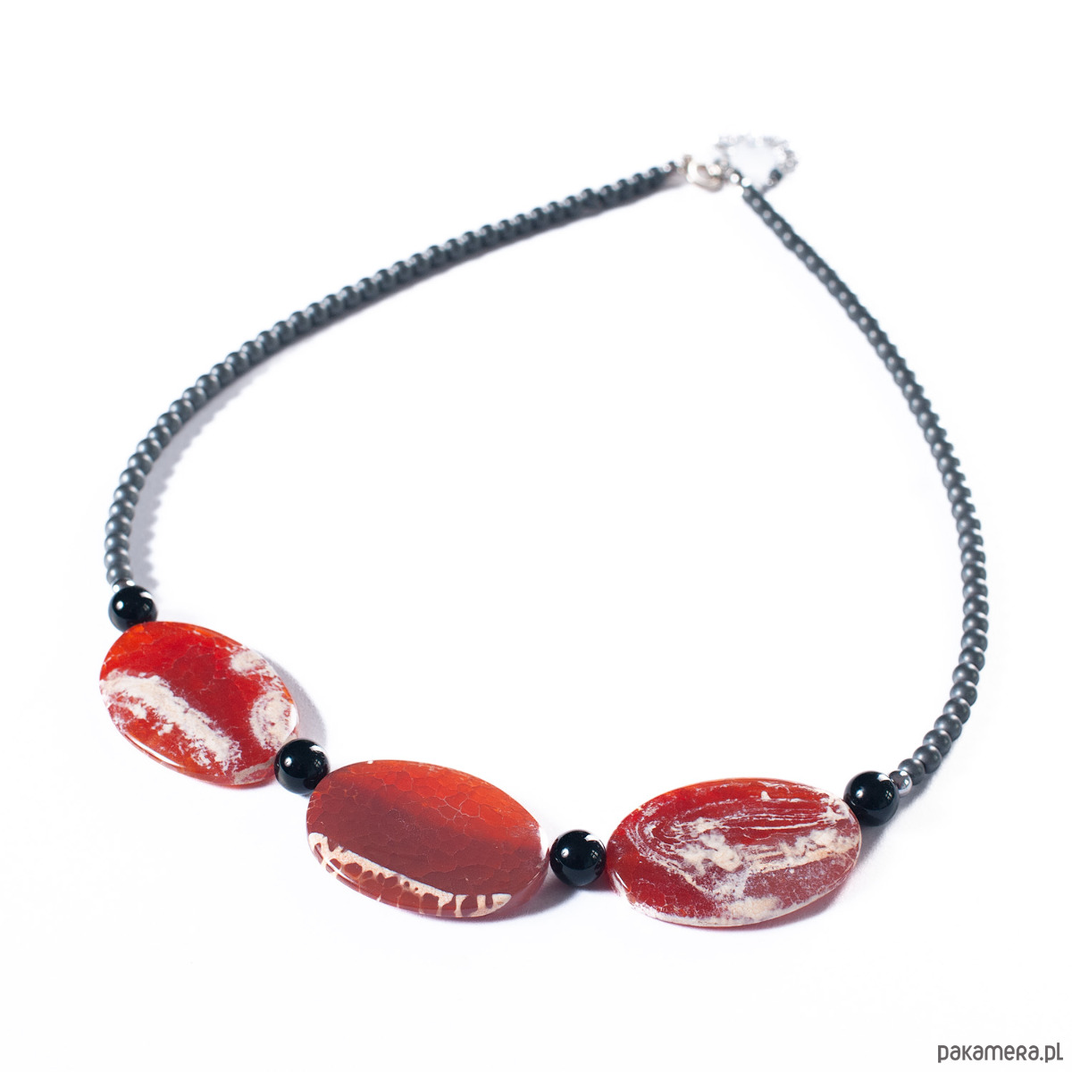Naszyjnik z kolekcji SZAMANKA z agatem, onyksem i hematytem. W centralnej części trzy duże, owalne agaty ogniste, zachwycające kolorem i rysunkiem kamieni. Pomiędzy nimi, wzmacniając kolor kamieni czerń onyksu. Po obu stronach agatów okrągłe koraliki hematytu trawionego. Długość naszyjnika 58 cm + łańcuszek 5 cm. Skład: kamienie naturalne 95 %, srebro 925 2%, stal szlachetna 3%. Naszyjnik wykonany ręcznie według własnego projektu w pracowni Anillo. Biżuterię przesyłamy w eleganckim kartoniku.
