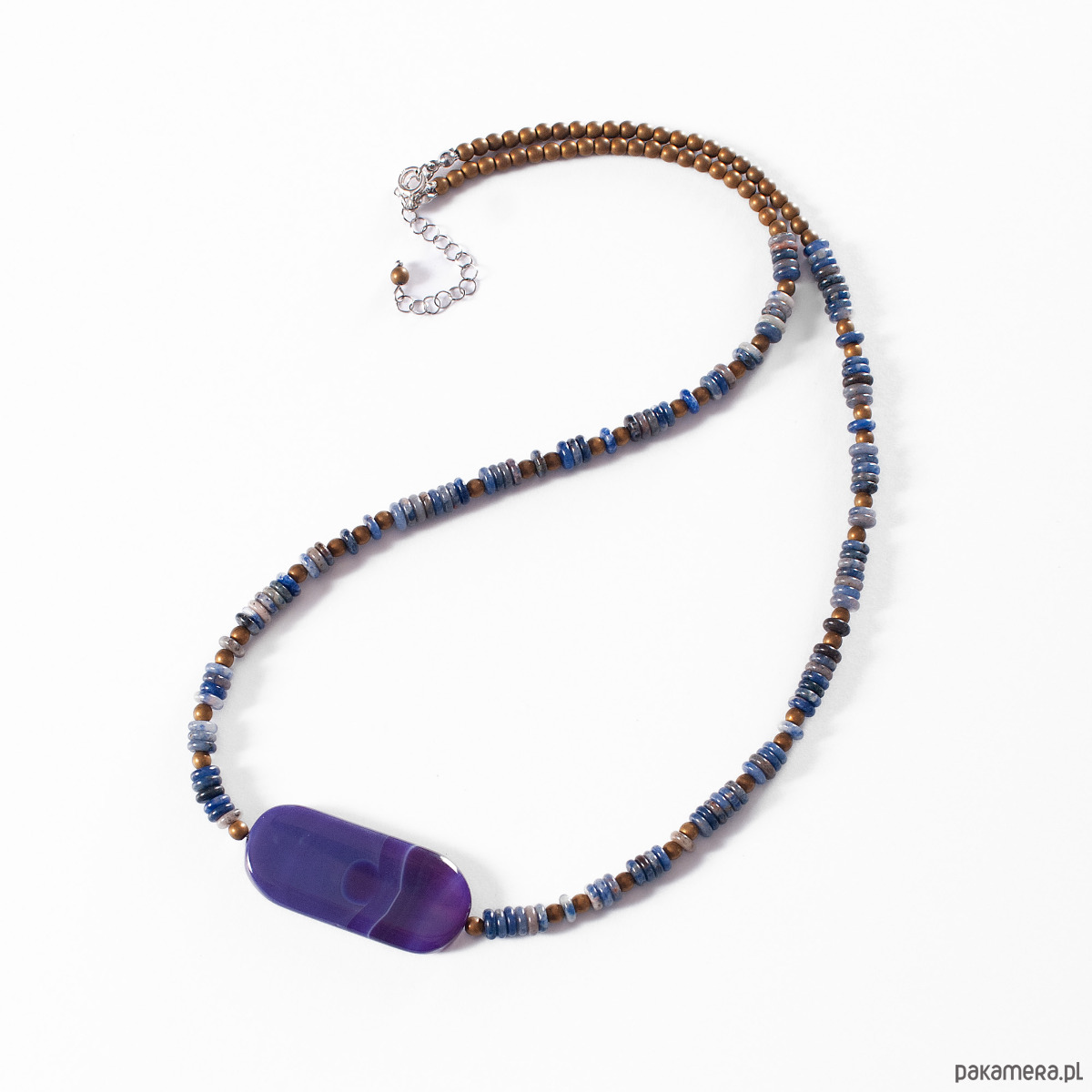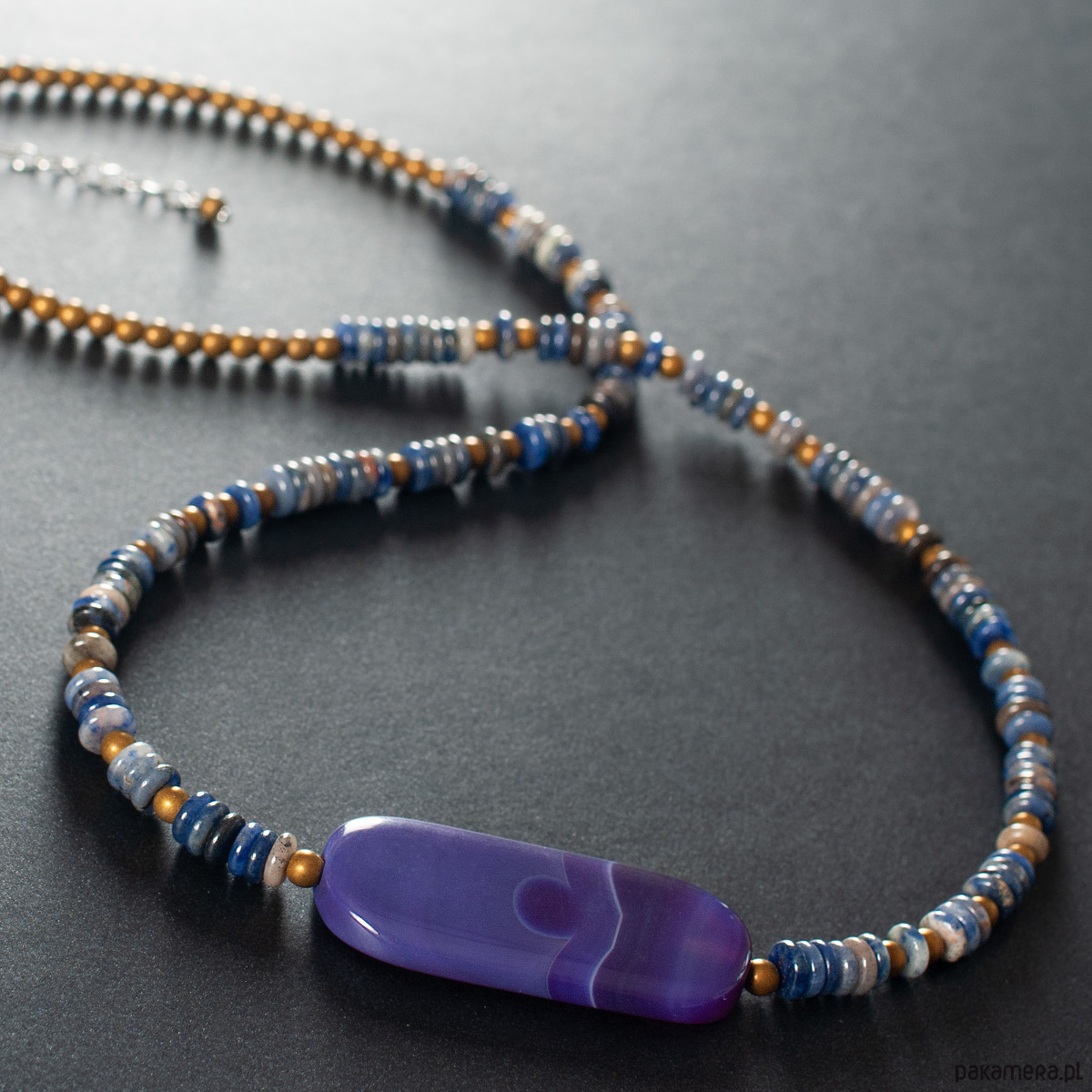 Naszyjnik z kolekcji SZAMANKA z agatem, sodalitem, hematytem. W centrum uwagi znajduje się piękny, owalny, duży agat ametystowy, zachwycający odcieniami fioletu. Po obu jego stronach nanizane w nieregularnych odstępach dyski sodalitu i platerowane kulki hematytu. Długość naszyjnika 65 cm + łańcuszek 5 cm. Skład: kamienie naturalne 95 %, srebro 925 2%, stal szlachetna 3%. Naszyjnik wykonany ręcznie według własnego projektu w pracowni Anillo. Biżuterię przesyłamy w eleganckim kartoniku.