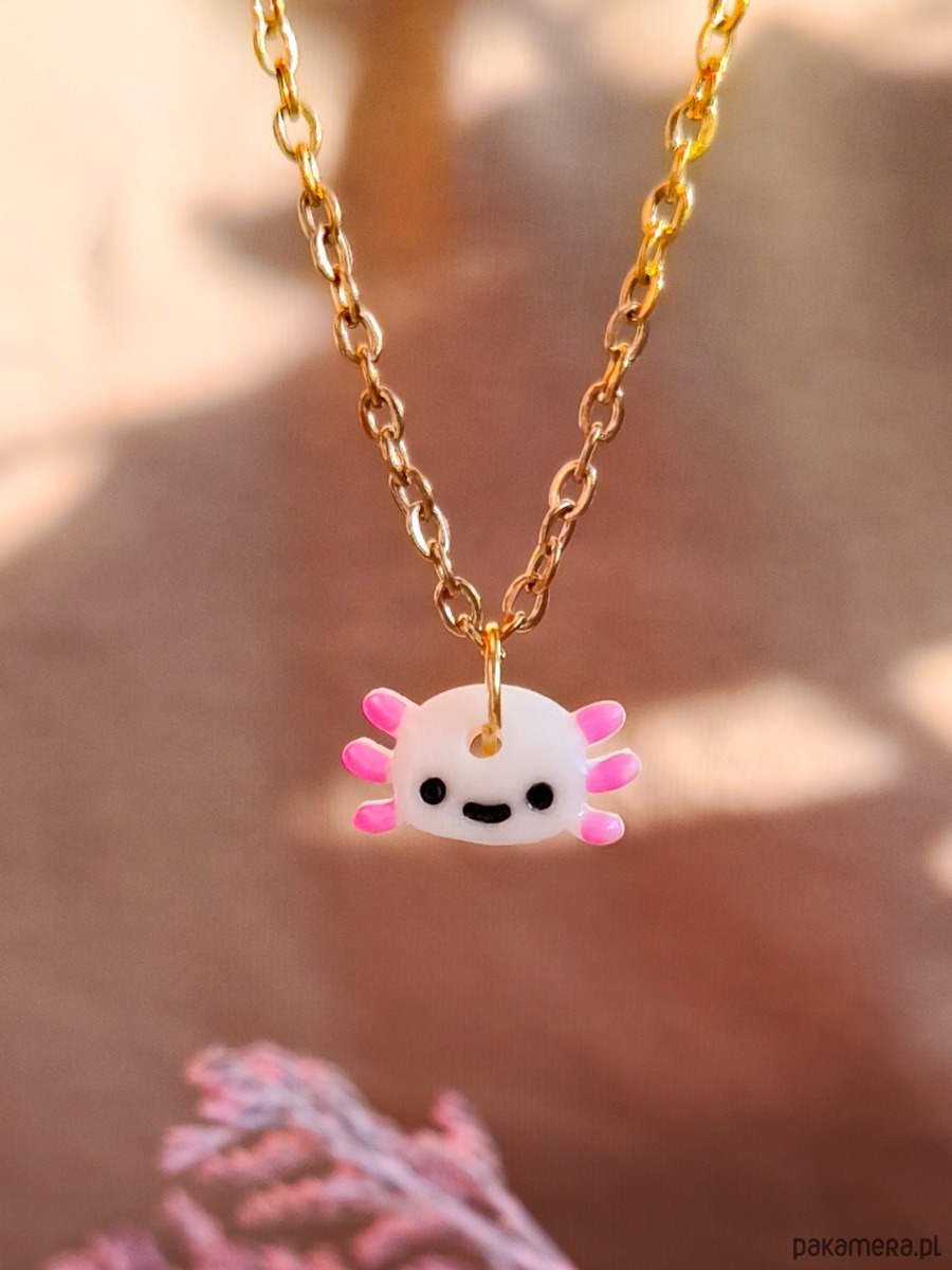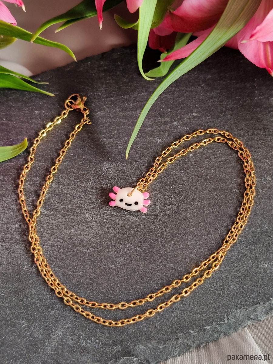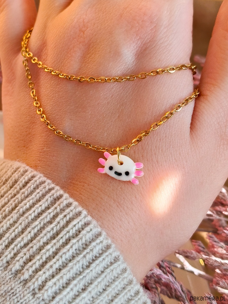 Naszyjnik z aksolotlem to biżuteria handmade z motywem jednego z najbardziej uroczych zwierząt, zaprojektowana w lekkim, radosnym stylu. Pastelowa kolorystyka i sympatyczna forma sprawiają, że naszyjnik przyciąga uwagę i wywołuje uśmiech. To propozycja dla miłośników stylu kawaii, osób ceniących biżuterię z humorem oraz tych, którzy szukają oryginalnego dodatku do codziennych stylizacji. Naszyjnik świetnie sprawdzi się jako prezent urodzinowy lub miły upominek bez okazji.