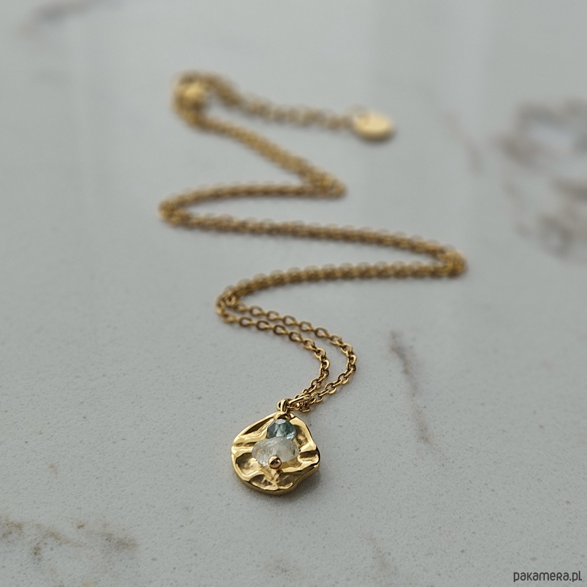 Inspirowany taflą wody naszyjnik łączący modne wzornictwo z delikatnymi barwami kamieni naturalnych. Zawieszka ze stali szlachetnej stanowi tło dla pięknie szlifowanego akwamarynu i kamienia księżycowego w formie bryłek, zachwycającego bliską naturze surowością kształtu. Całość osadzona na łańcuszku ze stali szlachetnej, do którego dołączony jest także dodatkowy łańcuszek regulacyjny, ozdobiony stalowym kółeczkiem.