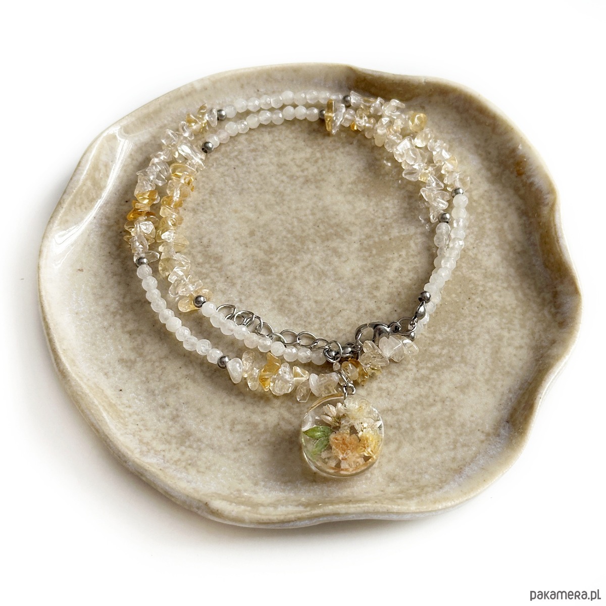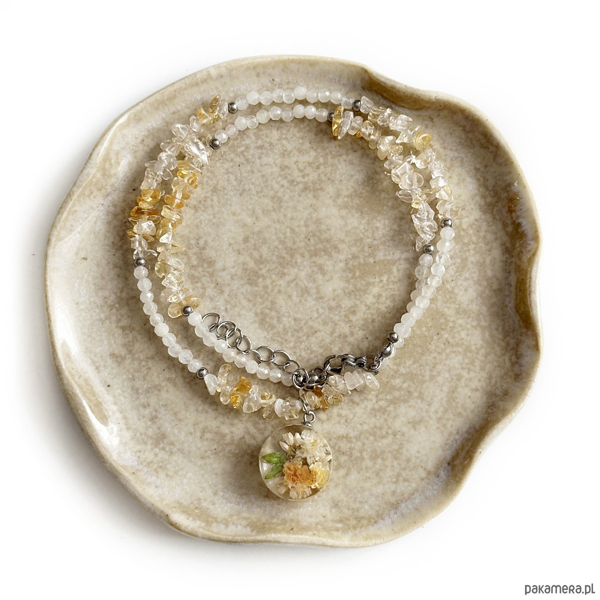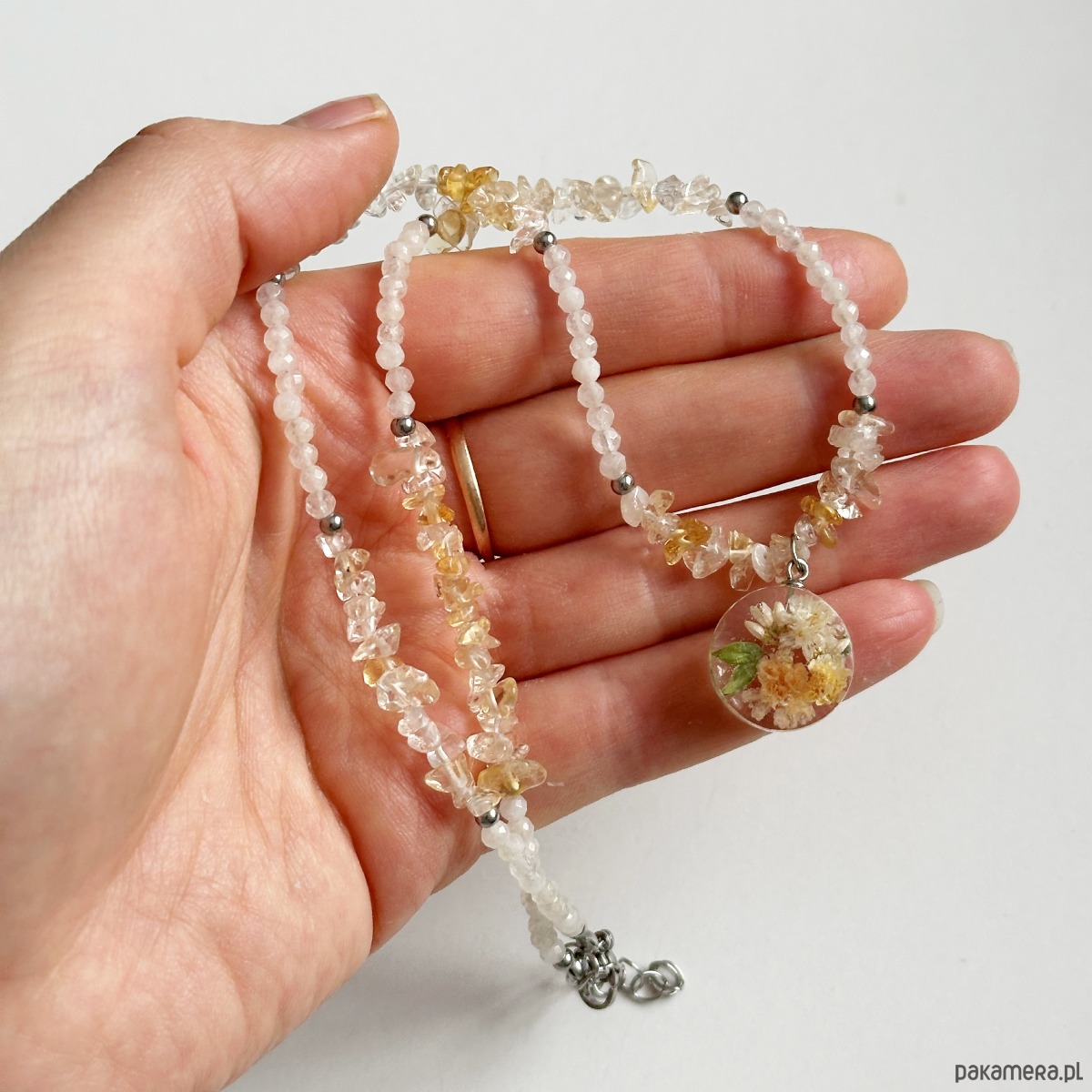Materiały – suszone kwiaty, stal szlachetna kamienie naturalne, żywica epoksydowa