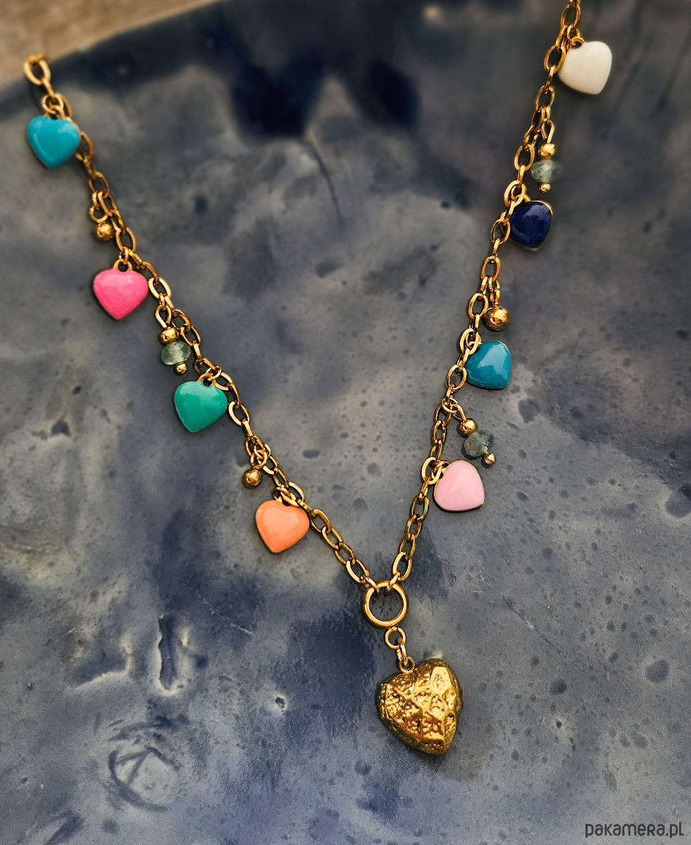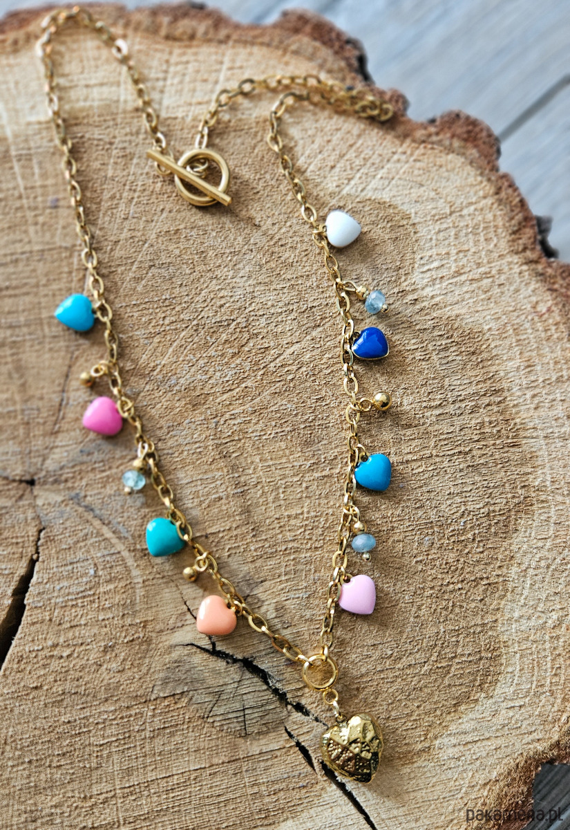 Kolorowy, beztroski, wiosenny! A do tego zgodny z najnowszymi trendami w biżuterii. Taki właśnie jest naszyjnik z zawieszką - sercem ze stali szlachetnej oraz uroczymi, kolorowymi emaliowanym serduszkami. Dodatkowo w łańcuszek wplecione zostały stalowe kuleczki i to, co najważniejsze - pięknie lśniące fasetowane akwamaryny. Całość zamyka modne zapięcie toggle.