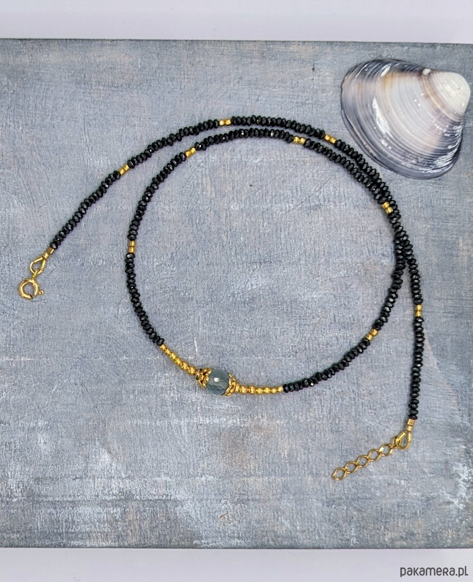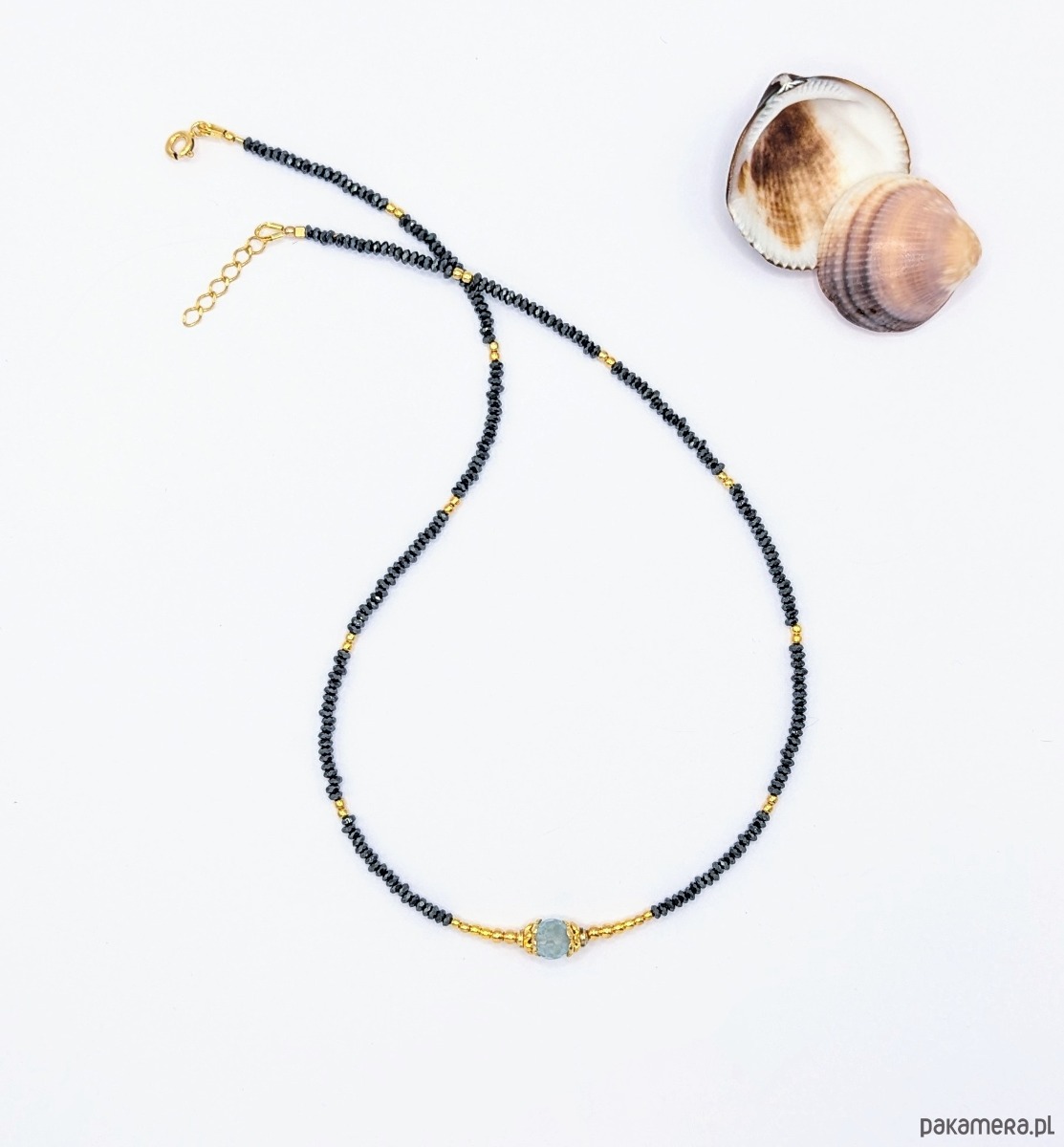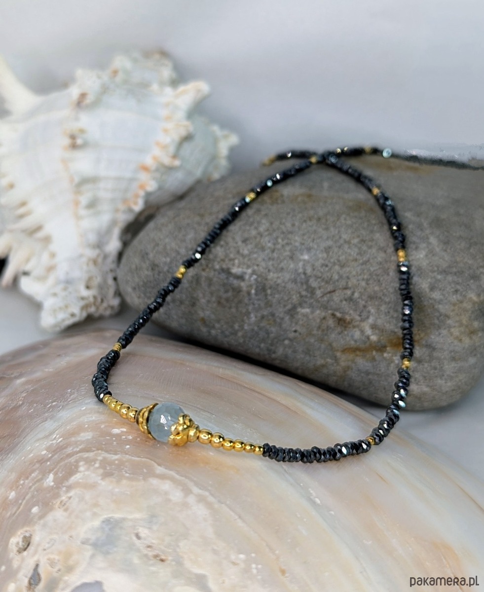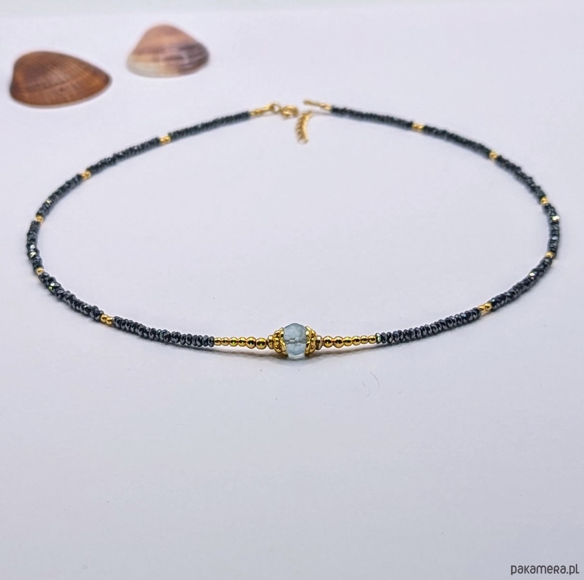 Naszyjnik w stylu obróżki z kulą akwamarynu, krótki, do noszenia pod szyją. Kamień kontrastuje z pozostałymi dodatkami - pozłacanym srebrem i platerowanym na grafitowo hematytem. Hematyt intensywnie lśni, przy minimalnym ruchu migocze. Zjawisko trudne do uchwycenia na zdjęciu, odpowiada za srebrny kolor na niektórych ujęciach. Minimalistyczna forma naszyjnika wraz z iskrzącym blaskiem kamieni budują efektowną aurę.