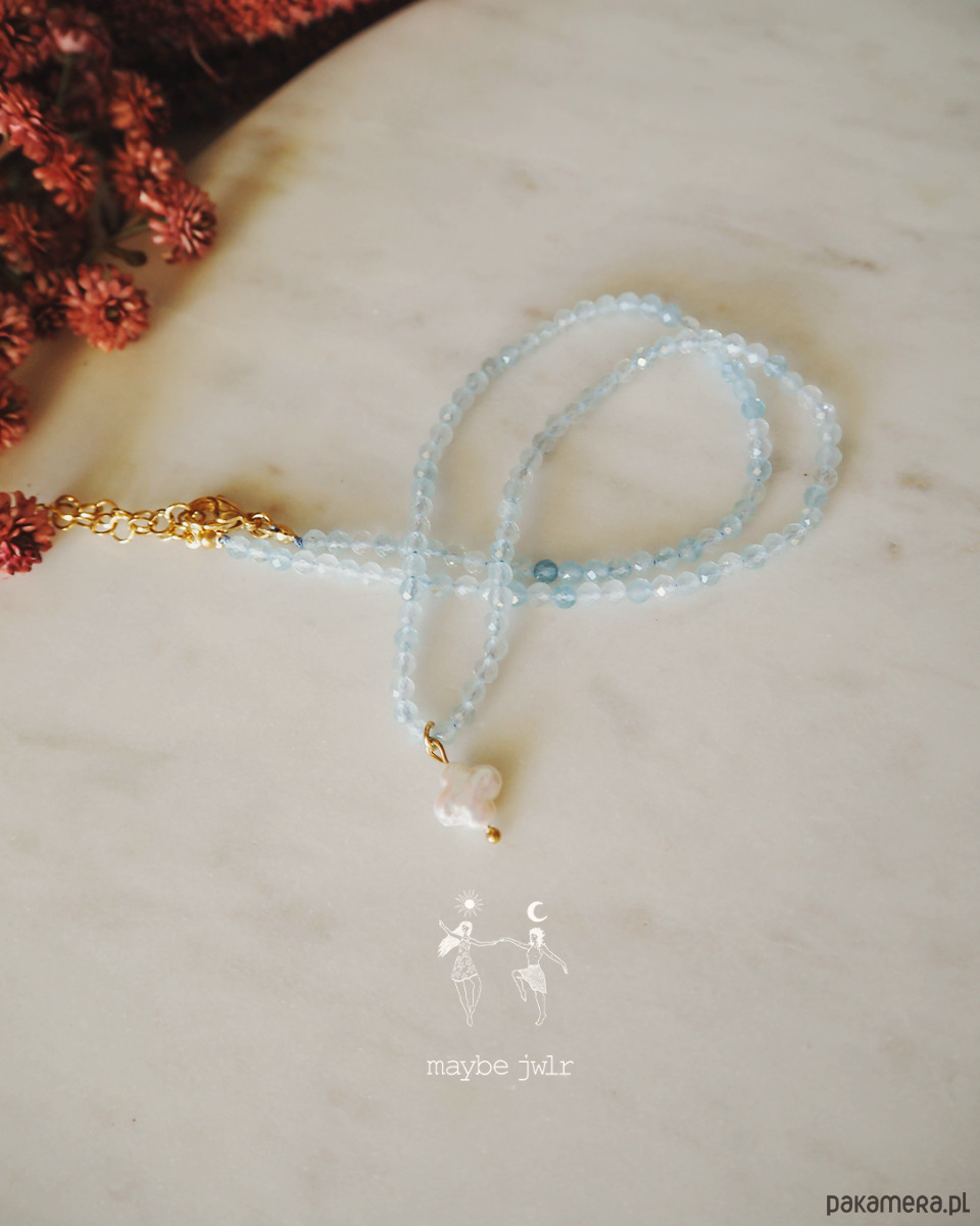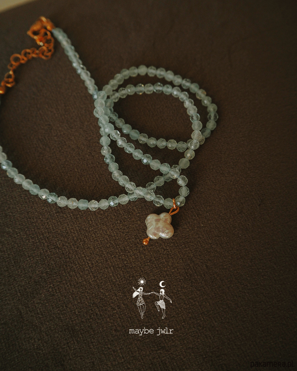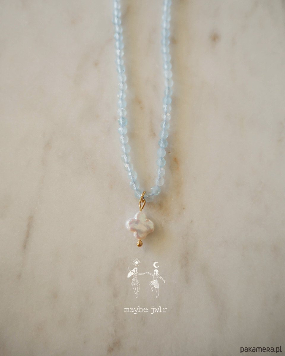 Subtelny i elegancki naszyjnik z błękitnych, szlifowanych akwamarynów z perłą w kształcie koniczyny to biżuteria, która dodaje lekkości, świeżości i kobiecego uroku każdej stylizacji. Drobne kamienie (3 mm) pięknie połyskują, a wyjątkowy motyw koniczyny symbolizuje szczęście, nadzieję i harmonię.