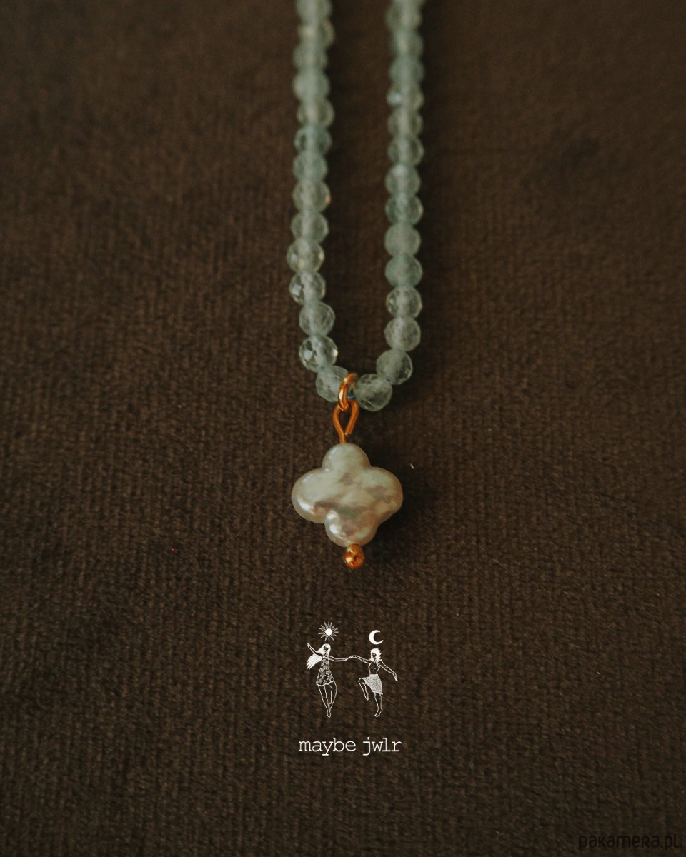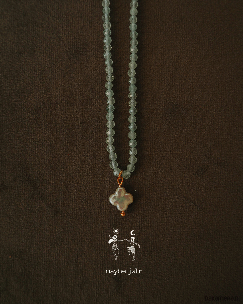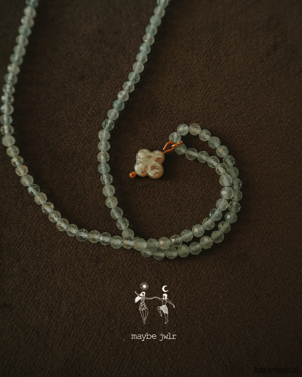 Subtelny i elegancki naszyjnik z błękitnych, szlifowanych akwamarynów z perłą w kształcie koniczyny to biżuteria, która dodaje lekkości, świeżości i kobiecego uroku każdej stylizacji. Drobne kamienie (3 mm) pięknie połyskują, a wyjątkowy motyw koniczyny symbolizuje szczęście, nadzieję i harmonię.