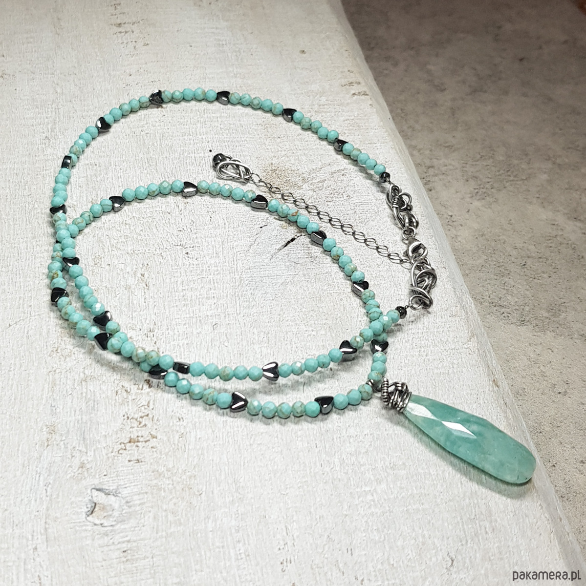 Elegancki i delikatny naszyjnik z fasetowanym amazonitem (30x10mm) wykonany ręcznie z oksydowanego srebra i mikrofasetowanych 3mm turkusików i serduszek hematytu. Długość naszyjnika 49+przedłużka 5 cm