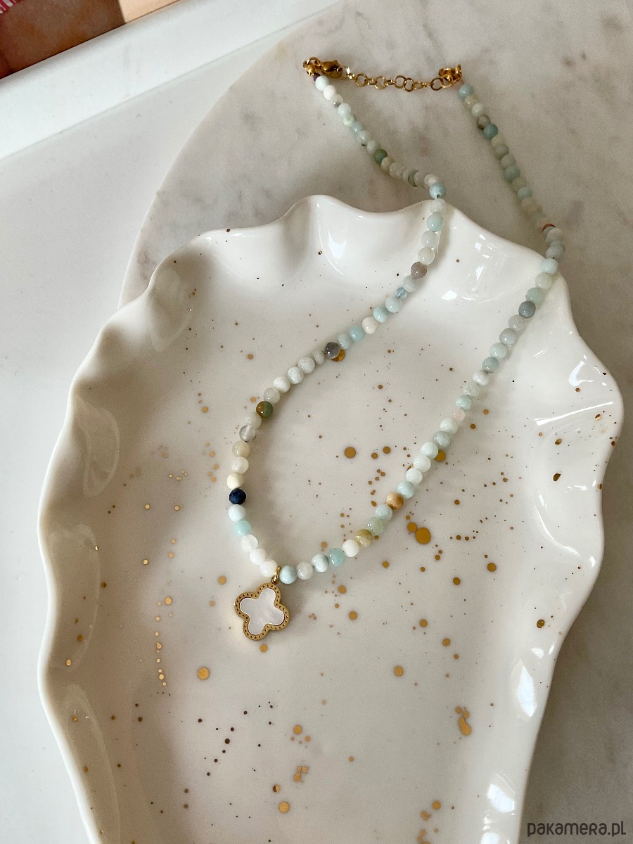 Ten wyjątkowy naszyjnik to połączenie naturalnego piękna kamieni szlachetnych i symboliki szczęścia. Wykonany z gładkich, polerowanych kamieni amazonitu, zachwyca swoją delikatną, turkusowo-zieloną barwą z subtelnymi, jasnymi żyłkami. Każdy kamień jest niepowtarzalny, co sprawia, że naszyjnik ma unikalny, organiczny charakter.