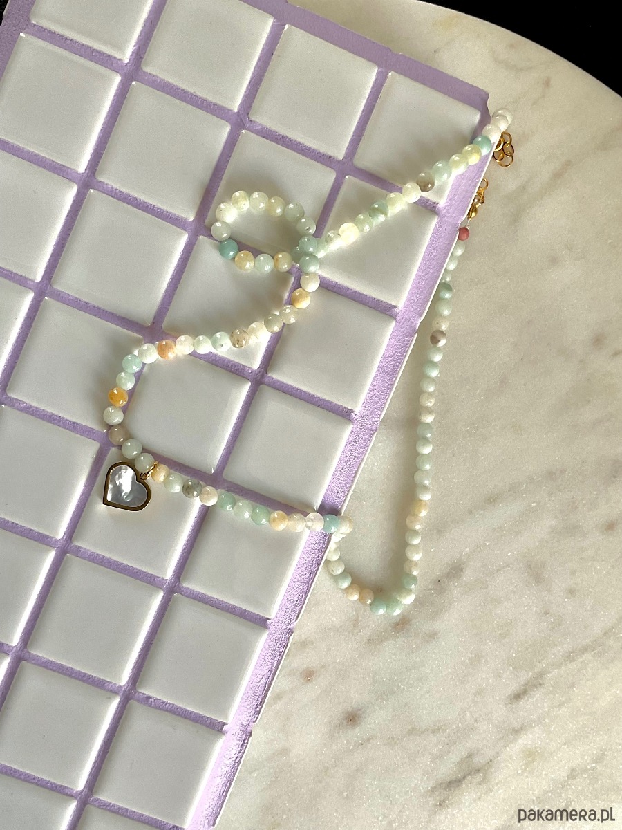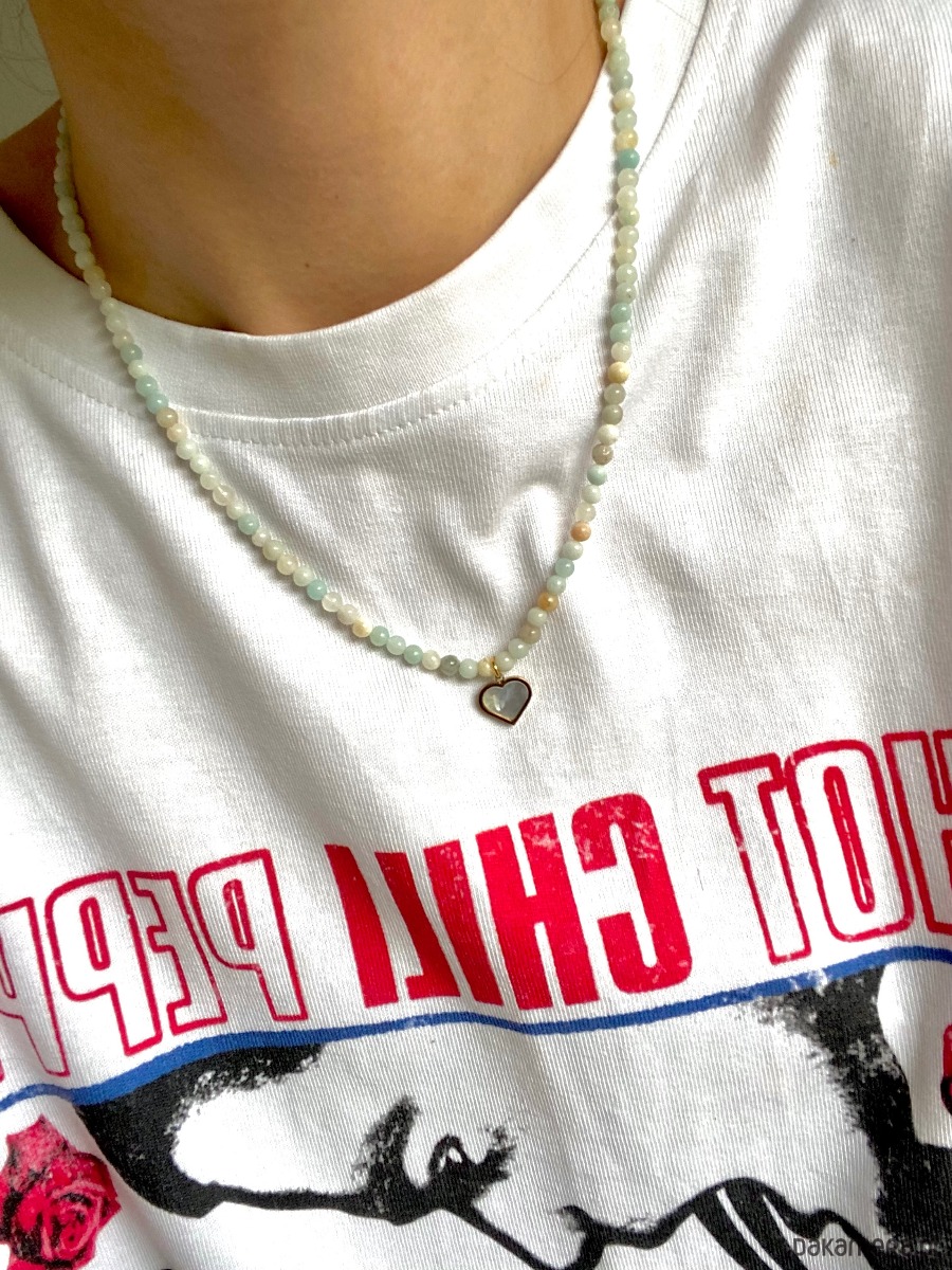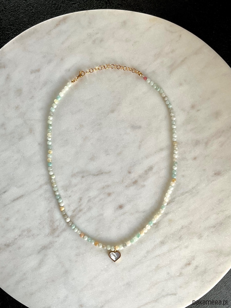 Naszyjnik z amazonitu z zawieszką w kształcie serca z muszlą.