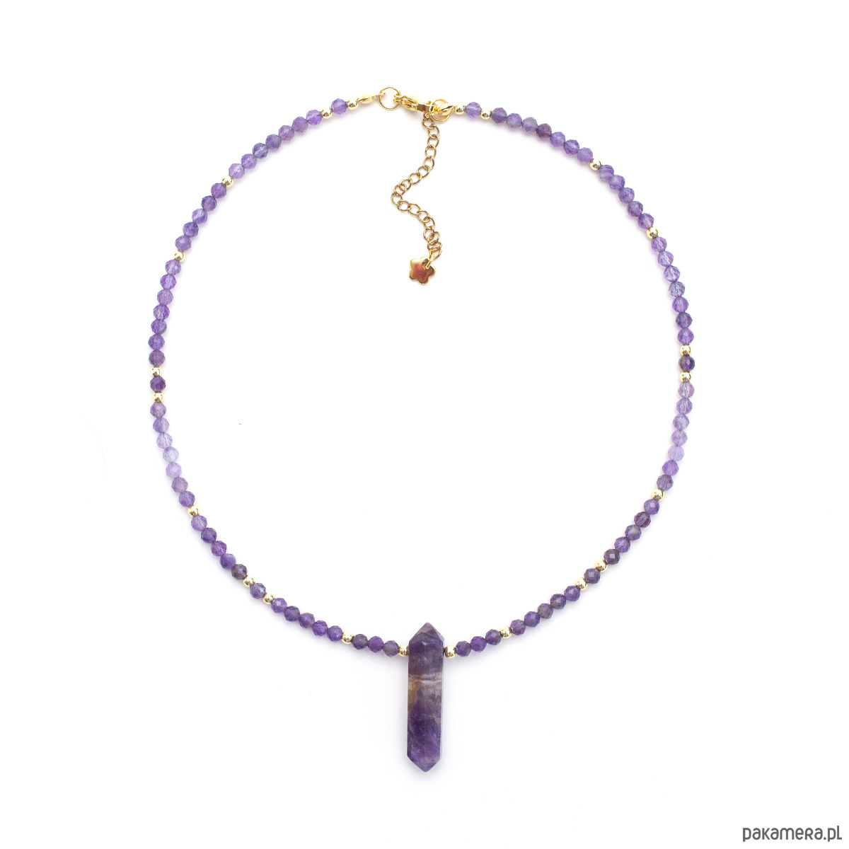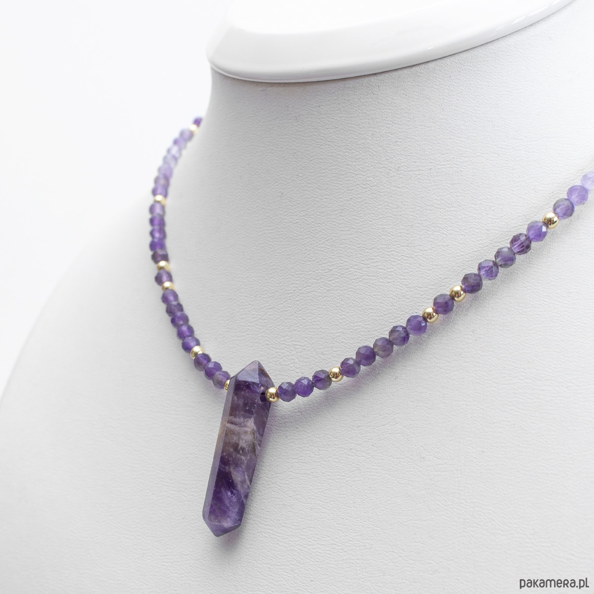 Centralnym punktem kompozycji jest duży, fasetowany szpic wykonany z intensywnego ametystu, kamienia spokoju i duchowej transformacji. Jest on zawieszony na unikatowym sznurze: