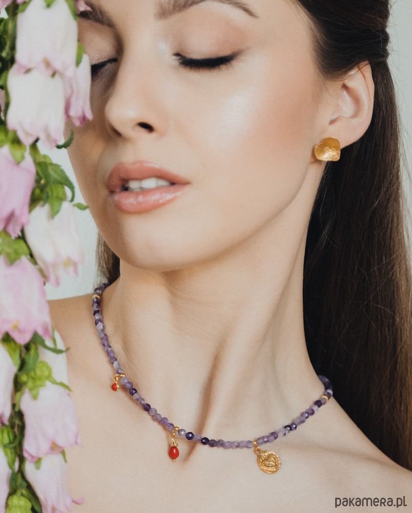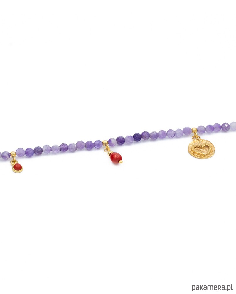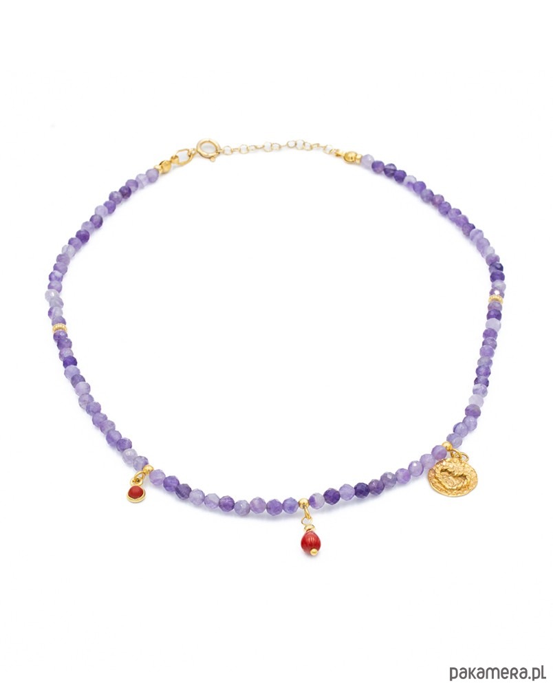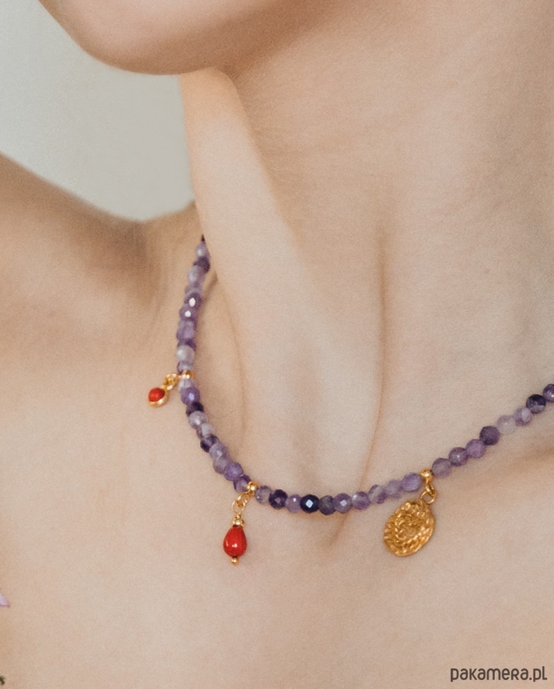 Energetyczny naszyjnik, kompozycja fasetowanych kuleczek ametystu z przywieszonymi koralami naturalnymi oraz ręcznie wykonanym serduszkiem. Całość wykonana w srebrze 925, złoconym 24k złotem.