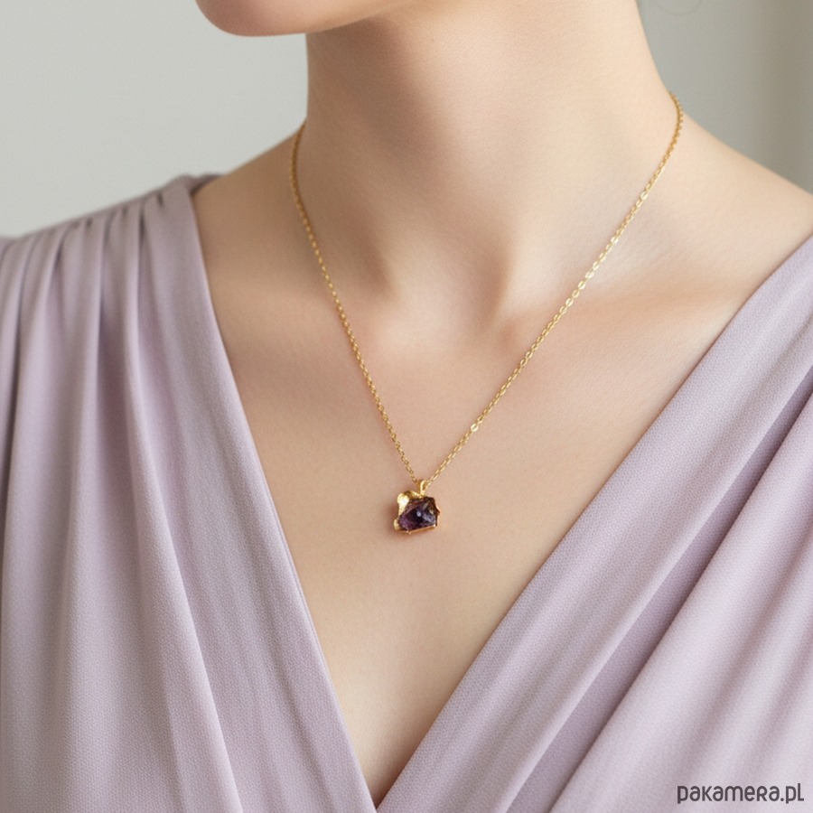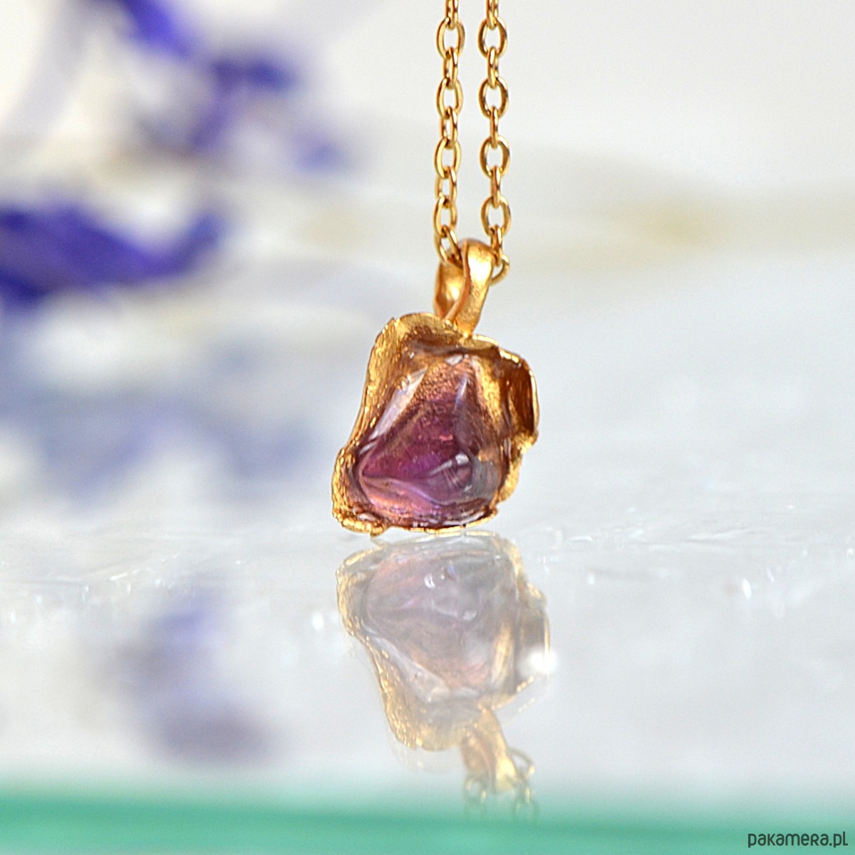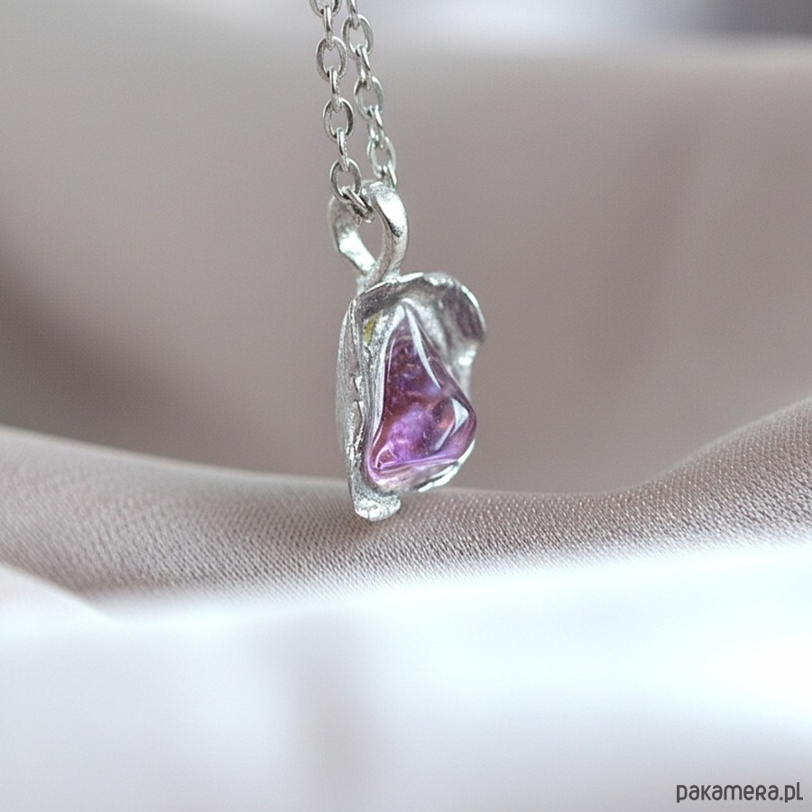 Naszyjnik z ametystem z zawieszką w organicznym kształcie przypominającym rozerwaną kartkę papieru.