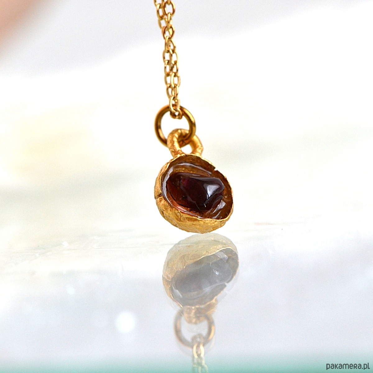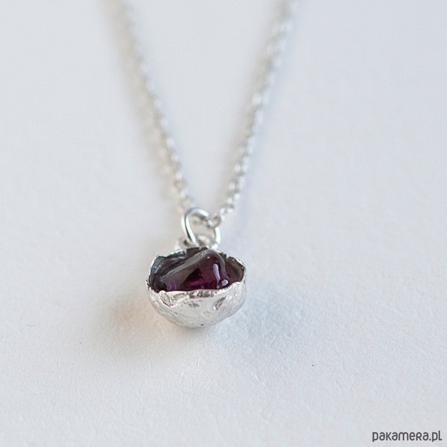 Naszyjnik z małą ręcznie uformowaną kuleczką w organicznej formie z granatem to wyjątkowy element biżuterii, który łączy w sobie naturalne piękno kamienia z artystycznym wyrazem ręcznego rzemiosła.