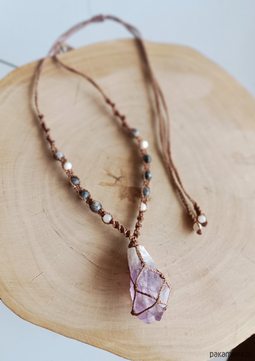 Naszyjnik z pięknym, dużym (4,5/ 2,5 cm) ametystem w formie kryształu. Dodatkowe kamienie to larvikit, zwany norweskim kamieniem księżycowym (6 mm ) i masa perłowa (5mm).