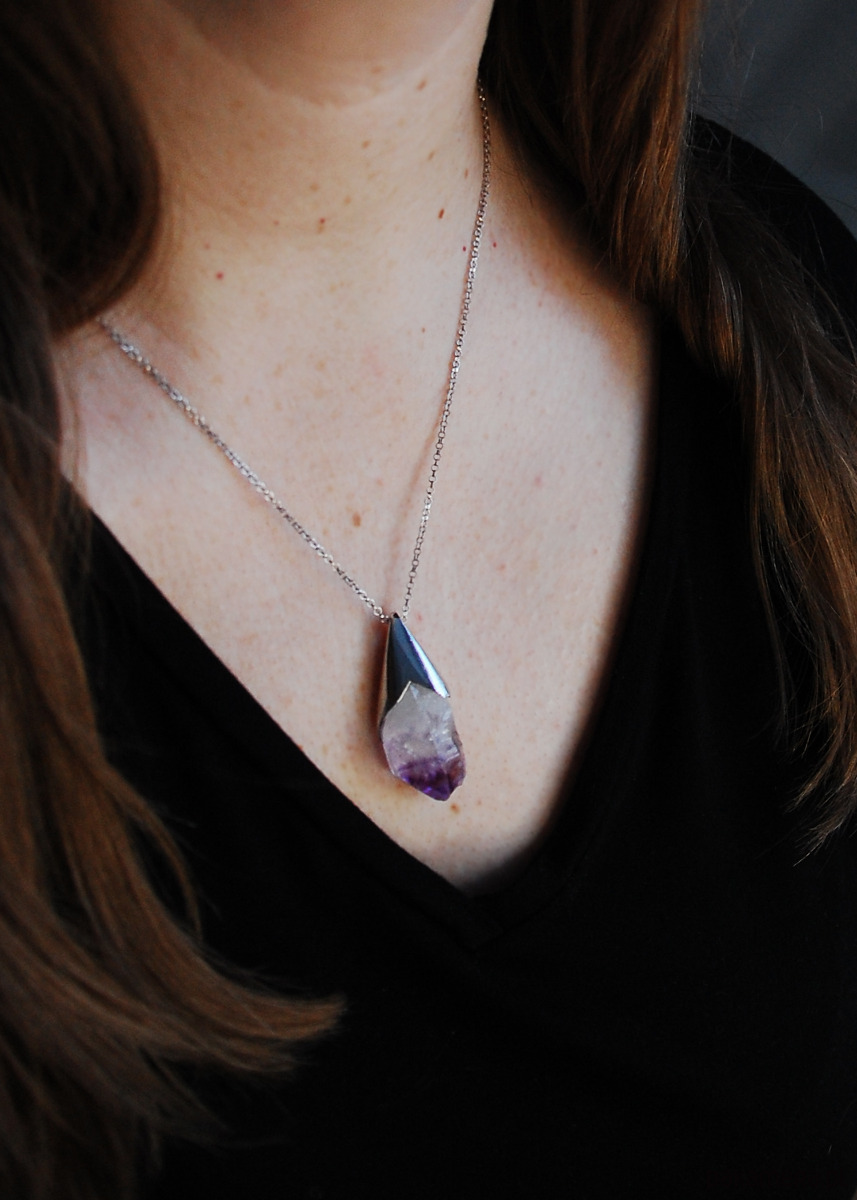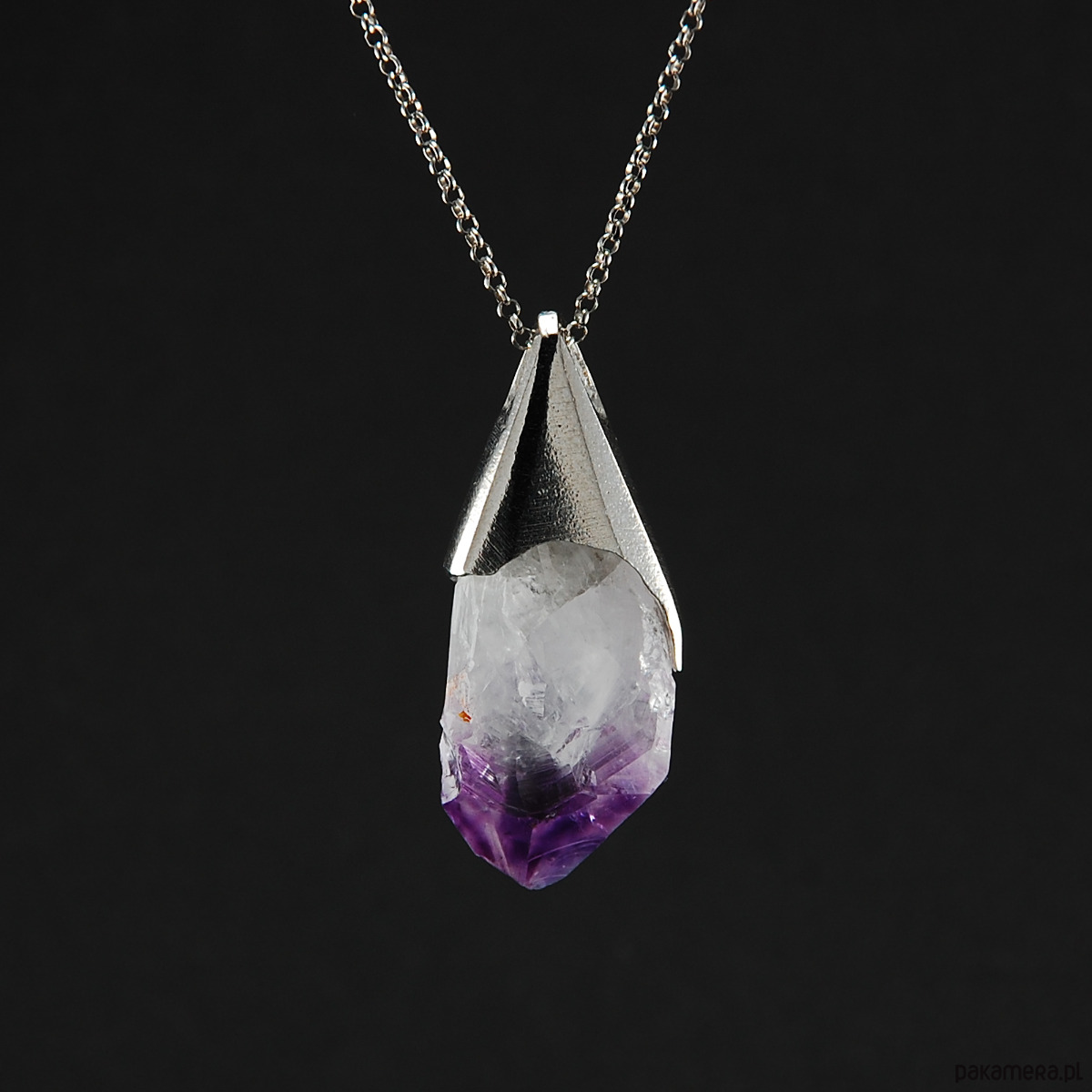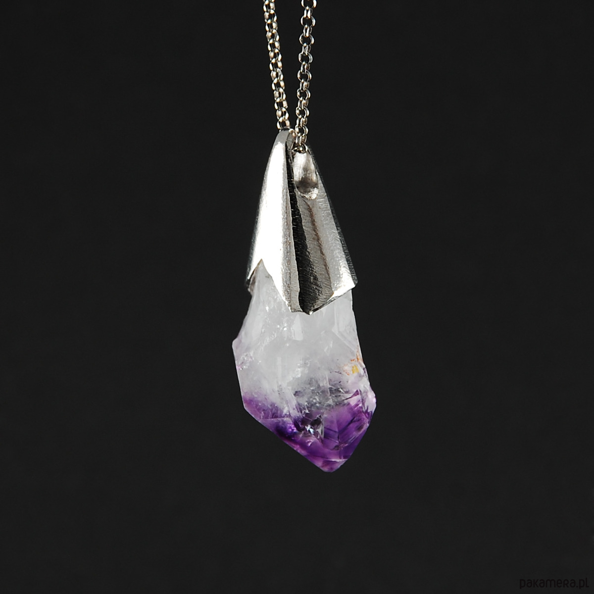 Naszyjnik wykonany z unikatowej bryłki ametystu oprawionego w srebro.