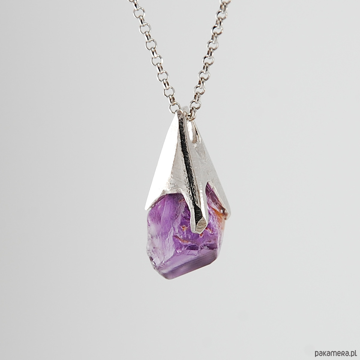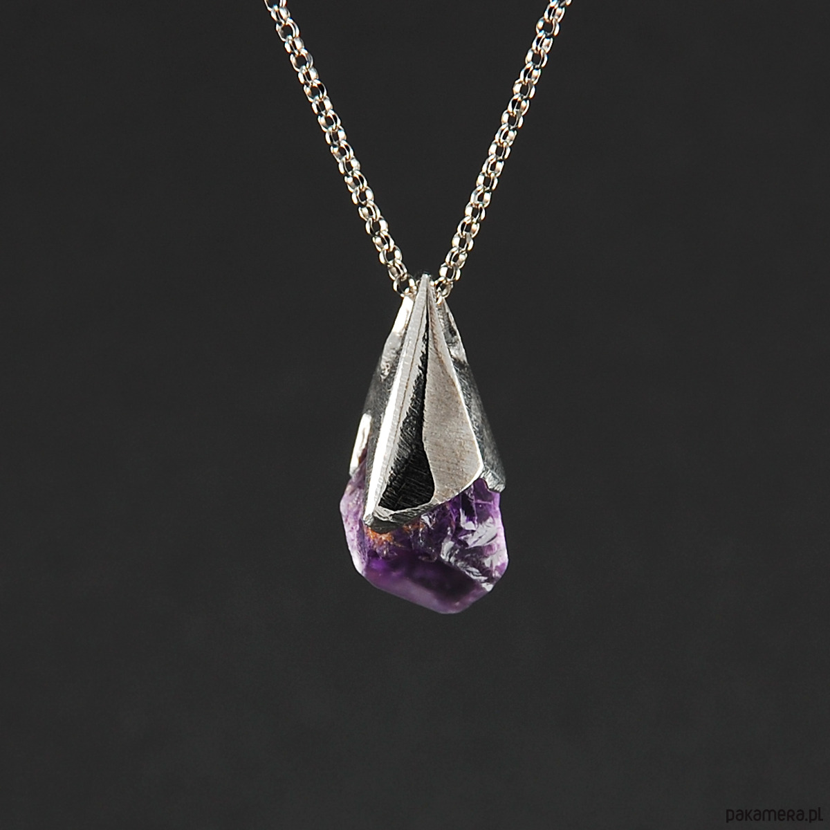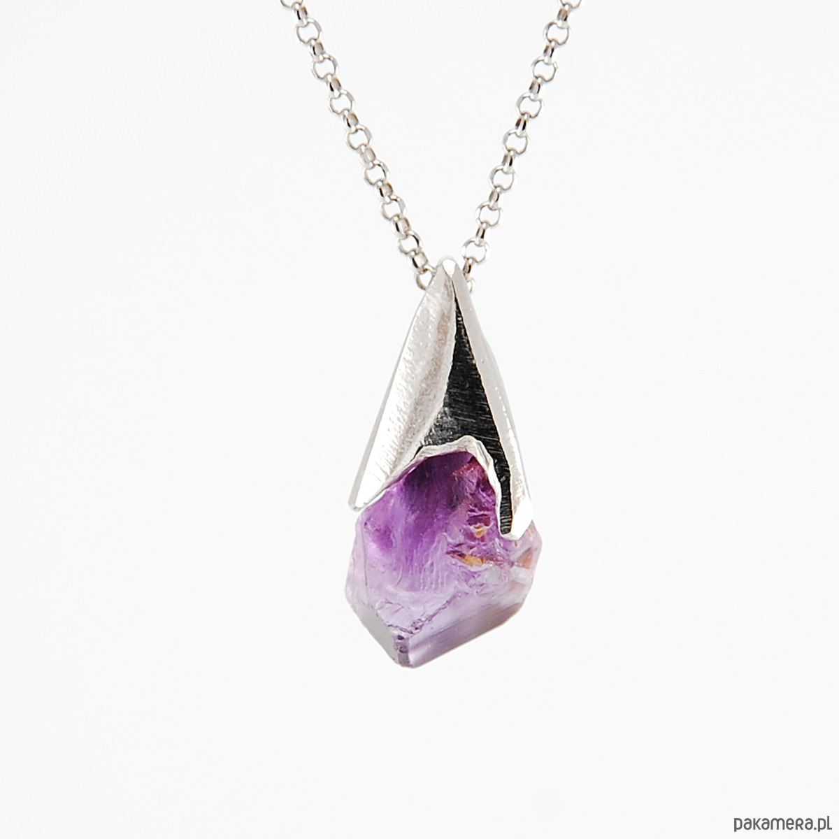 Naszyjnik wykonany z unikatowej bryłki ametystu oprawionego w srebro.