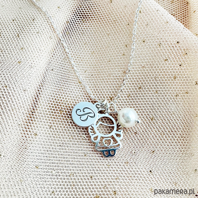 Wyjątkowy unikalny prezent dla dziewczynki z okazji Pierwszej Komunii , zawiera ponadczasowy naszyjnik z perłą Swarovski z wybranym inicjałem i aniołkiem ze srebra 925 ( opcjonalnie z wykonaną ręcznie kartą z życzeniami).