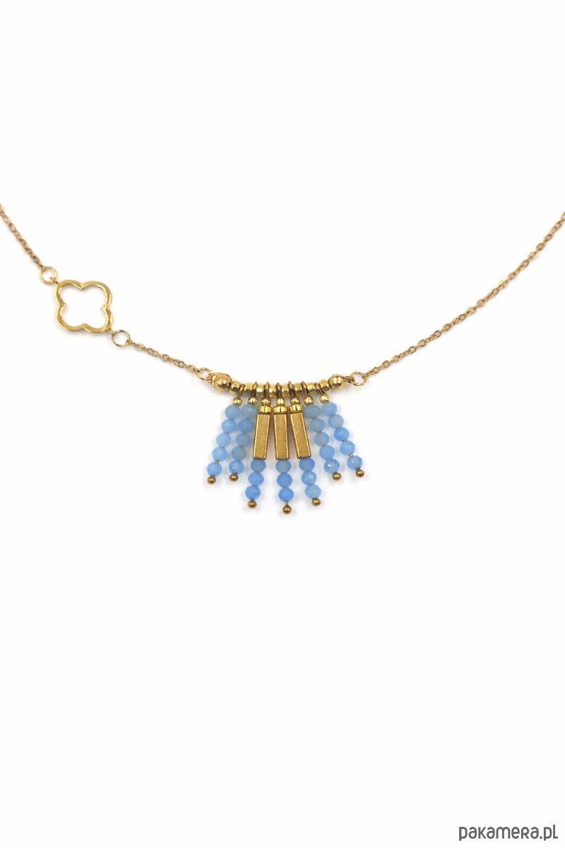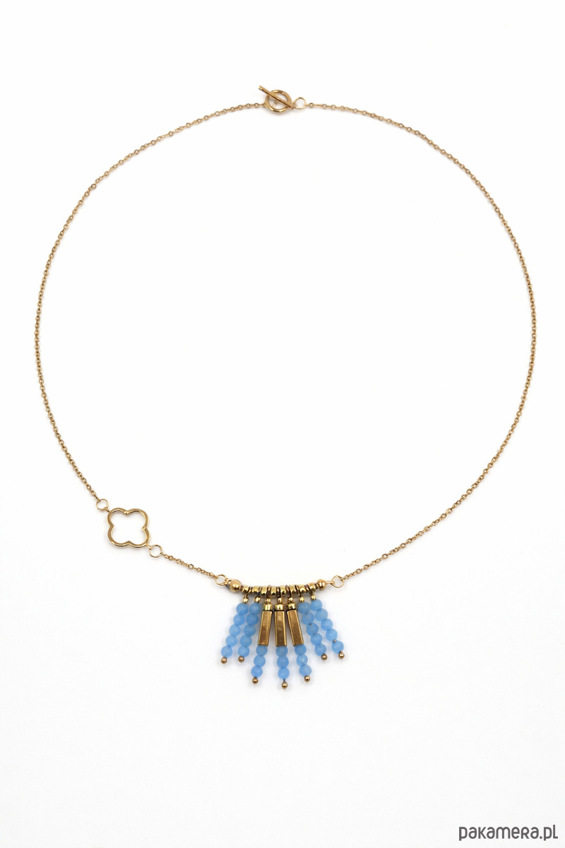 Subtelny, lekki naszyjnik o eleganckim i nowoczesnym charakterze. Przyciąga uwagę delikatną formą oraz ozdobnym elementem z fasetowanych błękitnych kamieni apatytu, które pięknie rozświetlają całość i dodają jej świeżości. To wyjątkowy dodatek, który sprawdzi się zarówno na co dzień, jak i jako uzupełnienie bardziej kobiecych stylizacji.