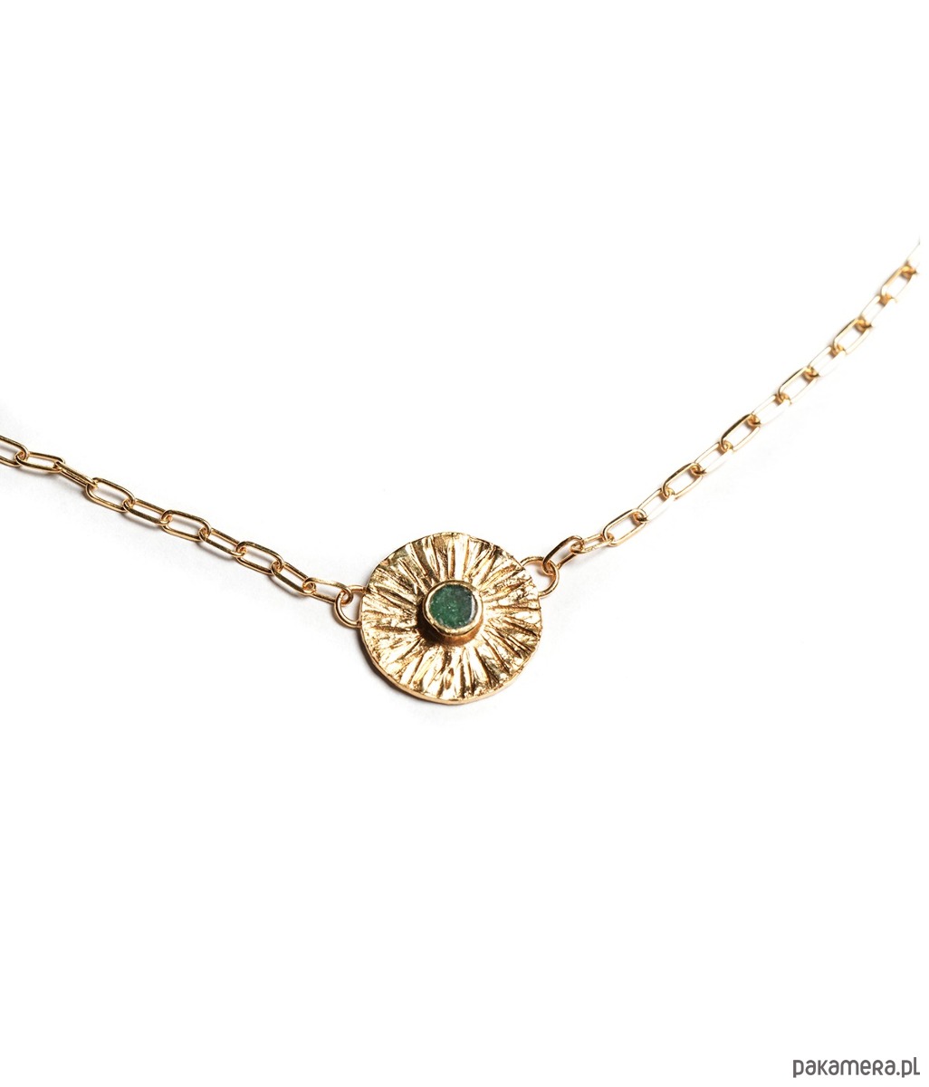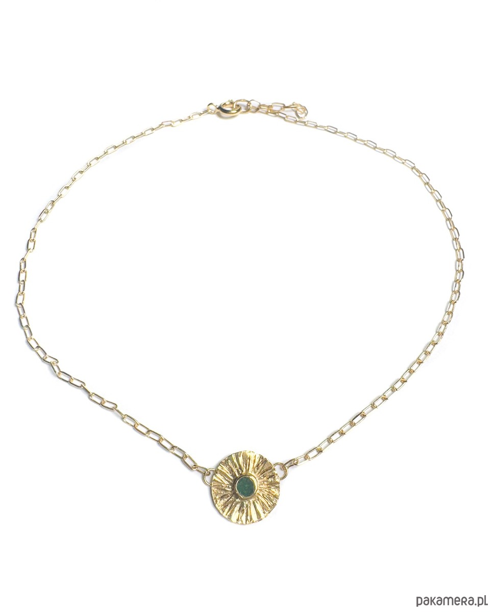 Naszyjnik z zielonym kamieniem naturalnym - awenturynem. Osadzonym w centrum fakturowanej blaszki. Wykonany ze srebra 925, złoconego 24 karatowym złotem.