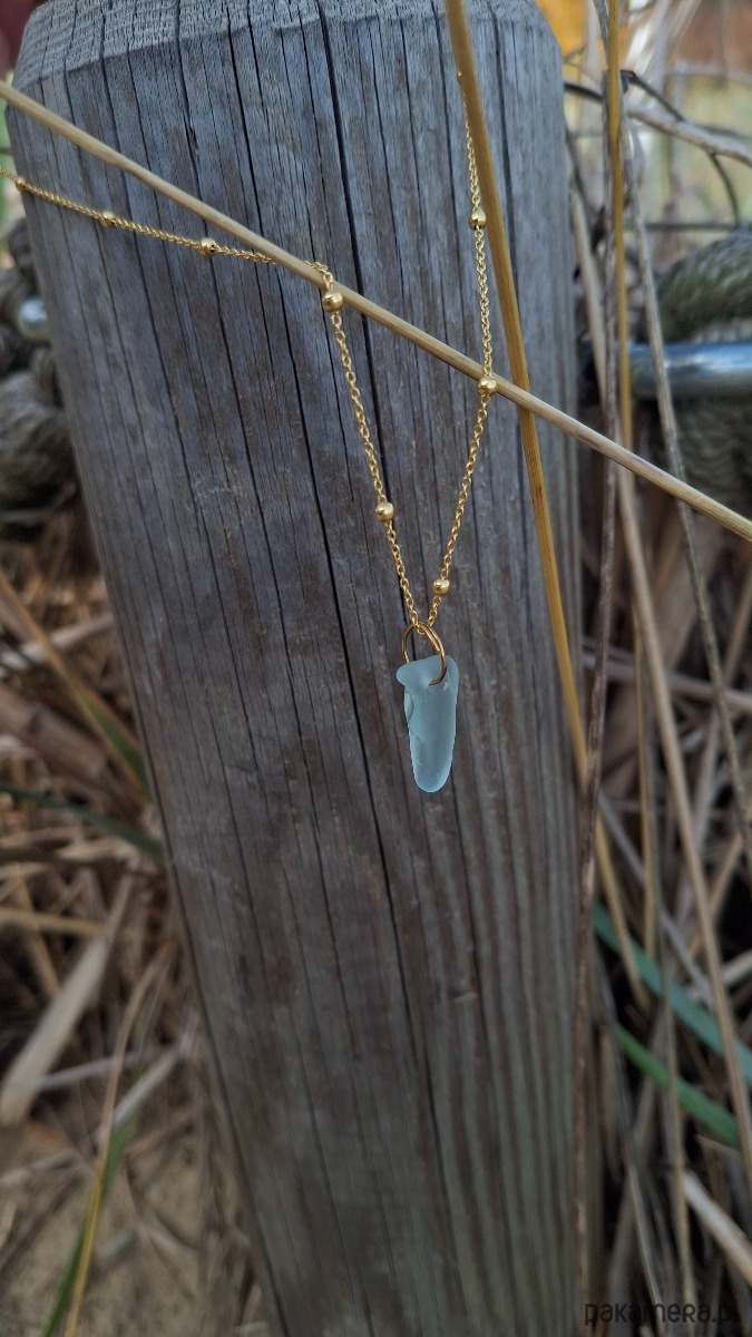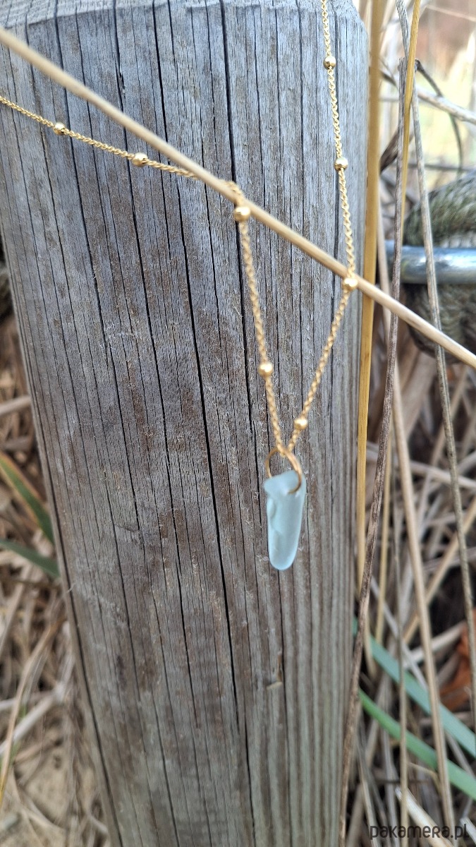 Deliktny łańcuszek wykonany ze srebra, następnie pozłocony. Elementem ozdobnym jest błękitne szkło morskie zebrane na bałtyckiej plaży.