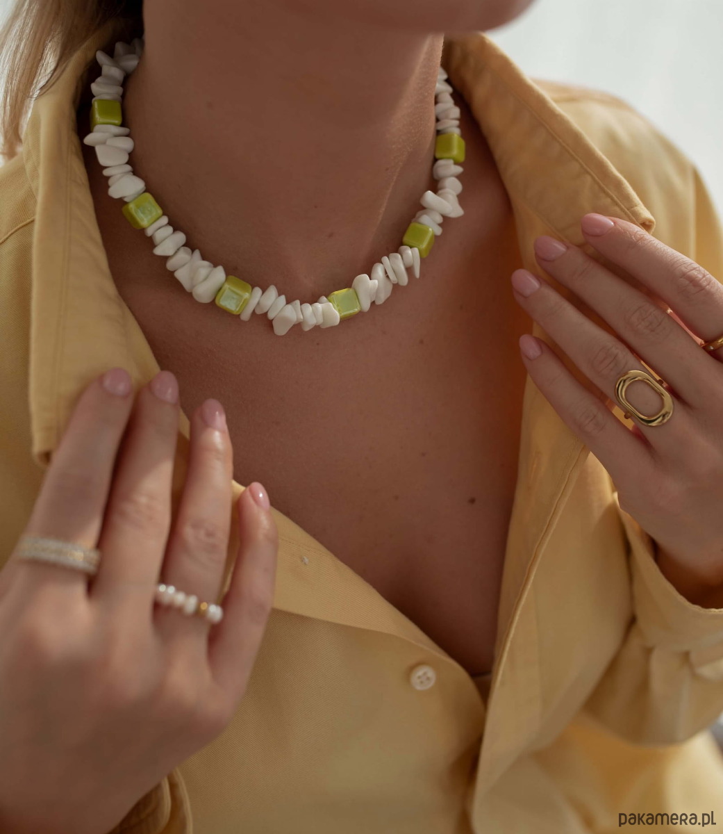 Kochasz biżuterię, która od razu poprawia nastrój? Ten naszyjnik z białego agatu z dodatkiem limonkowych kostek to czysta energia zamknięta w naturalnych kamieniach.