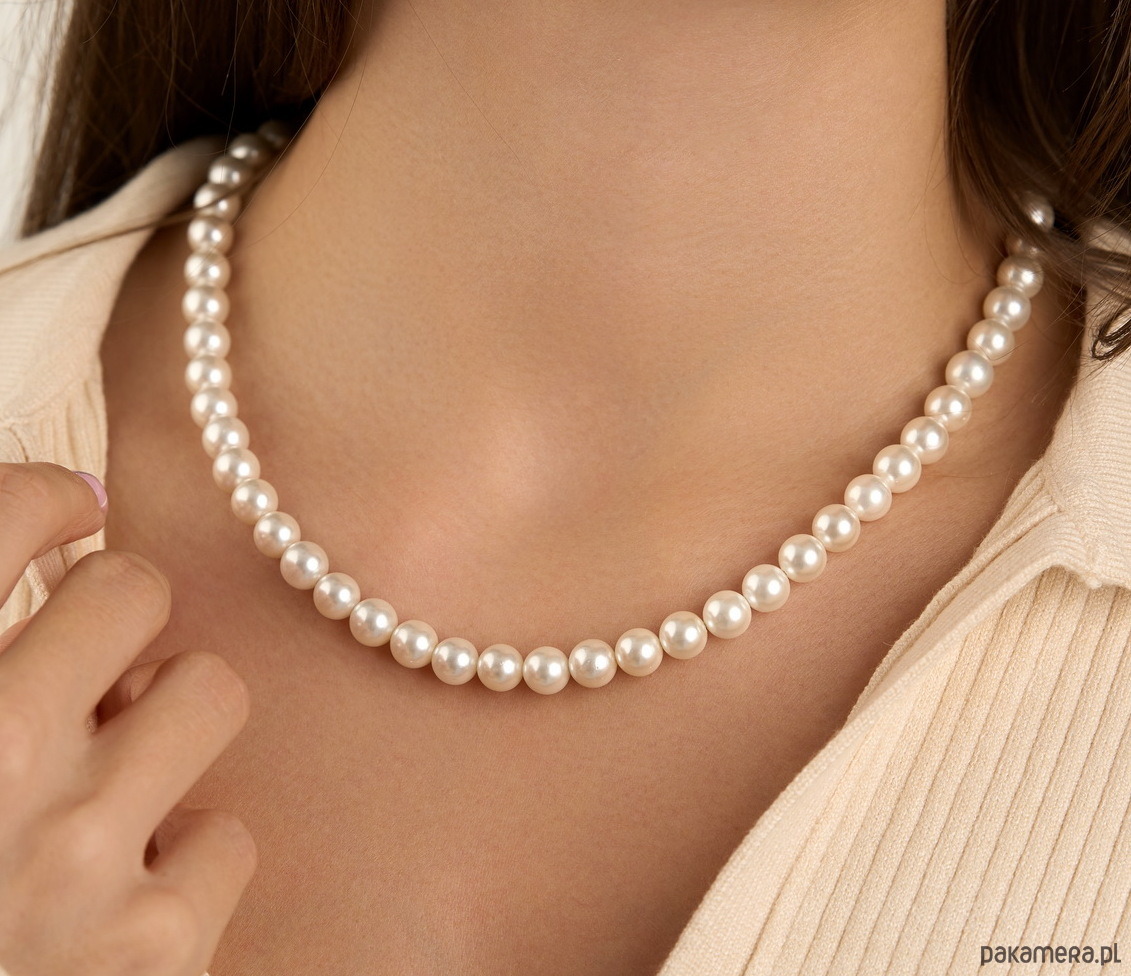 Gładkie, starannie dobrane perły tworzą harmonijną całość, która subtelnie podkreśla dekolt i dodaje stylizacji wyrafinowanego charakteru.