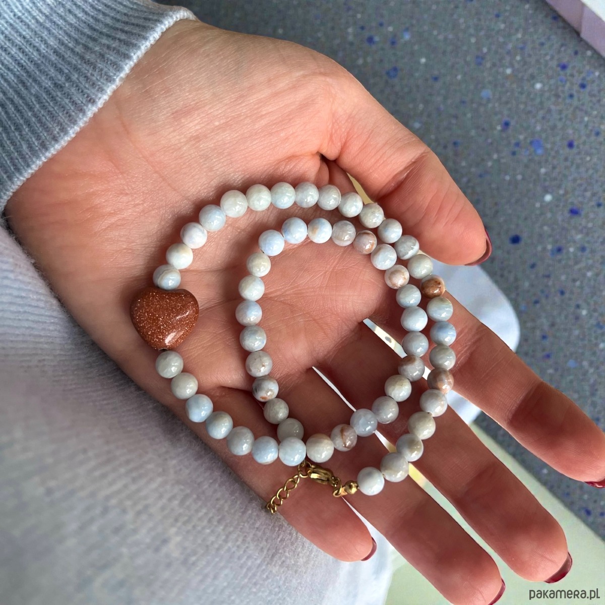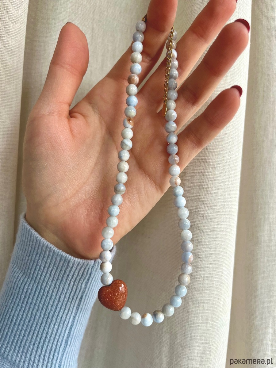 Został wykonany z okrągłych jasno błękitnych jadeitów, serduszko to piasek pustyni.