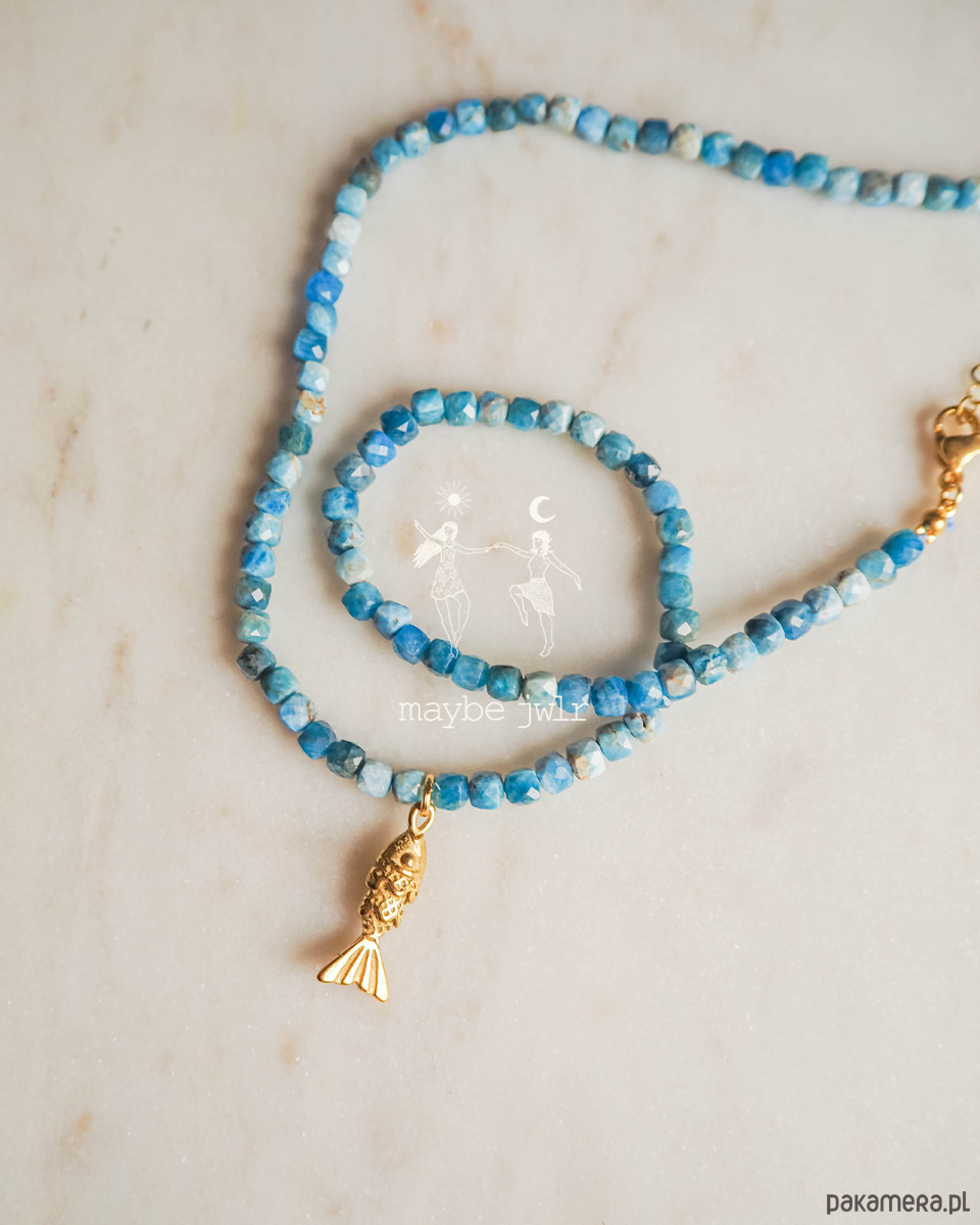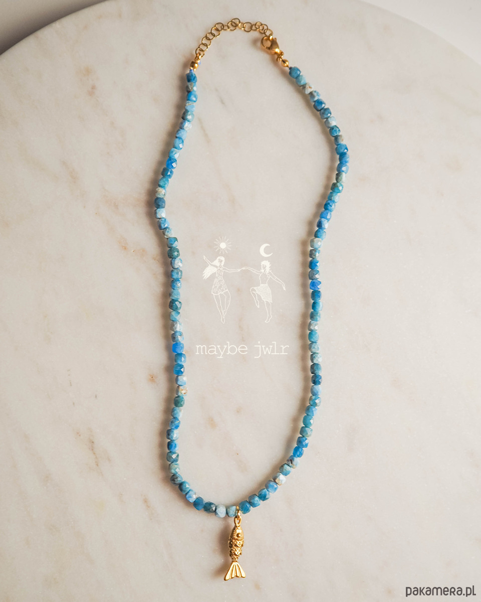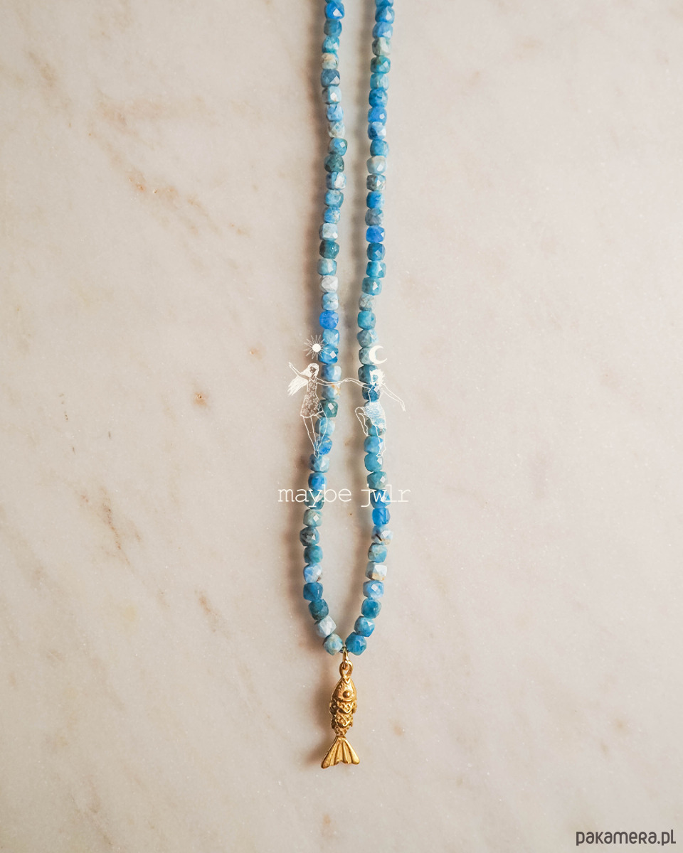 Naszyjnik został zrobiony ręcznie z kamieni apatyt w pięknym niebieskim odcieniu, a całość jest zwieńczona delikatną zawieszką w kształcie rybki o wielkości ok 20x6mm.