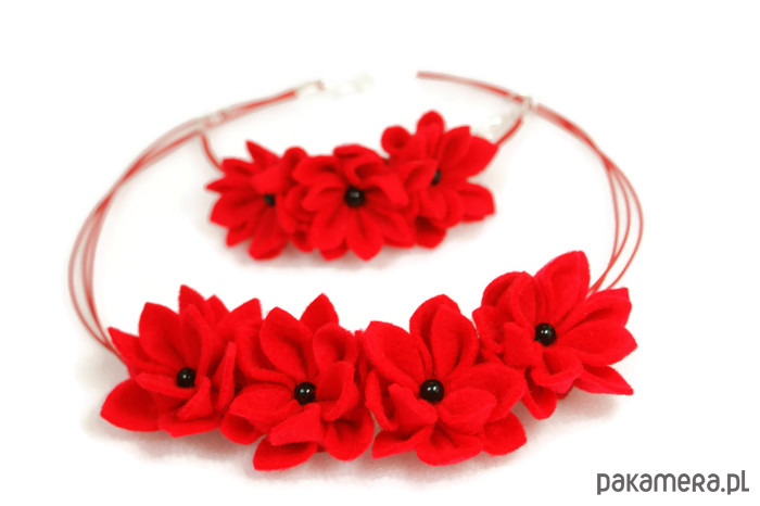 Oryginalny komplet: naszyjnik i bransoletka wykonane z ręcznie robionych kwiatów z filcu,