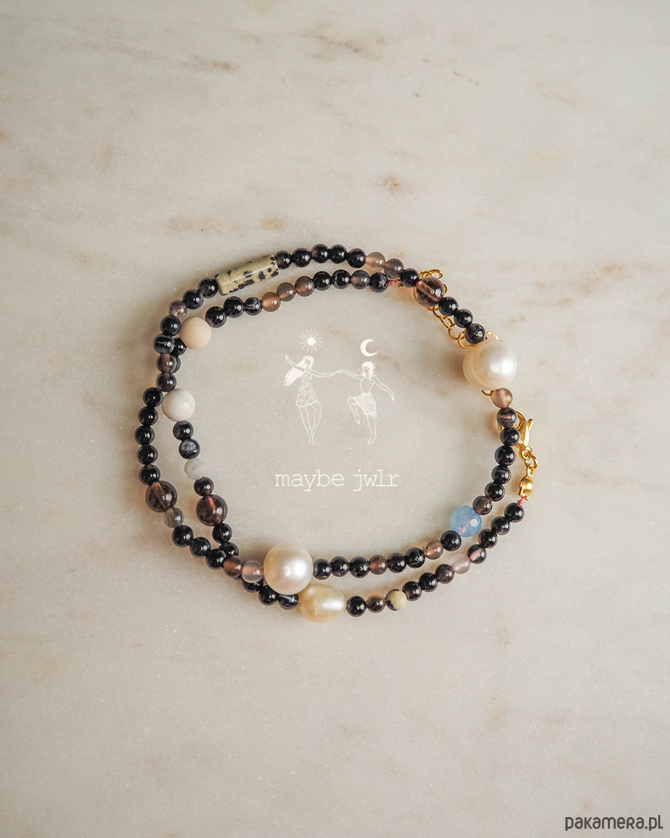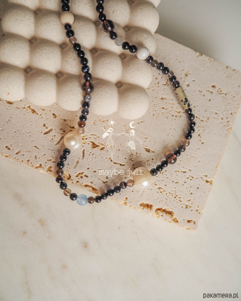 Naszyjnik jest przeplatany kamieniami o różnej wielkości : perła, jaspis dalmatyński, howlit, kamień rzeczny, jadeit, kwarc dymny,.