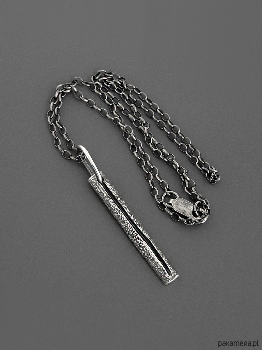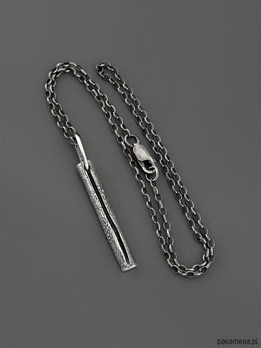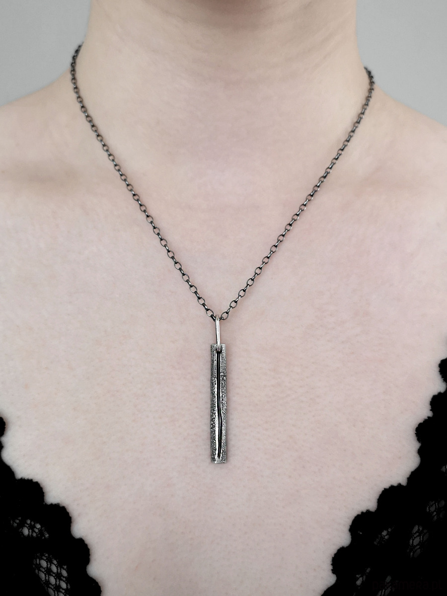 Unikatowy naszyjnik z patynowaną czarną linią biegnącą po środku. Wykonany ze srebra 925 z unikatową flamowaną fakturą.
