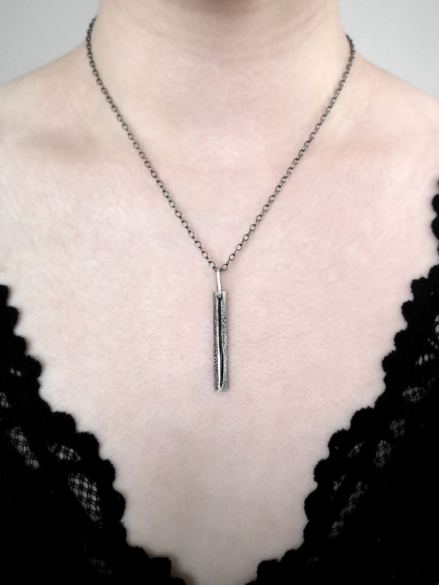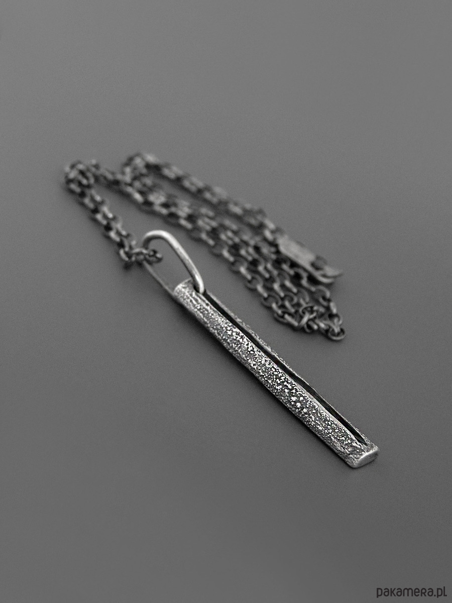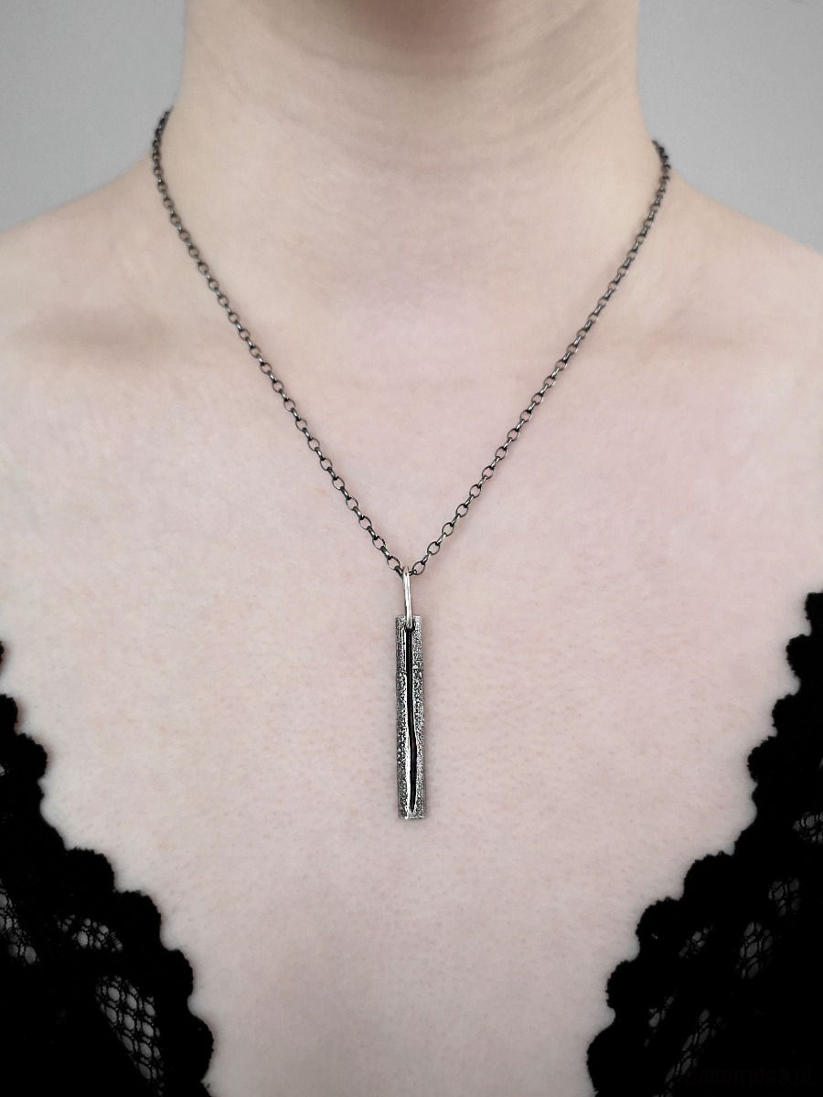 Unikatowy naszyjnik z patynowaną czarną linią biegnącą po środku. Wykonany ze srebra 925 z unikatową flamowaną fakturą.