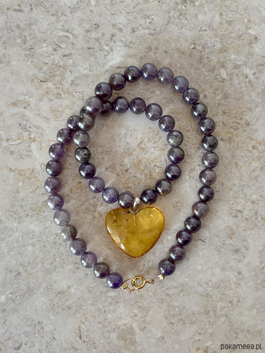 Naturalne ametysty o delikatnej, perłowej poświacie zestawione zostały z bałtyckim bursztynem, którego kształt został ręcznie wydobyty z jednego kawałka kamienia. Jego forma subtelnie nawiązuje do serca — bez dosłowności i symetrii.