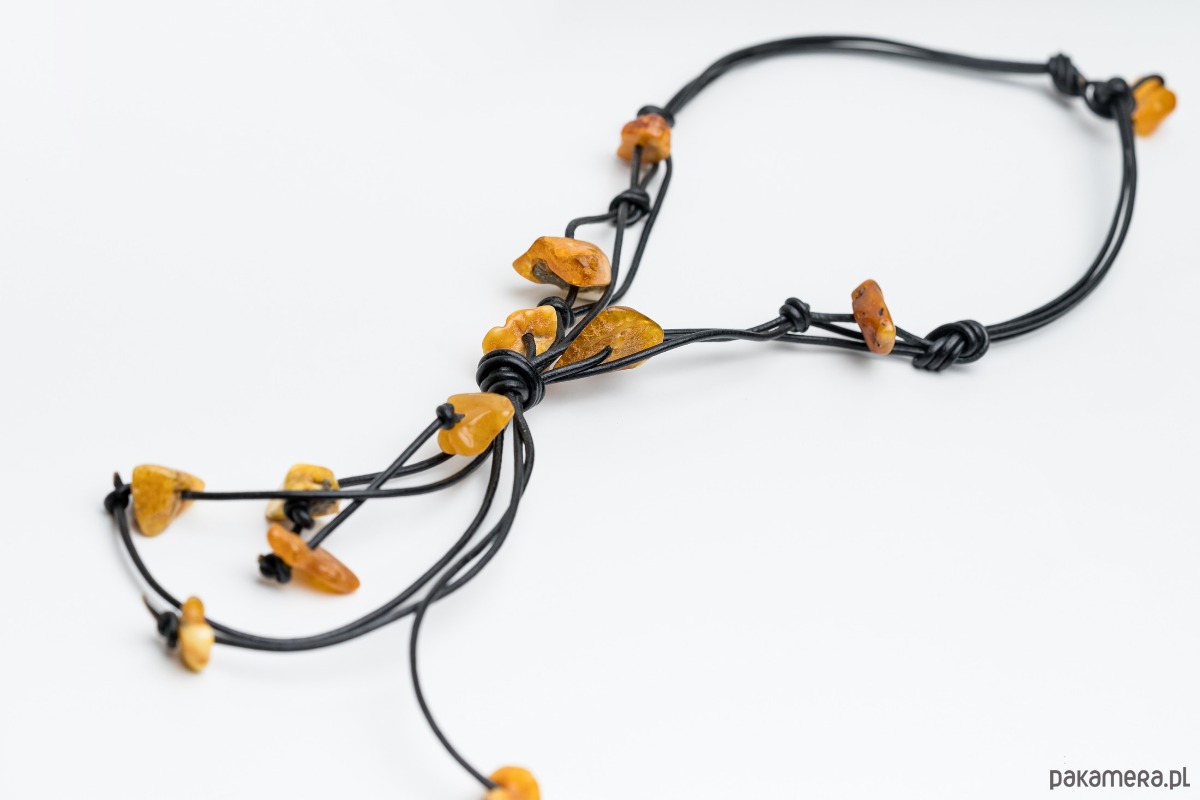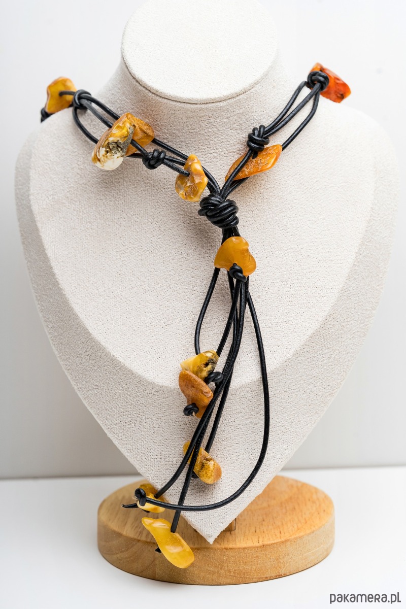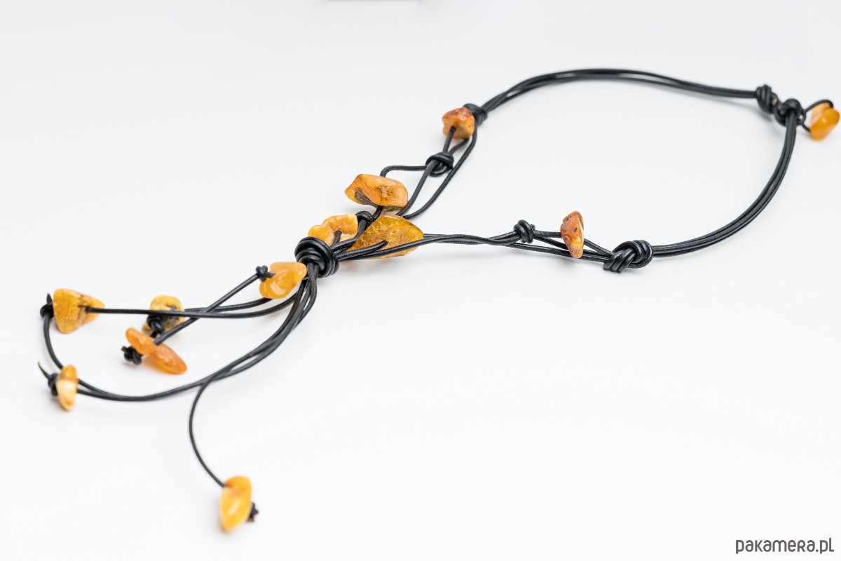Naszyjnik został wykonany z naturalnego bursztynu bałtyckiego w odcieniu pomarańczowym. Surowe bursztyny zostały zamocowane na brązowym rzemieniu. Zapięcie bursztynowe typu toggle.
