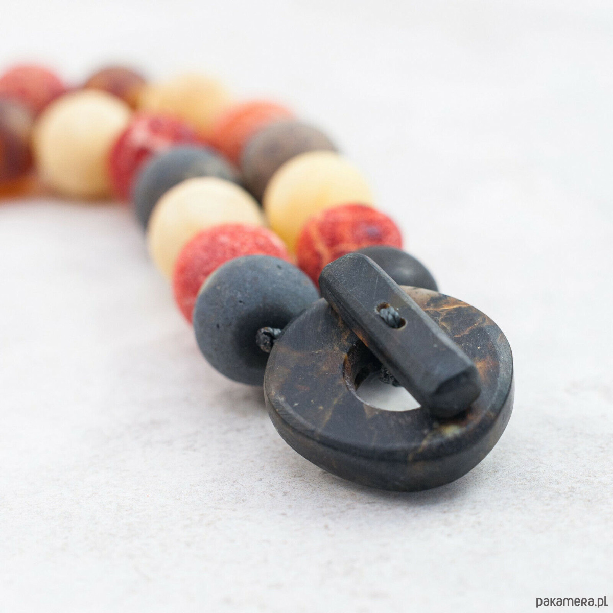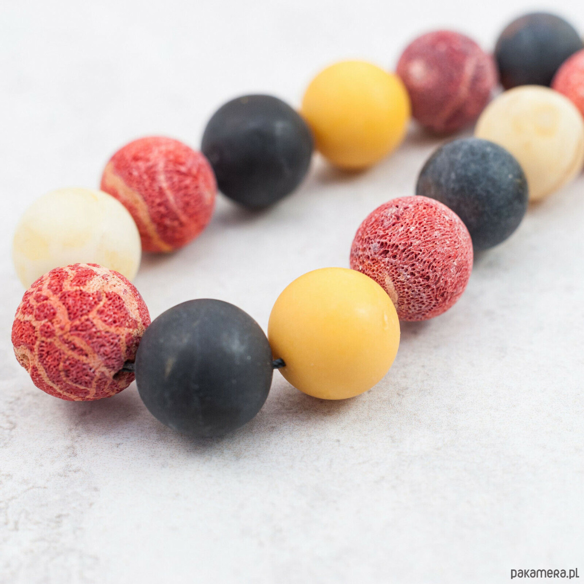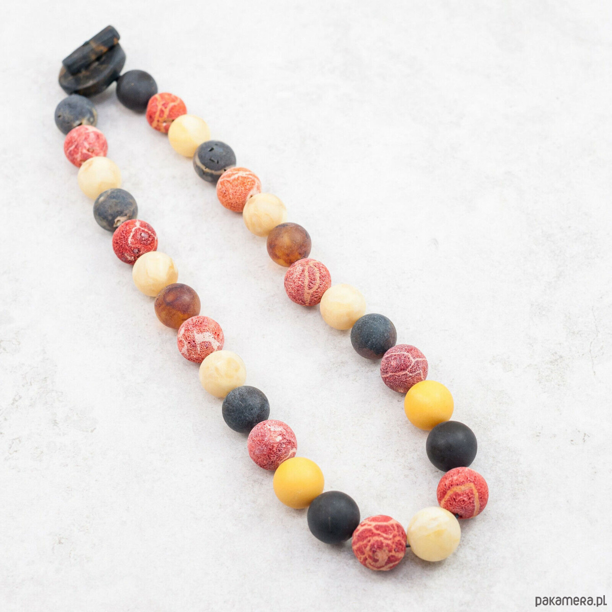 Naszyjnik składa się z regularnych, okrągłych kul bursztynu w kolorach czarnym, żółtym i białym oraz naturalnych, czerwonych korali, które zostały harmonijnie wkomponowane, tworząc niepowtarzalny efekt. Surowa, matowa faktura bursztynu i korala dodaje kompozycji autentyczności i subtelnej surowości. Każdy kamień jest wyjątkowy — jego struktura, odcień i faktura mogą nieco różnić się od przedstawionych zdjęć, co podkreśla niepowtarzalność produktu.