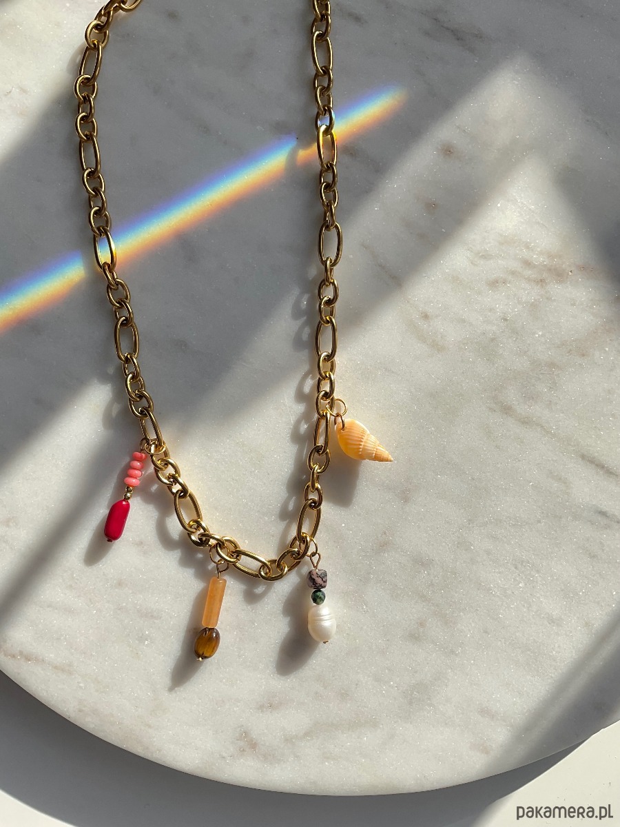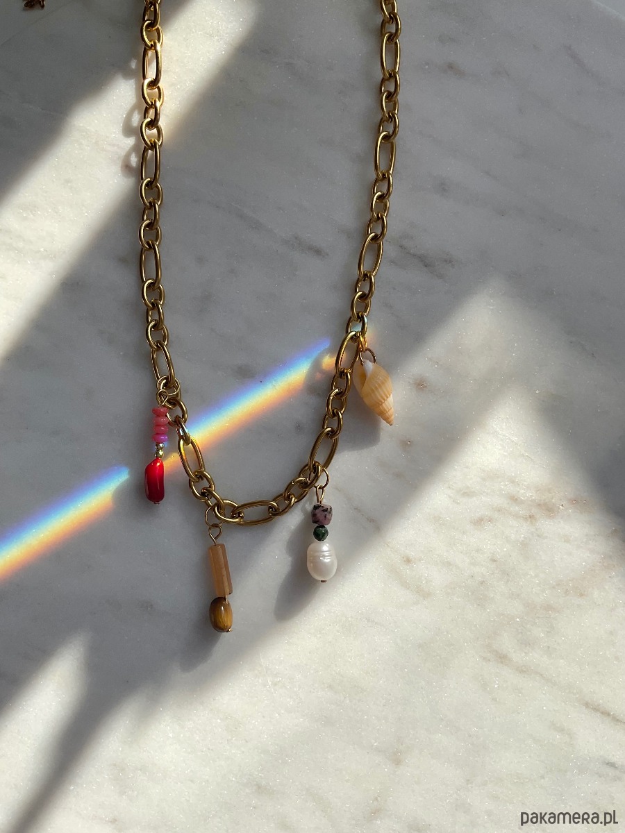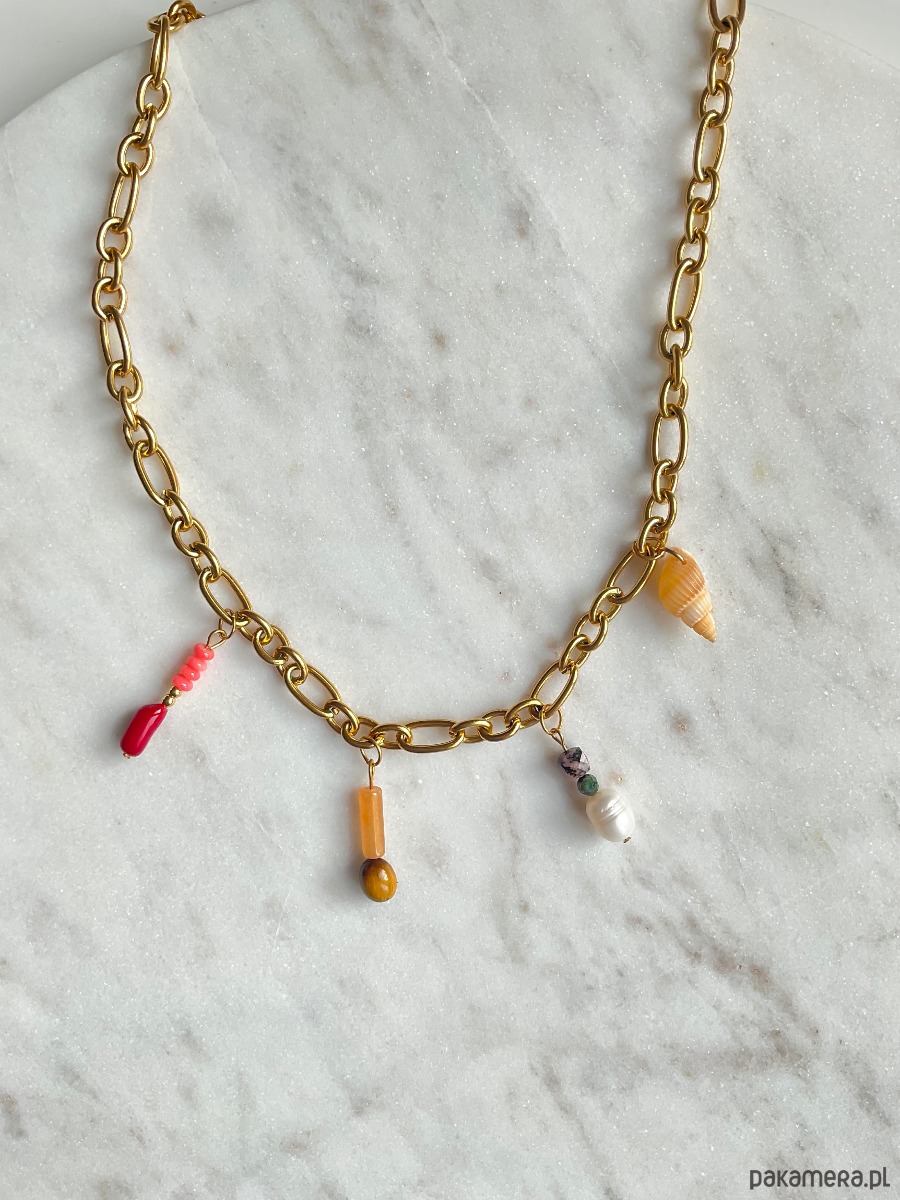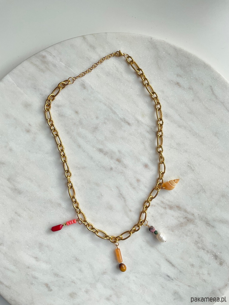 Naszyjnik z ręcznie robionymi charmsami na grubym łańcuchu o mieszanych ogniwach.