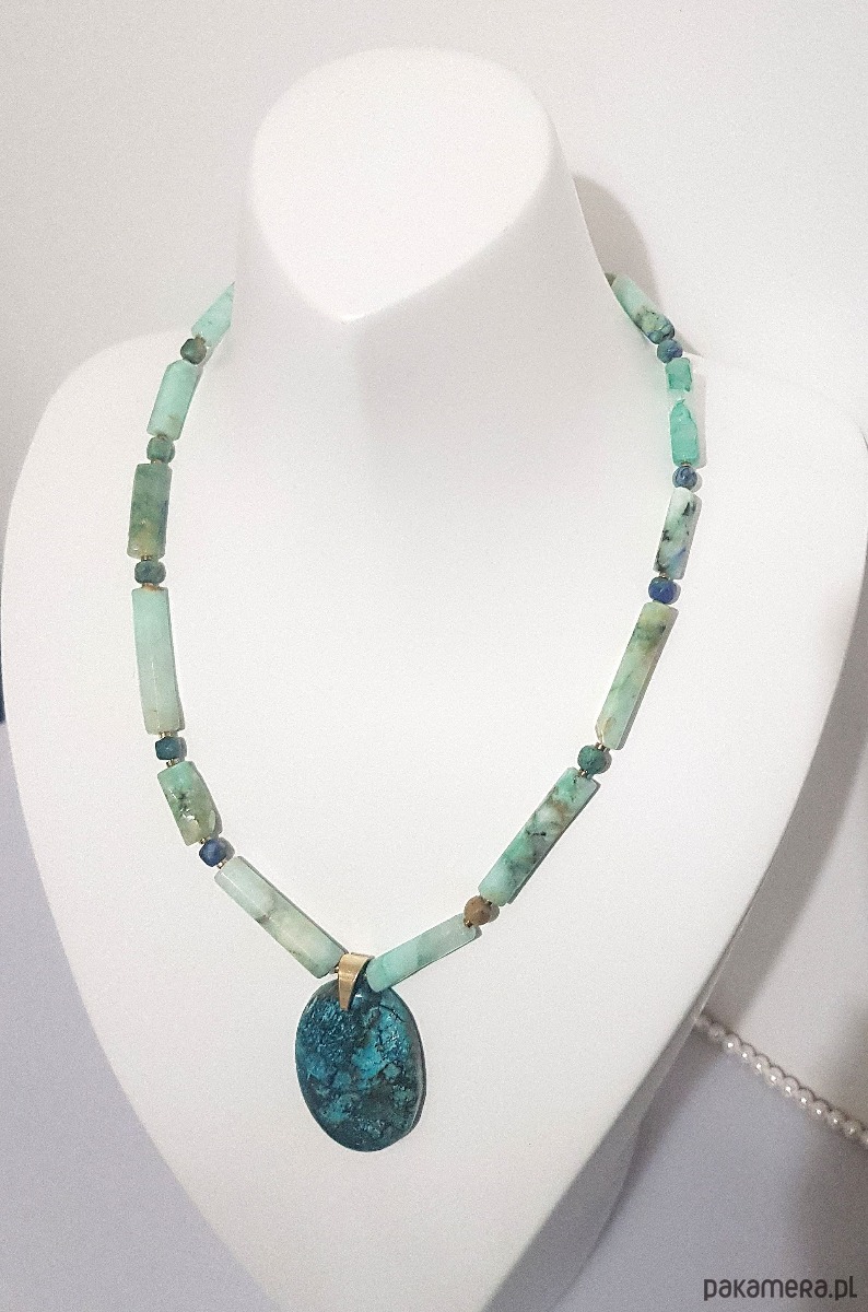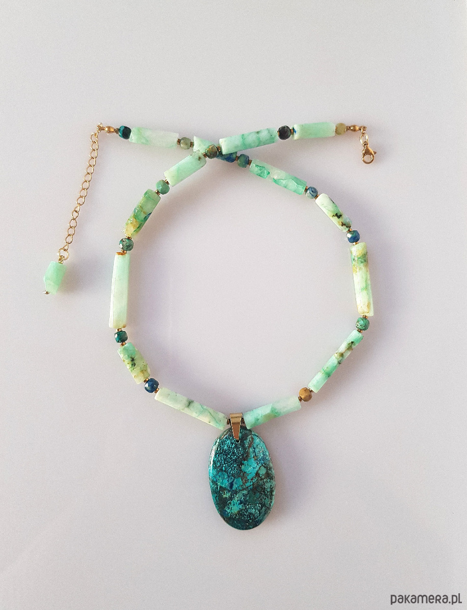 Wyrazisty, elegancki naszyjnik z zachwycającej chryzokoli w różnych kolorach i kształtach.