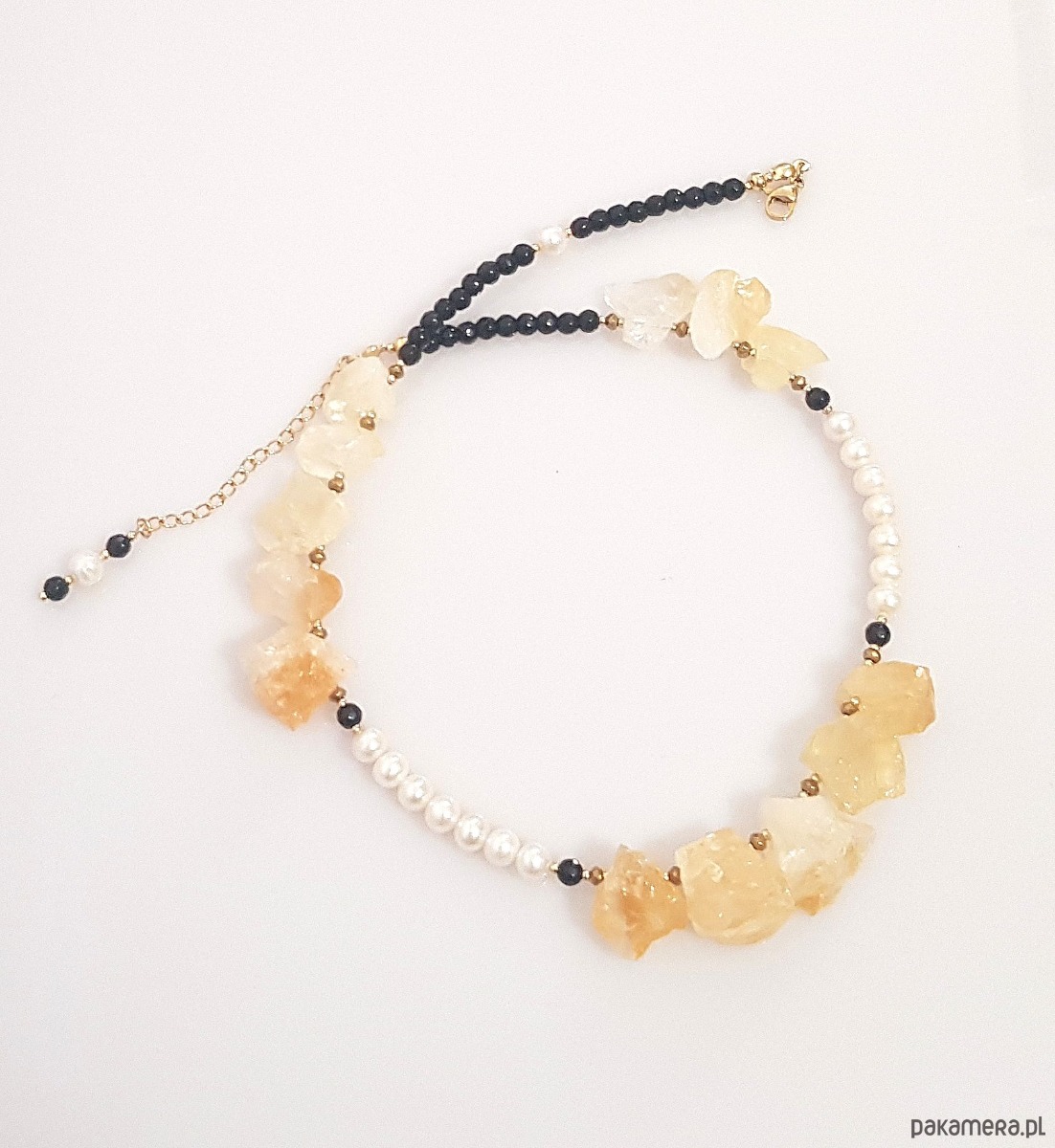 Zapleciony z surowych bryłek cytrynu, fasetowanych kulek jadeitu i perełek hodowlanych.