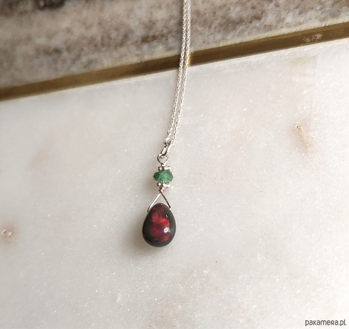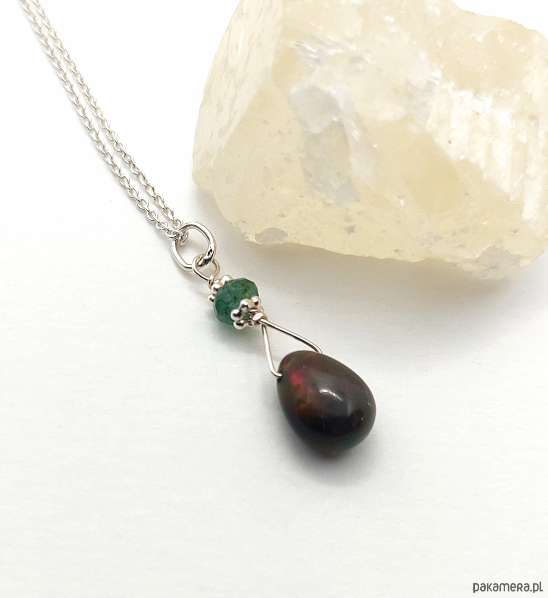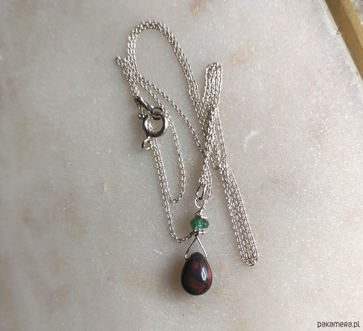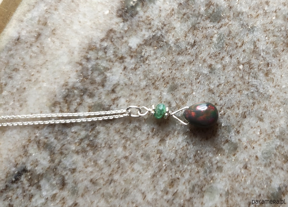 Naszyjnik dla wielbicieli kamieni z bogatym życiem wewnętrznym. Na delikatnym łańcuszku znajduje się zawieszka z intensywnym szmaragdem i dopasowanym kolorystycznie czarnym opalem. Opal w zależności od kąta padania światła ukazuje swoje czarujące wnętrze iskrzące zielenią i czerwienią. Delikatniej połyskuje barwa żółta i niebieska. Opal jest idealnym kamieniem w naszym klimacie, gdyż najpiękniejsze kolory ukazuje przy świetle łagodnym, padającym z boku. W słońcu jest matowy, wtedy z kolei swoją moc pokazuje szmaragd.