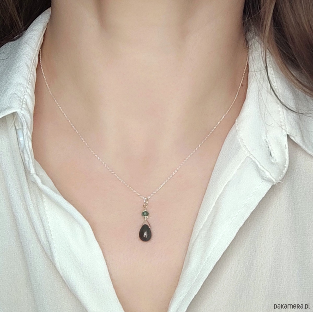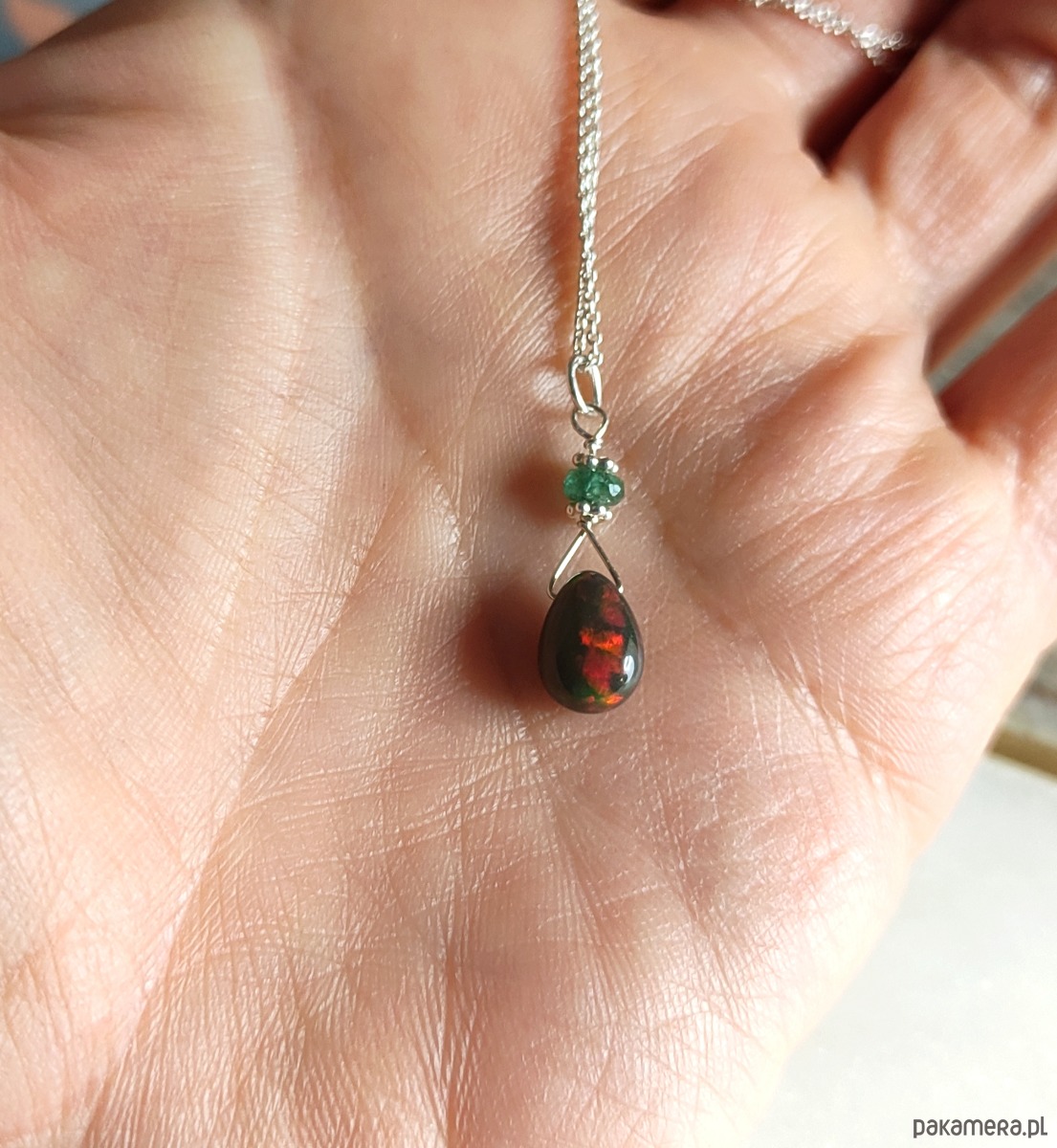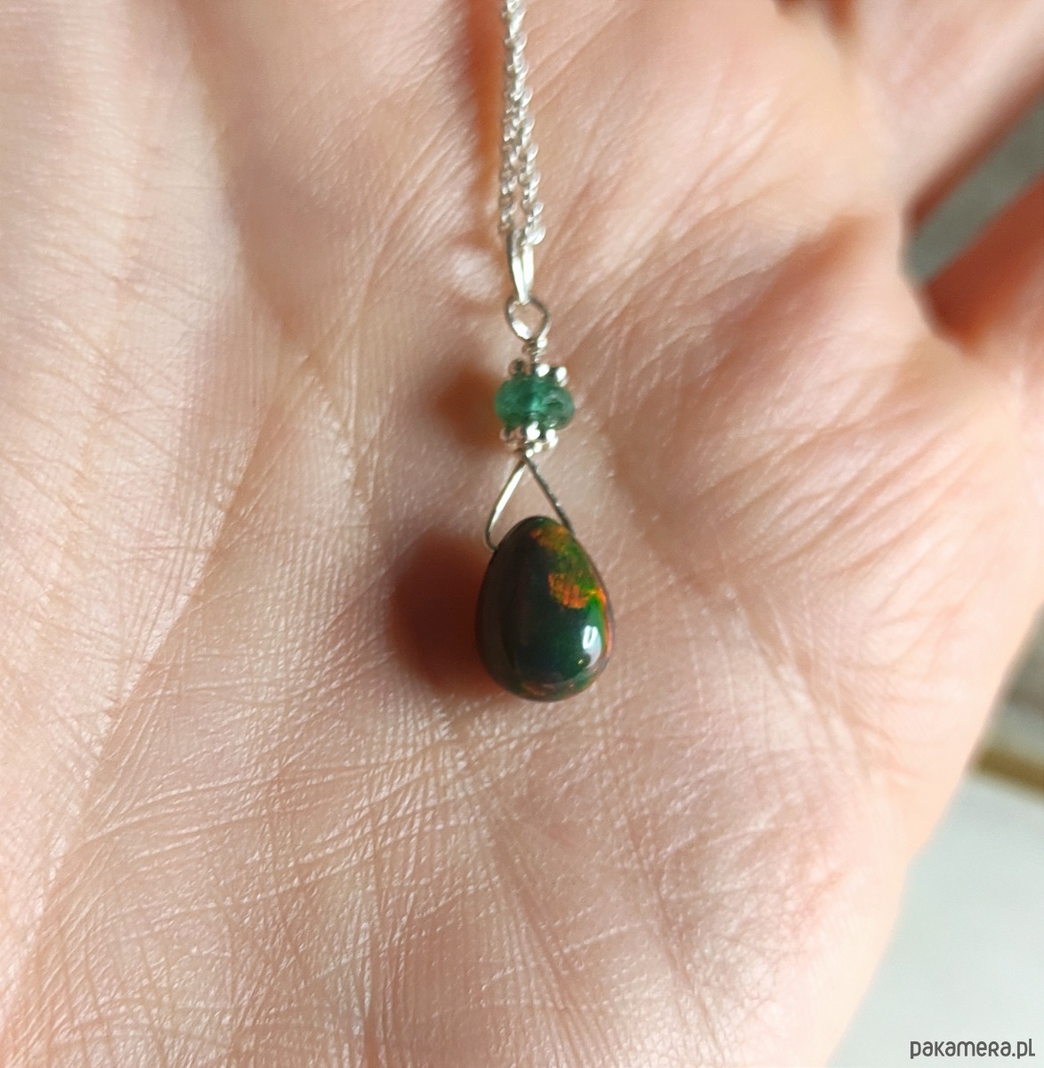 Naszyjnik dla wielbicieli kamieni z bogatym życiem wewnętrznym. Na delikatnym łańcuszku znajduje się zawieszka z intensywnym szmaragdem i dopasowanym kolorystycznie czarnym opalem. Opal w zależności od kąta padania światła ukazuje swoje czarujące wnętrze iskrzące zielenią i czerwienią. Delikatniej połyskuje barwa żółta i niebieska. Opal jest idealnym kamieniem w naszym klimacie, gdyż najpiękniejsze kolory ukazuje przy świetle łagodnym, padającym z boku. W słońcu jest matowy, wtedy z kolei swoją moc pokazuje szmaragd.
