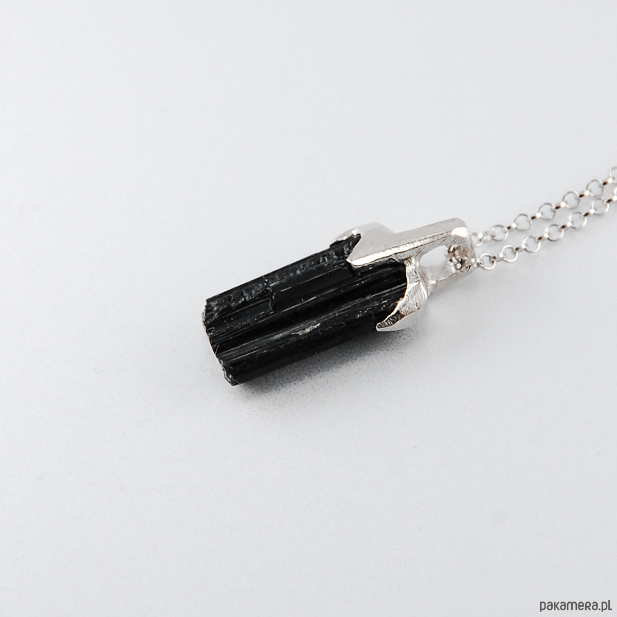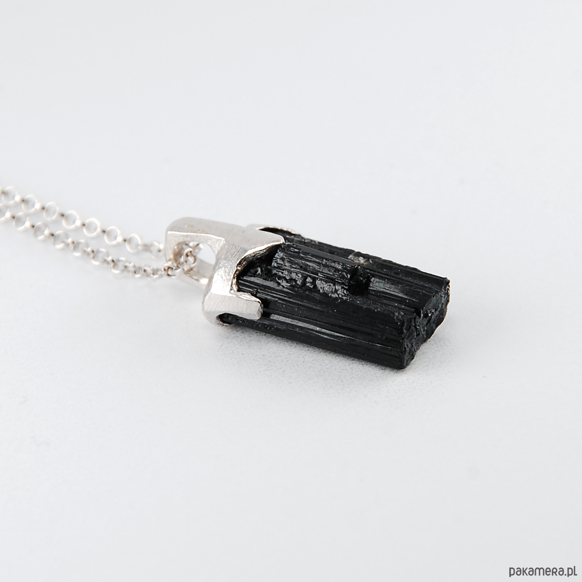 Naszyjnik wykonany z unikatowej bryłki czarnego turmalinu oprawionego w srebro.