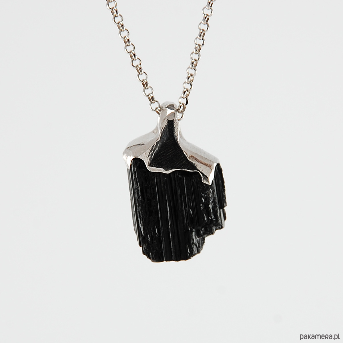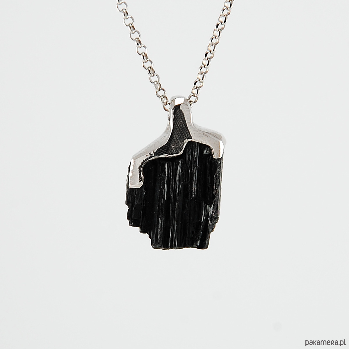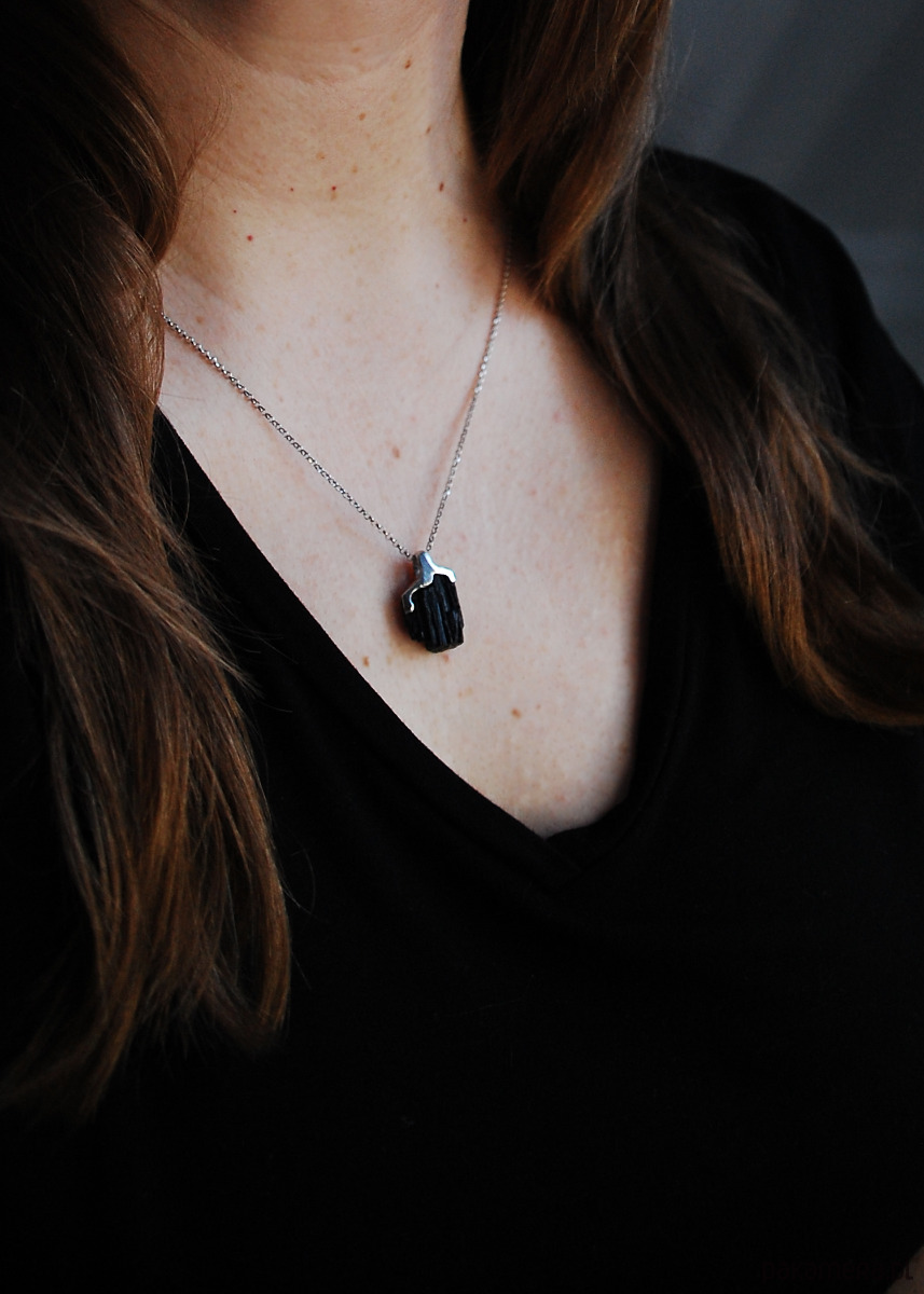 Naszyjnik wykonany z unikatowej bryłki czarnego turmalinu oprawionego w srebro.