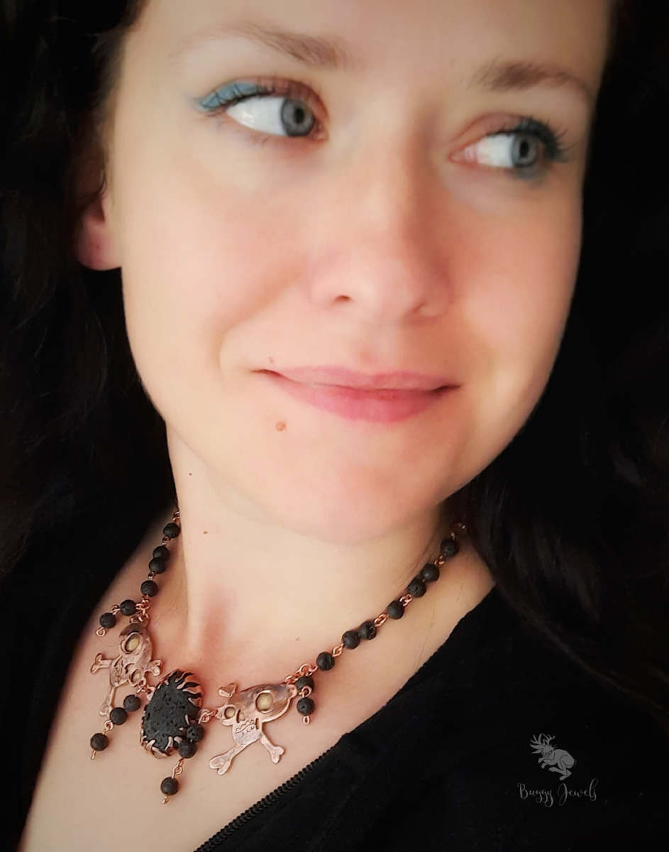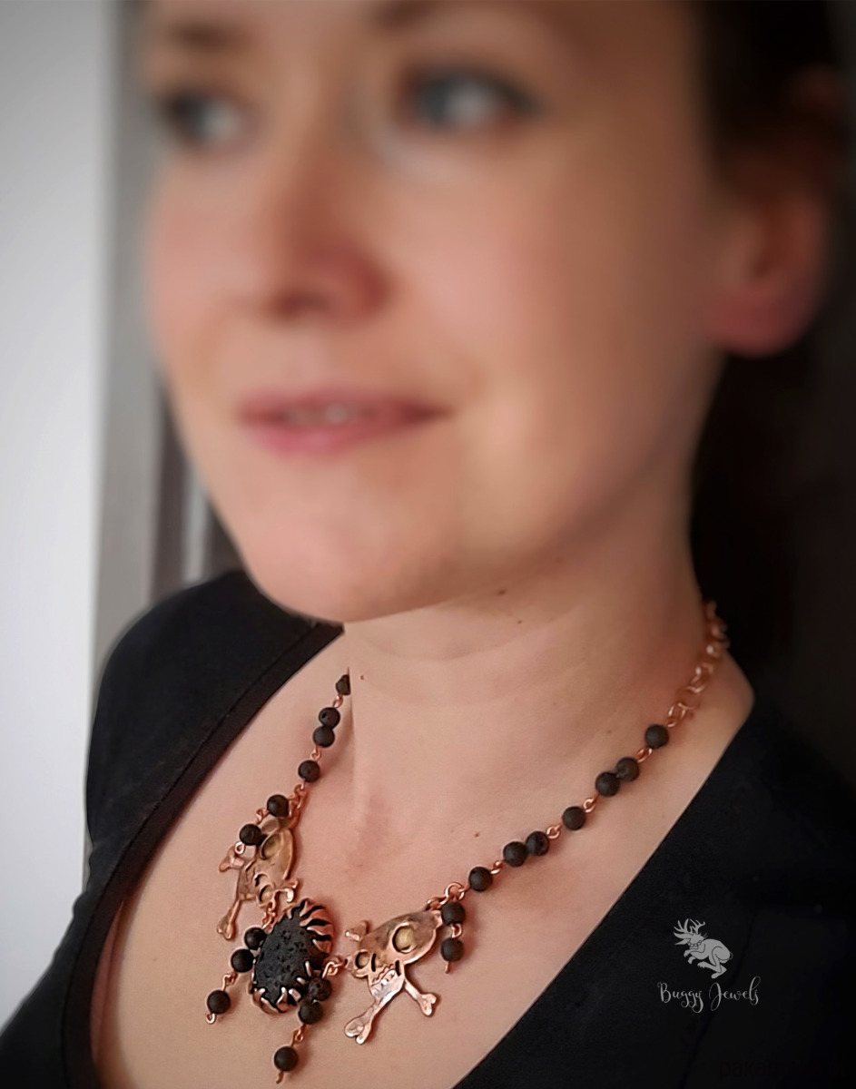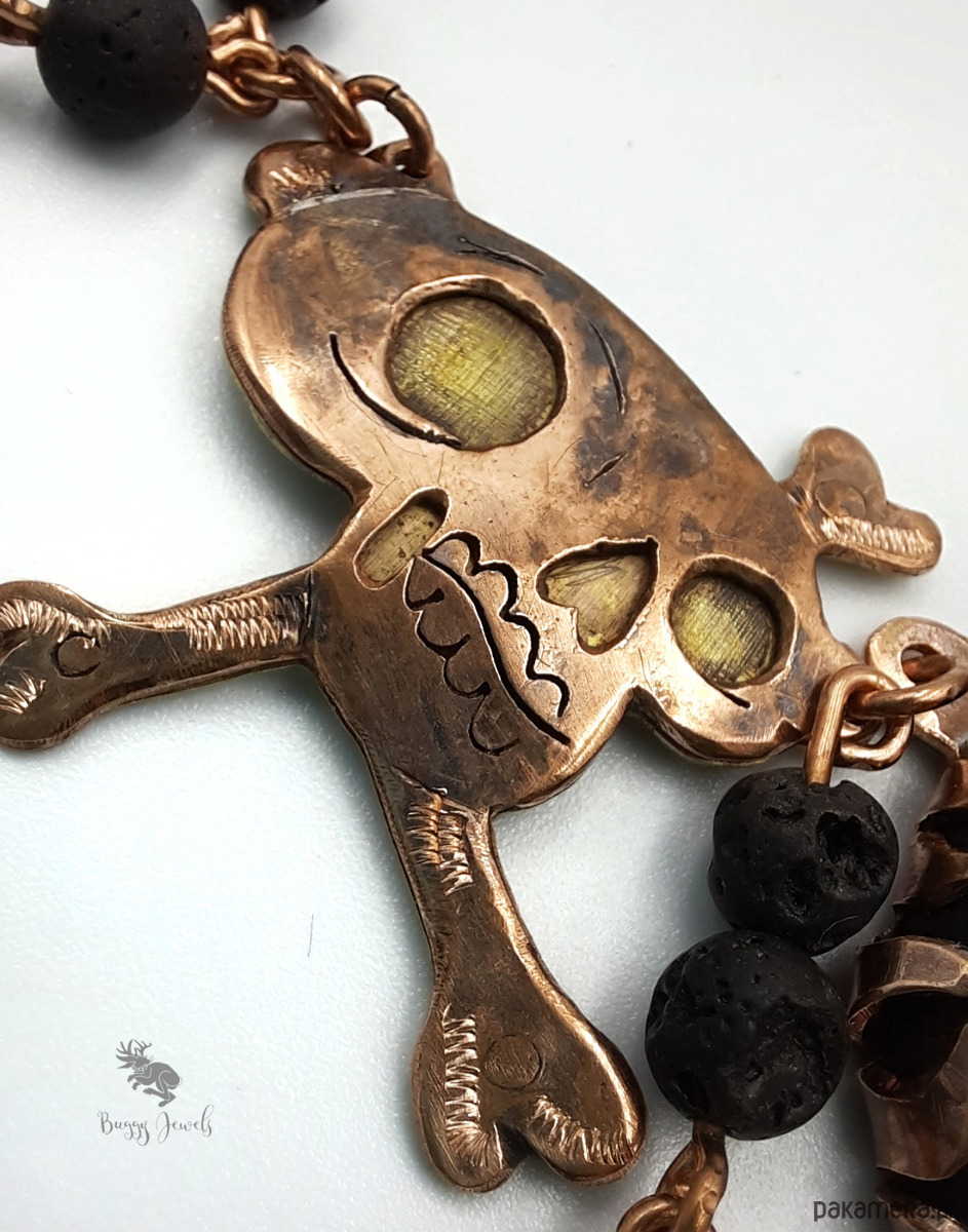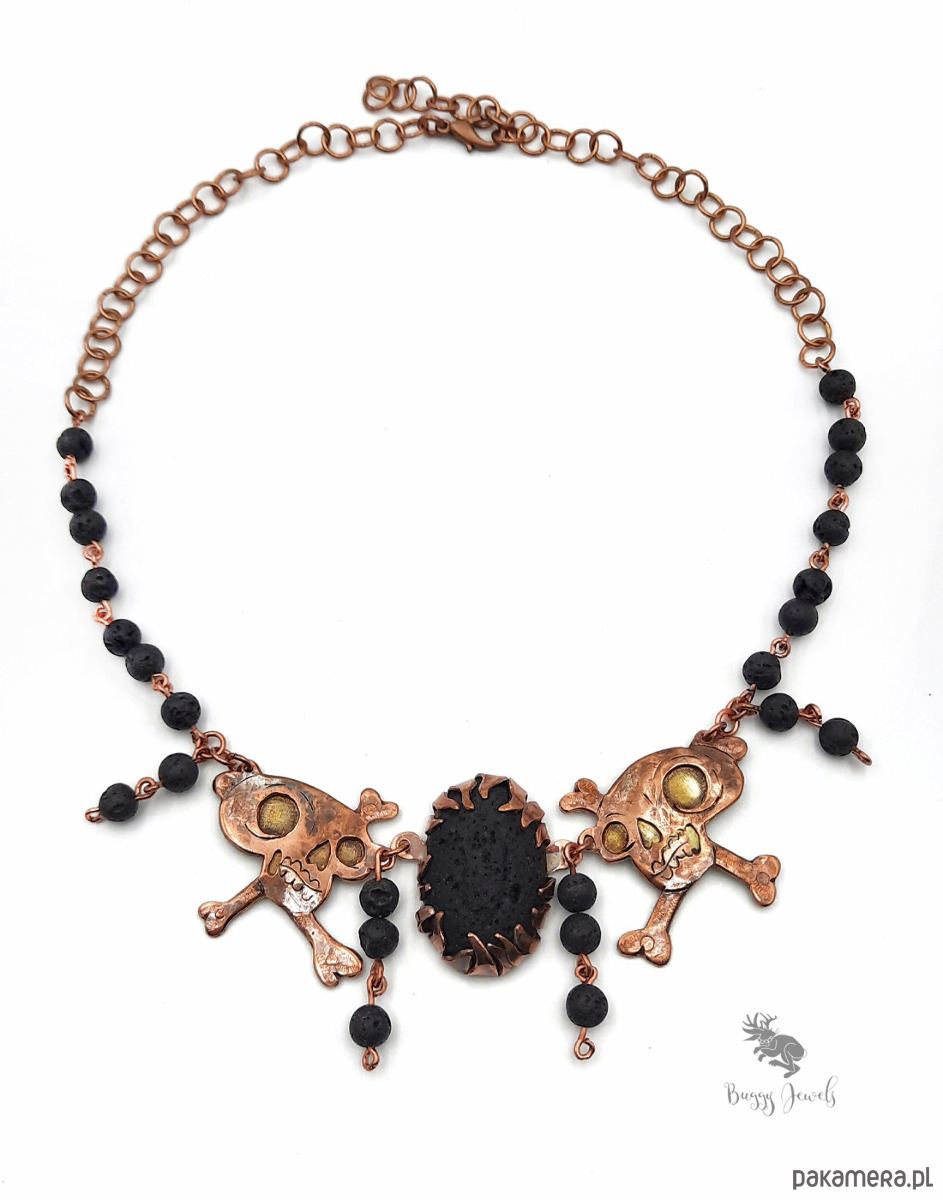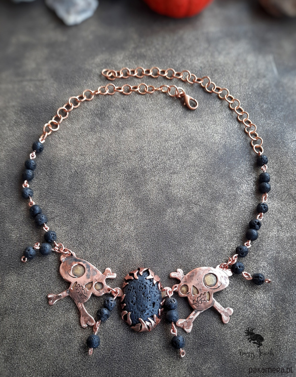 Czaszki dodatkowo zostały połączone za pomocą nitowania z mosiądzem w celu uzyskania kontrastu i wyrazistości oraz lekko wyoblone. Naszyjnik posiada także koraliki z lawy wulkanicznej, które dodają naszyjnikowi wyrazu tajemniczości a zarazem lekkości.