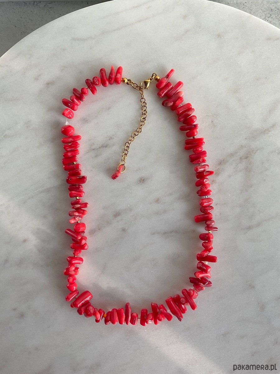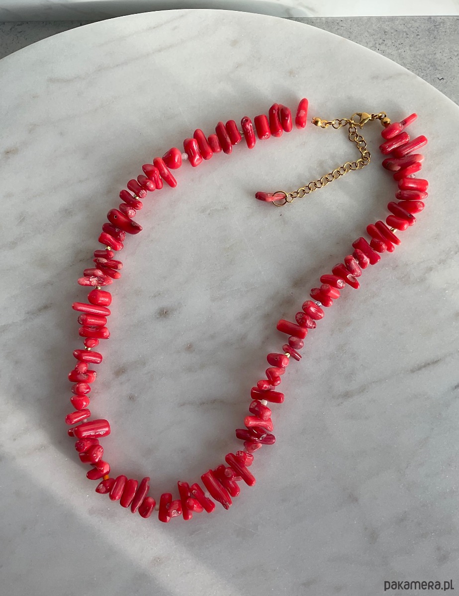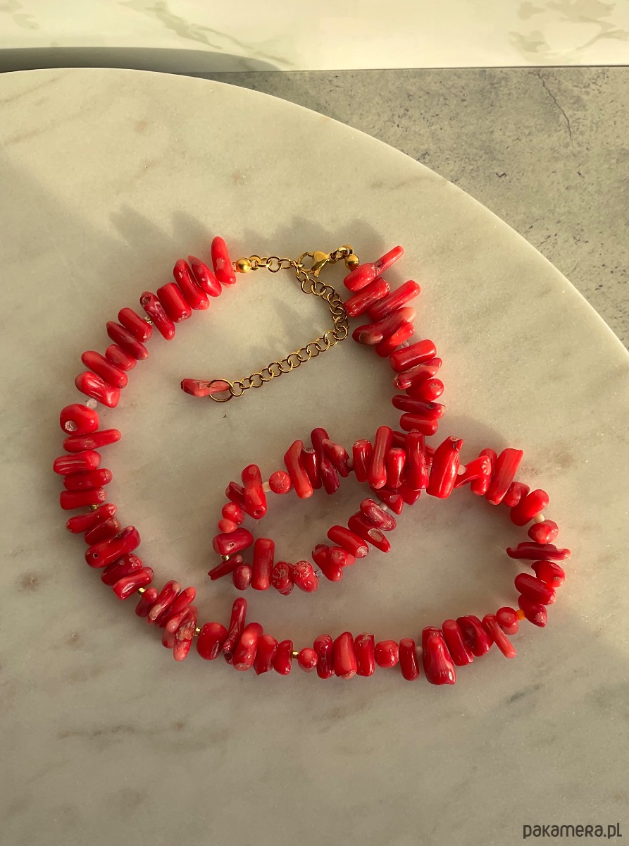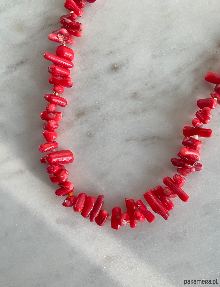 Naszyjnik z czerwonego koralu naturalnego o nieregularnym kształcie, przeplatany drobnymi koralikami.